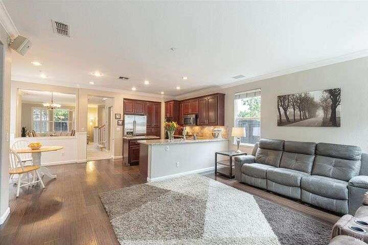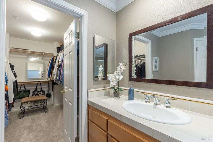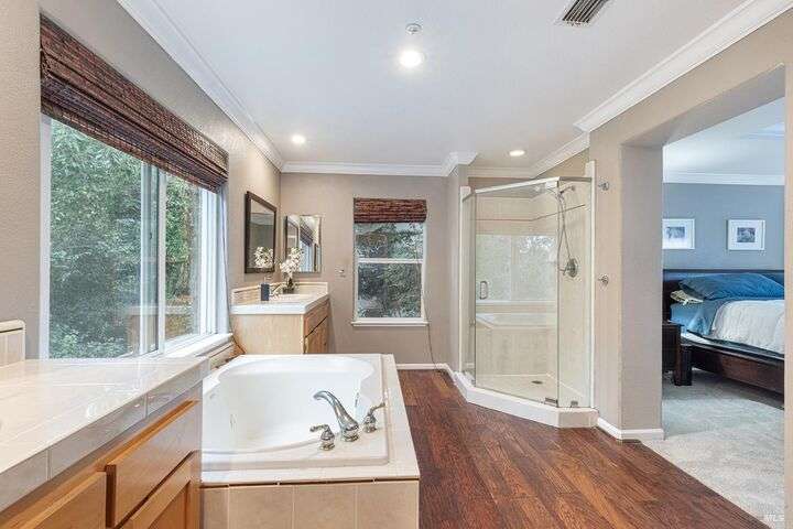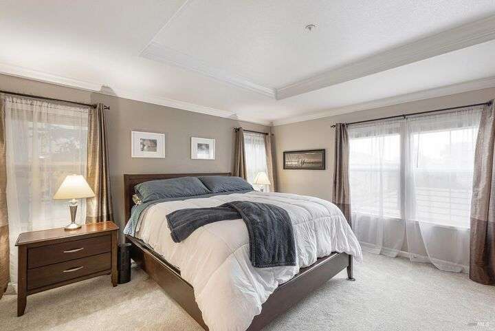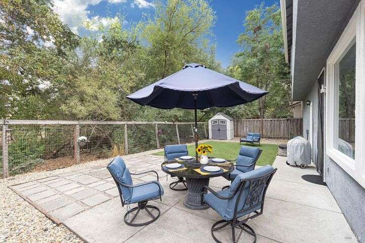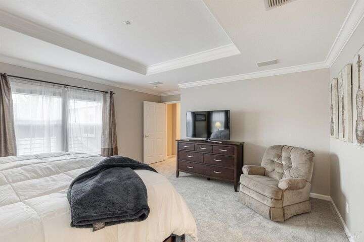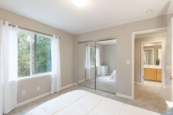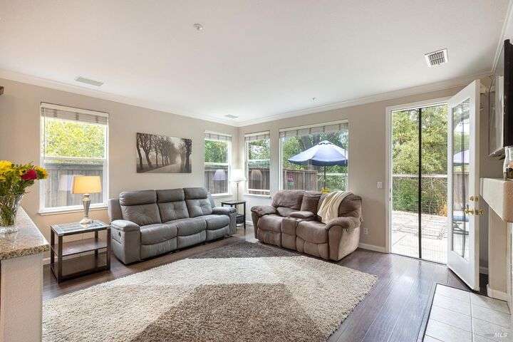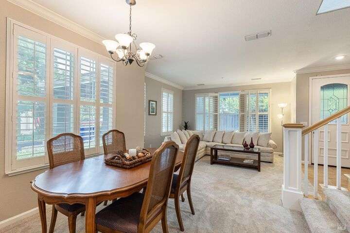Set on a quiet lane shared with just one neighbor, this home offers both privacy and convenience. Inside, enjoy fresh paint, new carpet, and elegant details like crown molding, wainscoting, and custom shutters. The updated kitchen features pull-out shelving, while the spacious primary suite with tray ceiling provides a relaxing retreat. A built-in office nook adds flexibility for work or study. Outside, the backyard is bordered by a private, serene creek-perfect for peaceful outdoor living. Close to schools, shopping, and medical facilities, this home blends comfort, style, and the best of Napa Valley living.