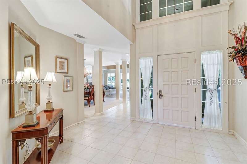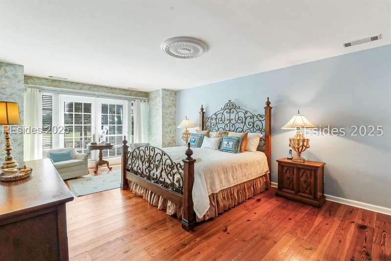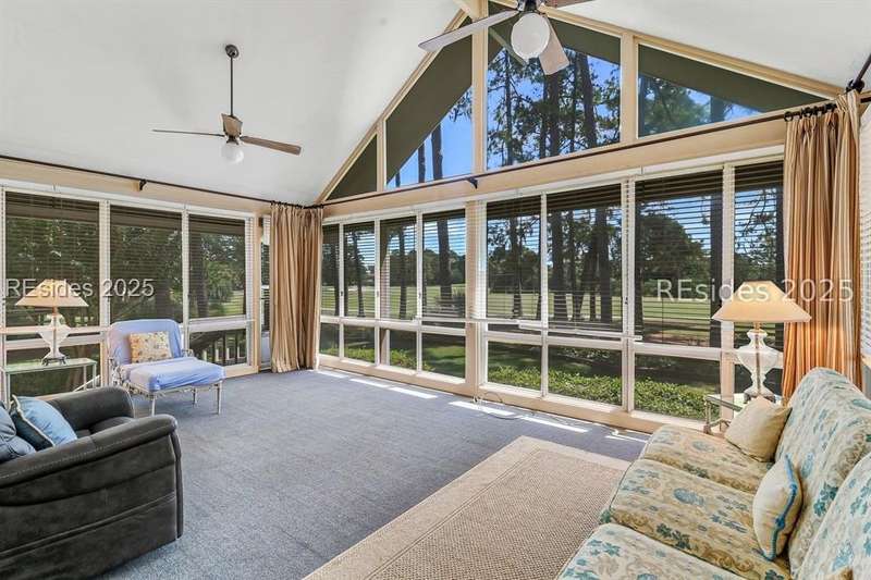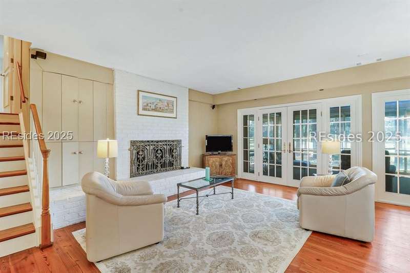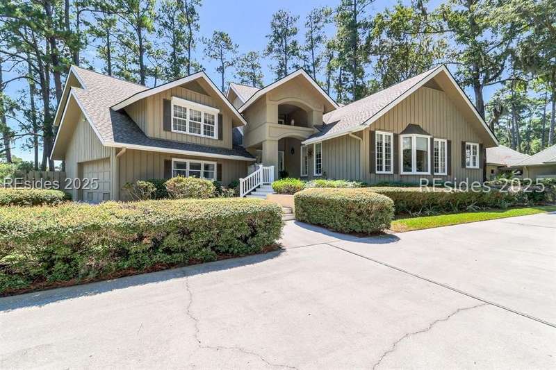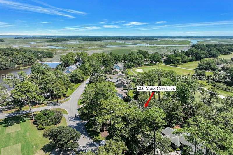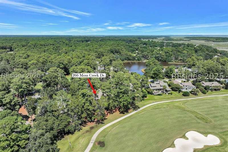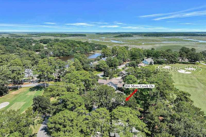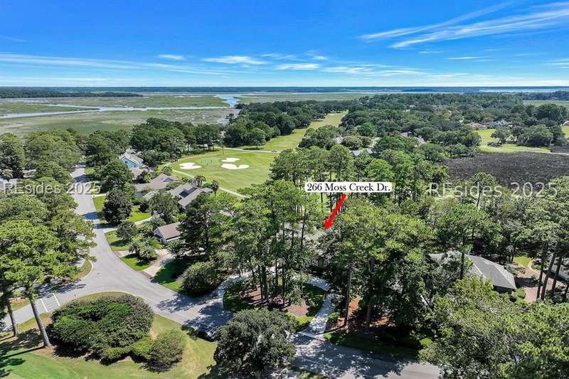 Premium location and exceptional curb appeal combined with multiple golf views make this one of the more desirable locations in Moss Creek. A custom design with an inviting two-story foyer leads to formal living and dining rooms, ideal for entertaining. The updated, spacious Kitchen with skylight opens to the cozy family room with floor-to-ceiling brick fireplace and built-in cabinets. 4 bedrooms, 5 1/2 baths plus a Bonus Room and Office offer space for every lifestyle. The primary suite features dual vanities and a private bathing retreat with shower and soaking tub. Spacious laundry room with skylight. A large three-season Carolina Room with expansive wall of windows captures serene, long views of the golf course and nature with the marsh winding through the back nine of the South course. With a new roof in June 2025, two new HVAC units and water heaters in 2023, this home is waiting for an owner to personalize and make this custom floor plan into a gem of 2025. A rare opportunity in one of Moss Creek's most attractive settings makes this must-see.