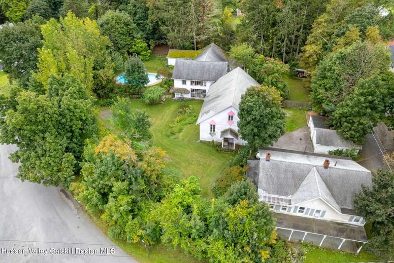 Currently home to a celebrated local artist and musician, this extraordinary reimagined church compound offers a rare opportunity to live, work, and create in a truly one-of-a-kind setting. Encompassing nearly 10,000 square feet across multiple structures, the property blends historic character with modern adaptability, making it an inspired choice for artists, entrepreneurs, and visionary investors. The former dining hall-an impressive 33' x 76' space with soaring ceilings and abundant north-facing light-now serves as a painting studio and includes an eat-in kitchen with a spacious master suite above. The converted church, complete with original stained glass windows from 1897 and choir loft bedroom, offers a 35' x 50' open floor plan currently used as a music room for recording and rehearsal. Outside, beautifully landscaped grounds surround a heated saltwater pool and lush perennial gardens, creating a private oasis. A 2,400-square-foot, three-bedroom farmhouse with master suite, formal dining room, living room, sunroom, full basement, and detached two-car garage adds both versatility and income potential, fronting the property with classic charm. With the appropriate approvals, zoning allows for a wide variety of future uses, including an art gallery, retreat center, bed-and-breakfast or inn, restaurant, retail or antique shop, or health and educational facility. Perfectly located at the epicenter of the Mid-Hudson Valley, the property is close to the NYS Thruway and just minutes from Saugerties Village, the Woodstock Colony of the Arts, Kingston, Rhinebeck, and Hudson, and only 30 minutes to skiing at Hunter Mountain. A truly singular offering, unlike anything else on the market.