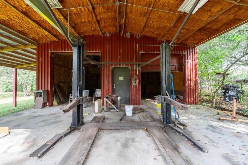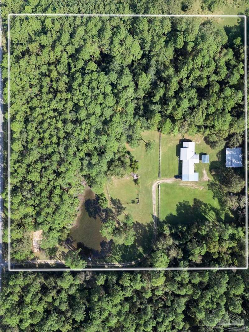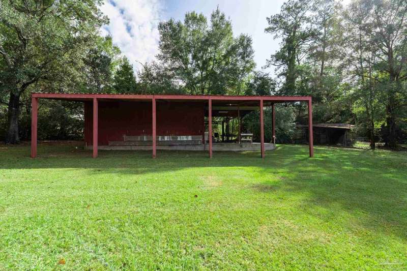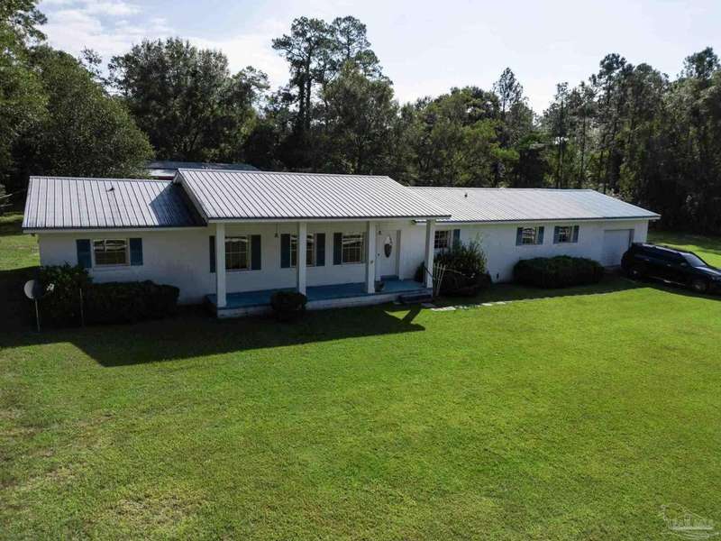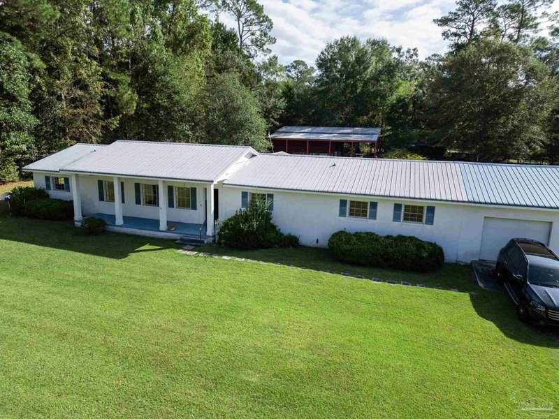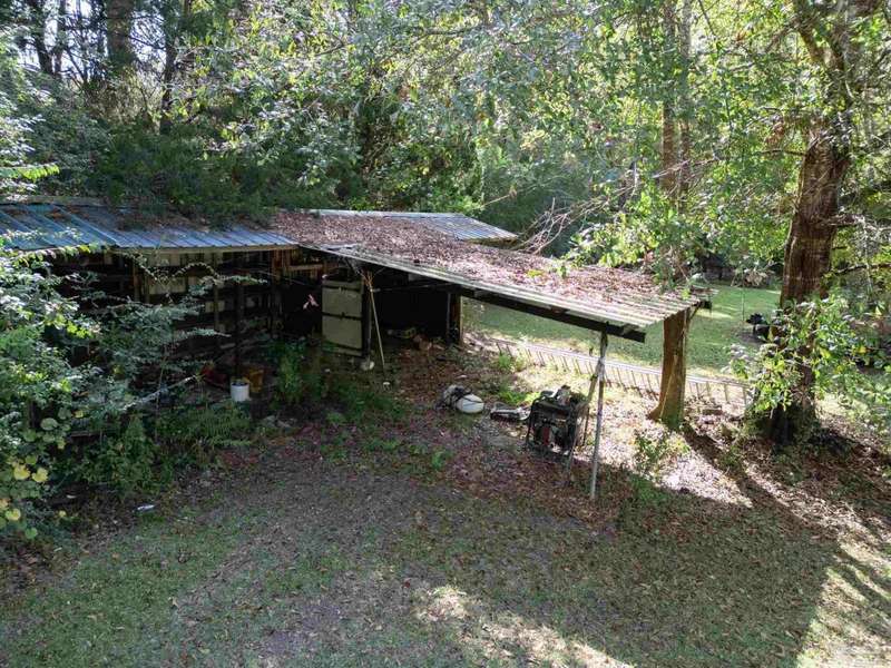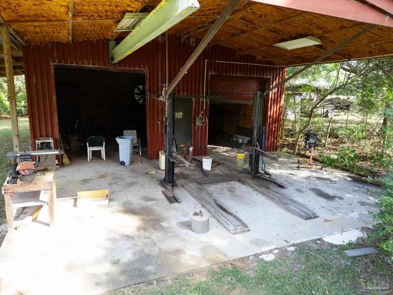 Rare opportunity in Cantonment - approx. 10 acres with gated access and ~660 feet of frontage along Hwy 297A, offering a combination of privacy, usable acreage, and potential for future development. The approach to the property opens with a spring-fed pond and then transitions into a mix of open fields and mature trees. Land features include multiple outbuildings and a large workshop with 7,000-lb lift, crane, overhead doors, compressor, vent fan, and second-story storage. Portions of the parcel include mapped wetlands; buyer should verify exact boundaries and any permitting requirements. The property is currently zoned LDR (Low Density Residential) within Escambia County. Seller indicates potential for rezoning to LDMU based on surrounding land uses; buyer responsible for confirming feasibility and process with Planning & Zoning. Existing improvements include a 1-story ranch-style residence (5 bedrooms / 3 baths) on slab with metal roof, screened rear porch, covered patio, interior laundry, and attached 1-car garage. The home and outbuildings convey as-is and may be used, renovated, or replaced depending on the buyer's preferred use. Horses are permitted under current zoning, and the layout supports a wide range of use cases including private recreational living, small-scale agricultural use, equestrian, or redevelopment subject to county approval. Access is controlled by electric gate. Utilities include septic system. Pond frontage and pond view located onsite. Construction details and systems include block exterior, metal roof, central electric HVAC, geothermal open loop system, ceiling fans, interior shutters, built-ins, dishwasher, refrigerator, smooth-top range, and cover