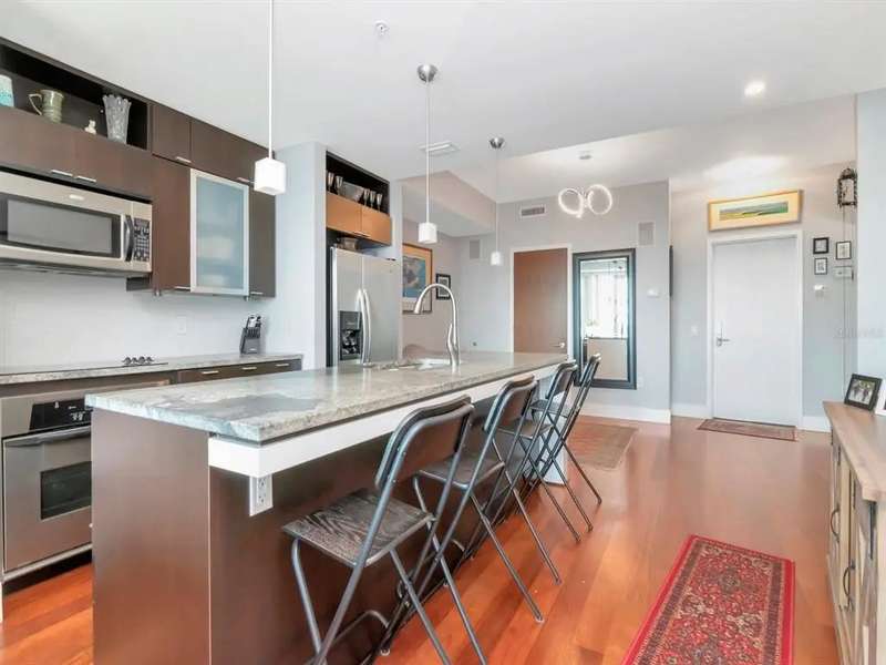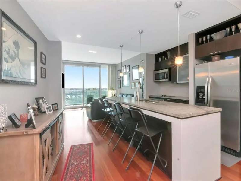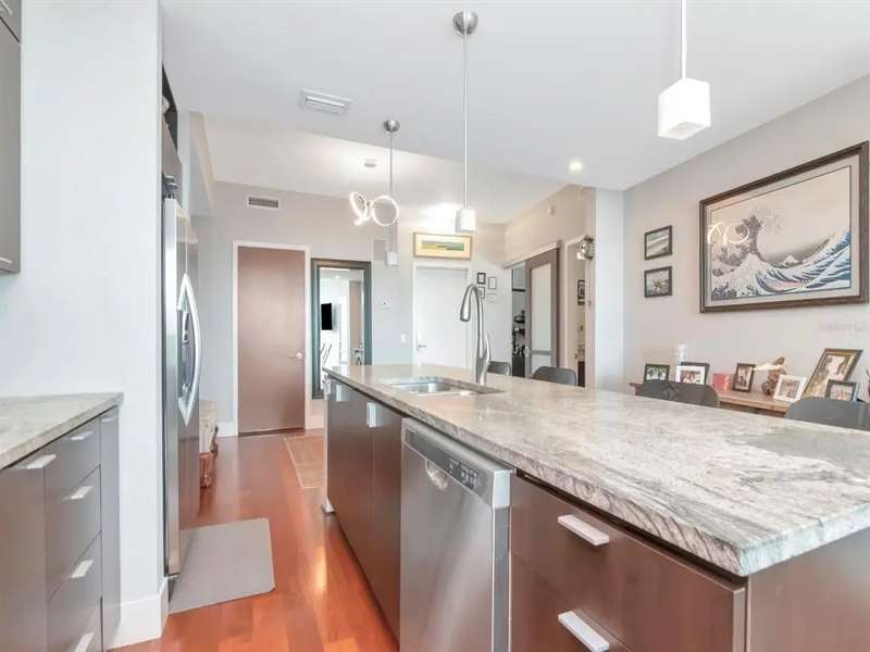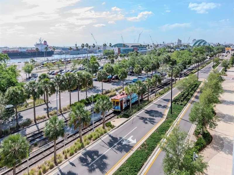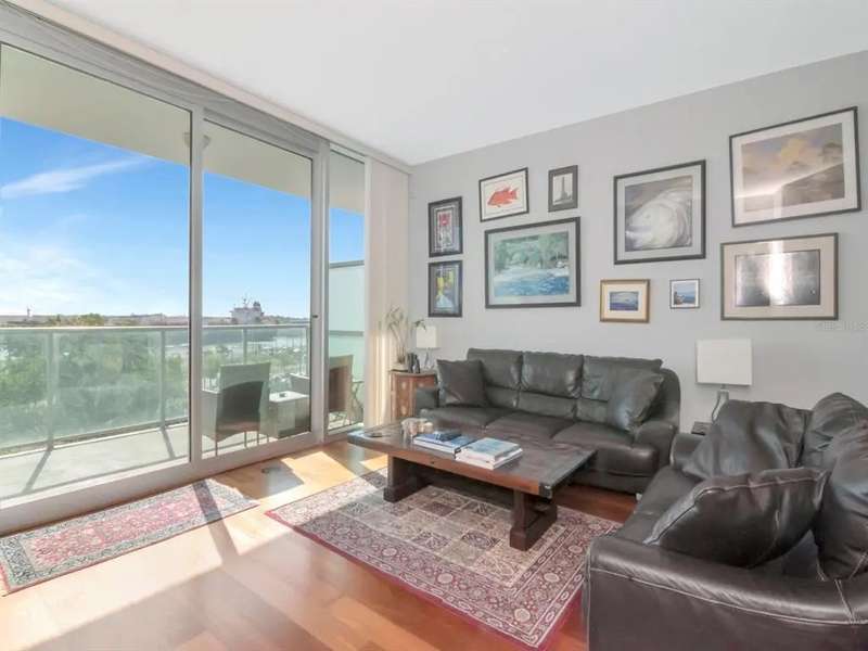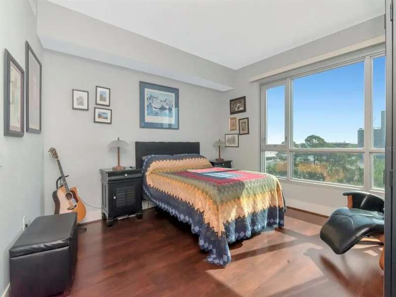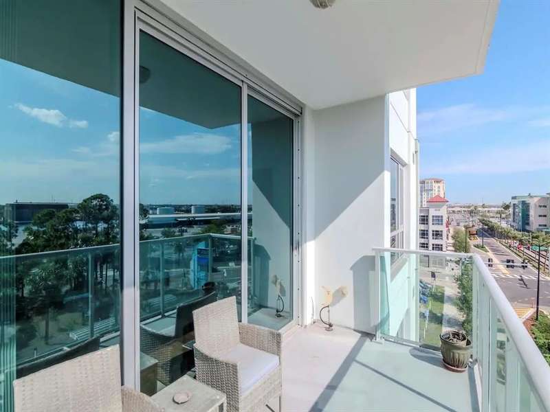 Rare "B1U" floorplan, end unit (so no neighbors on one side) with balcony looking directly East towards the sunrise, cruise ships, and Port of Tampa. Comes with one reserved parking space!! The home has a balcony and great views of The Port up-and-down Channelside Dr. Beautiful, open and spacious split 2 bedroom/2 bathroom with wood floors throughout dining/living room, kitchen, and primary bedroom; carpet in guest bedroom, tile in bathrooms. Enjoy your gourmet kitchen with large center-island granite countertops, sleek wood cabinetry, and stainless steel appliances. The home is light and bright with oversized sliding glass doors that lead to your glass walled balcony. The master bedroom boasts huge windows as well as a spacious walk-in closet. The en-suite bath has granite-top vanity, double-sinks, separate tub, and shower. Guest bedroom is also en-suite to 2nd bathroom which is accessible from the living area as well. Indulge in your resort-like amenities; luxurious pool/spa and surround, with lush landscaping, lounges, umbrella tables, bar area, and sauna with newly renovated fitness center. In the heart of the thriving Channel District with many shops, restaurants, and parks. Adjacent to Water Street Tampa with USF Morsani College of Medicine, Sparkman's Wharf and new Greenwise Publix. HOA fee provides great value and includes: Basic Cable/Wireless Internet, Building/Flood Insurance, Roof/Pool/Grounds Maintenance, Building Maintenance, 7 days/week Concierge/Security and On-Site Manager and Management Office. Approved for conventional and VA financing.