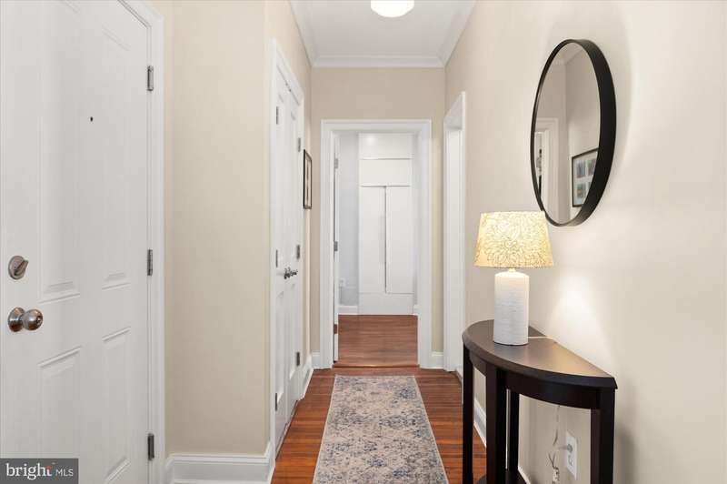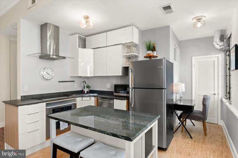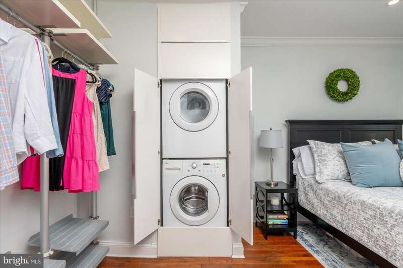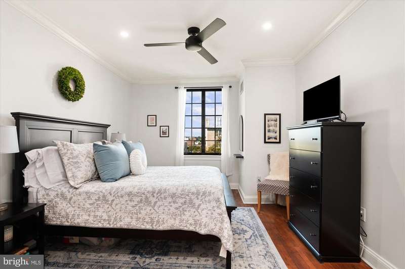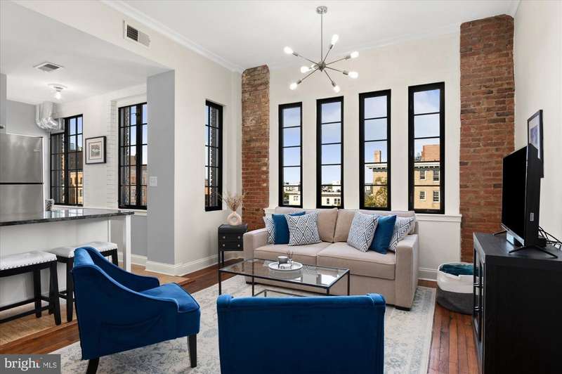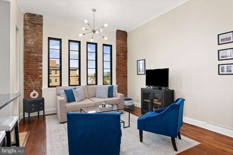 Welcome to this beautiful top-floor 1-bedroom, 1-bath residence in the prestigious Chastleton, offering sweeping city views. The bright and open living/dining area features stylish exposed brick and expansive windows that flood the space with natural light, complemented by soaring 103 ceilings that enhance the airy atmosphere. Elegant moulding and hardwood floors are found throughout the home, adding timeless charm.The open-concept kitchen is equipped with a 4-burner cooktop and refrigerator, along with a Bosch oven and dishwasher. Just off the kitchen and living room is a balcony that can be accessed via windows, perfect for container gardening. A hallway behind the kitchen leads to the HVAC closet and offers space for a desk and chairideal for a home office setup.At the other end of the unit, the bedroom includes an open wardrobe system and a stacked LG washer and dryer closet for added convenience. The adjoining bathroom is bright and welcoming, featuring a window that brings in natural light.Residents of The Chastleton enjoy a range of amenities, including a well-appointed ballroom, private courtyard, and fully equipped fitness center.Ideally situated between Dupont Circle and Logan Circle, this prime location places you in the heart of D.C., close to Dupont Circle metro station, grocery stores, shopping, and dining.