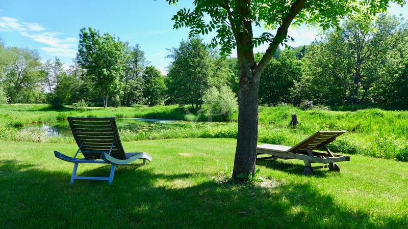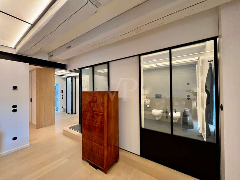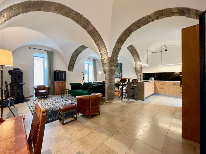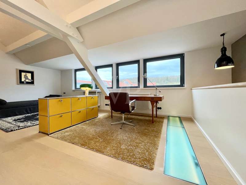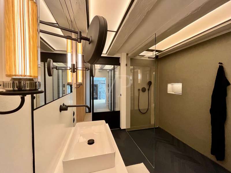 This house has it all - the light and the shade, the transparency and the privacy, the vision and the security. For the owner, the collaboration with the interior designer was a real stroke of luck. What at the beginning was supposed to be a manageable modernization became, in the interaction of both creative minds, a project that runs through all floors. The result was a new arrangement of the rooms as a tailor-made suit. The starting point is the defining cross vault on the first floor from the 18th century. This architectural detail is the linchpin for the generously designed kitchen, for the dining area and the space by the fireplace. Powerful use has been made here of color accents in the furniture and art. Transparency through glass doors, which satinize on request in the bathroom area, among other things, lend the house a French lightness. The lighting concept runs through all floors: in addition to the ceiling lighting, which was spectacularly recessed between the old oak beams, especially on the upper floor, we find mainly wall lights. Each one handpicked, some from Paris, some unique pieces with collector's value. All materials have been finished to the highest standard, whether the oak flooring upstairs and in the attic, the built-in furniture upstairs, the tiles, the doors, the light fixtures....Seldom can one speak of perfection, here it has been achieved. Best of - an irresistibly beautiful house.