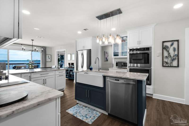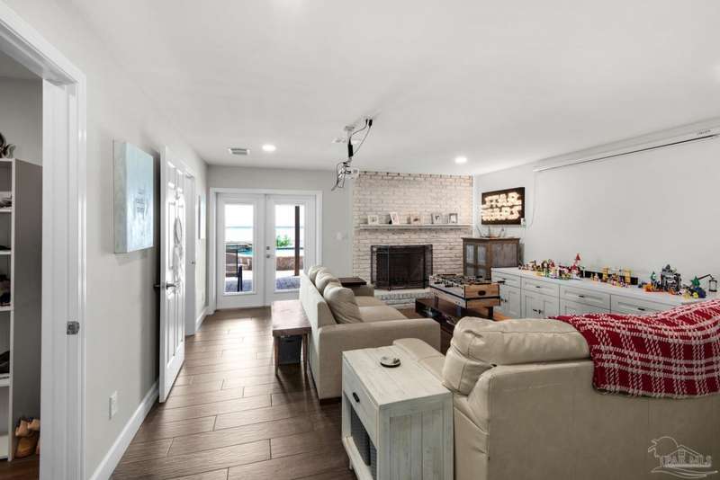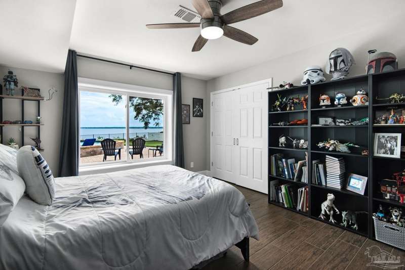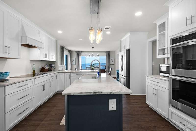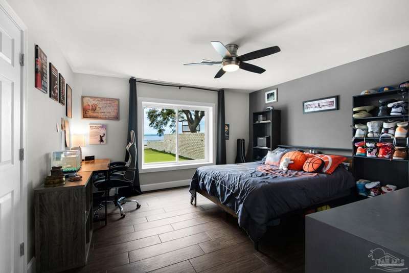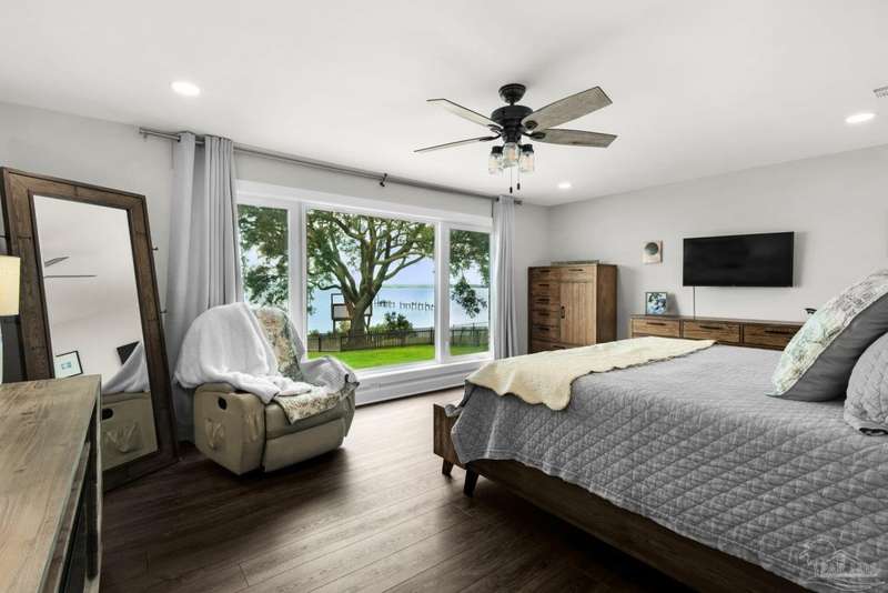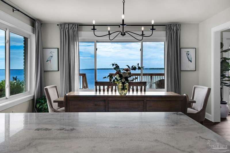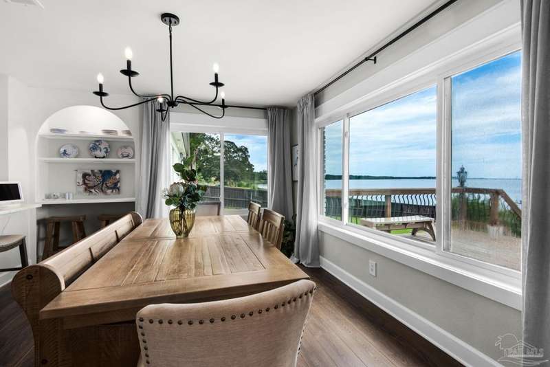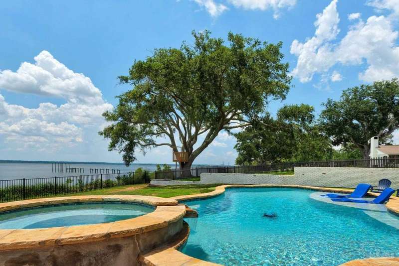 OPEN HOUSE OCTOBER 11, 11-1:00 Stunning renovated home on Andrew Jackson Drive, offering 150 feet of waterfront on Escambia Bay. Sitting on nearly an acre, this waterfront paradise features a gunite pool, spa, & a putting green. Enjoy breathtaking sunsets from this 4bedroom, 3bath residence, with water views captured from almost every room. While a portion of the lot is located in a flood zone, the home is not making flood insurance more affordable. Completely renovated down to the studs, interior is brand new in 2024. Step through the foyer into the spacious main living area on the first level, where panoramic water views greet you. The living room has a cozy wood-burning fireplace & built-in floor-to-ceiling bookcases, ideal for displaying your favorite collections. The bright and airy kitchen & dining space are equipped with abundant cabinets, stone countertops, & a double oven. A large walk-in pantry offers ample storage and bar seating provides casual eating options. The primary suite is a retreat with gorgeous bay vistas, featuring a luxurious bathroom with a double vanity, built-in shelves, a soaking tub, & a large tiled shower. A generous walk-in closet ensures plenty of space for your wardrobe. Additional first-floor amenities include a bedroom, full bath, laundry room, and direct access to an open deck overlooking the bay. Downstairs, you'll find a spacious family room with a fireplace & built-in cabinetry, perfect for gatherings. This level also includes two more bedrooms with bay & pool views, a full bath, two versatile bonus rooms ideal for offices or guest suites, and additional storage closets. Enjoy outdoor living with a covered patio leading to the sparkling gunite pool, spa, & putting green.The backyard offers expansive green space for entertaining, along with an observation/platform tree fort for the kids.This unique gem combines luxurious updates, breathtaking views, and outdoor fun-an exceptional waterfront lifestyle waiting to be discovered.