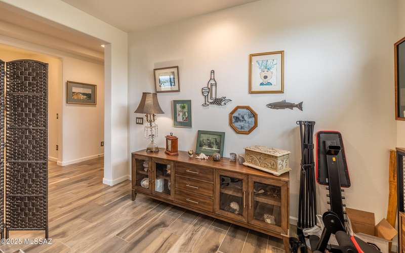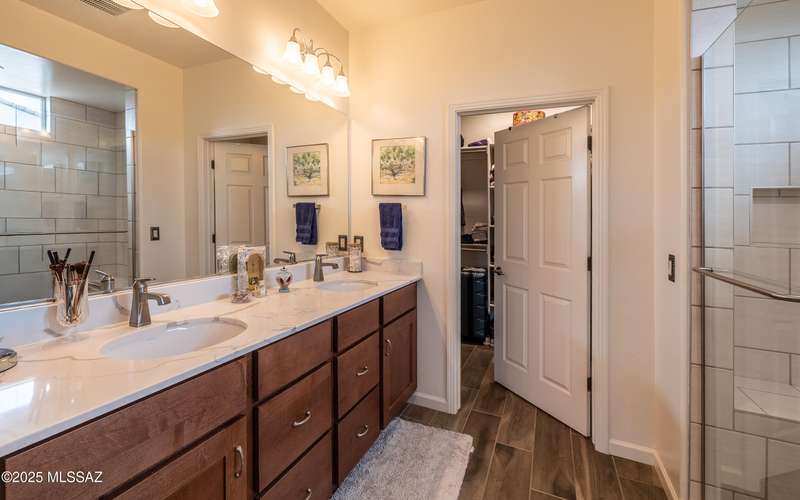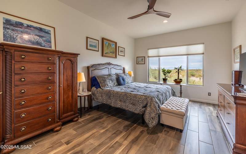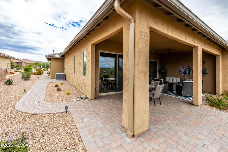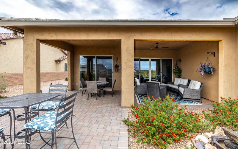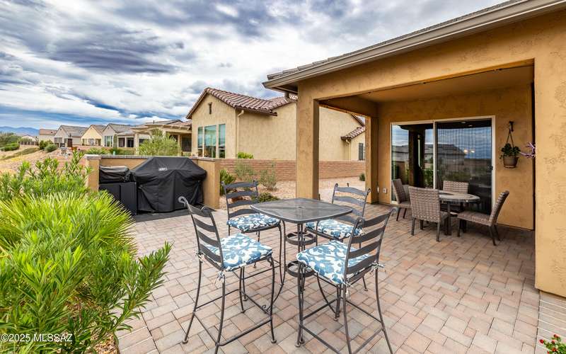 Infinite views over the desert to the Catalina & Rincon Mts. on this premium lot in Quail Creek. This Mariposa model is a well appointed home with many upgrades! 4'extended owners suite, Quartz countertops throughout the home. High ceilings, walk in pantry, Built in Coffee Bar and Wine Cooler in the Fabulous great room. The dining room and great room both overlook the brick paved patio with desert and Mt. views. The 2.5 car extended garage has storage, utility sink and a pedestrian outside door. The desert friendly landscape is low maintenance. Entertain guests on the covered patio with a soothing water feature that over looks the beautiful Sonoran desert with miles and miles of views.