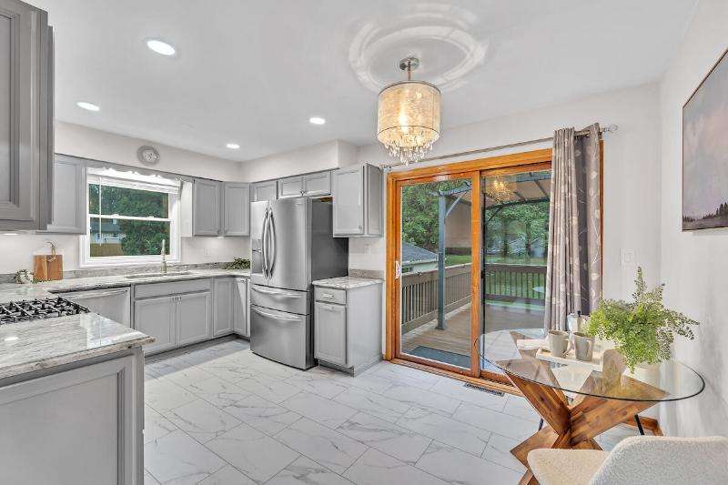 Updated, move-in-ready, and a must-see! This charming raised ranch welcomes you with a bright living room featuring a bay window, perfect for cozy mornings or relaxing afternoons. The modern eat-in kitchen boasts granite countertops, stainless steel appliances, & new flooring. Patio doors from both the eat-in area & primary bedroom create seamless indoor-outdoor living, leading to a spacious deck with a built-in gazebo overlooking the expansive, newly fenced backyard. The lower level is designed for fun & functionality, with a newly built wet bar adjacent to the rec room, new LVP flooring, & a renovated full bath next to the 3rd bedroom. All of this just minutes from the highway in the sought-after Knollwood Estates neighborhood. The perfect setting to make lasting memories.