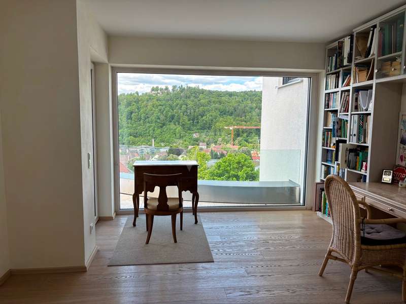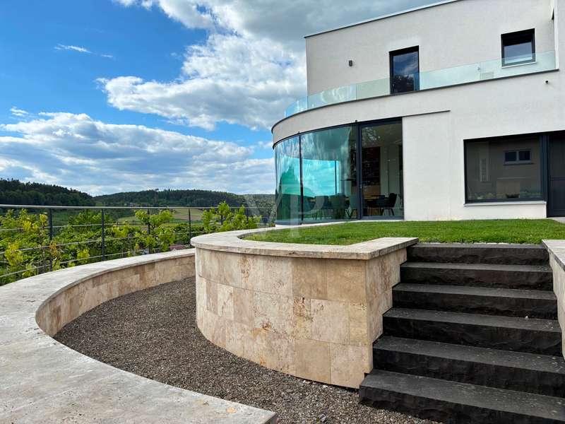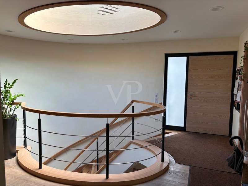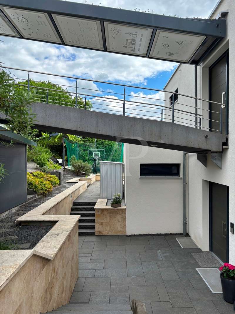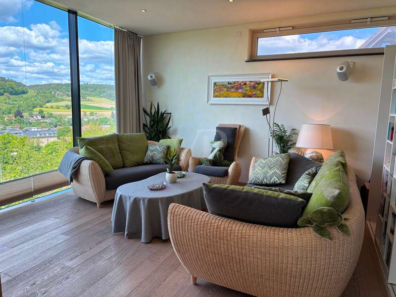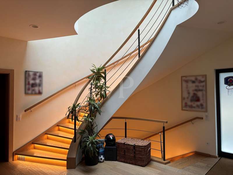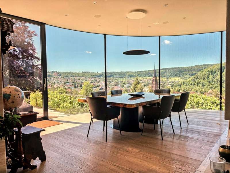 Welcome to your new home, an impressive property in Nagold that offers a combination of modern design and upscale amenities in a fantastic location. This well-kept property, built in 2011, offers a generous living space of approx. 464 m² on a spacious plot of approx. 1,390 m² in the middle of Nagold. With a total of 12 rooms, including 5 bedrooms and 4 bathrooms, this detached house offers enough space for sophisticated living requirements. An outstanding feature of this property is the exclusive architecture, which impresses with floor-to-ceiling and curved glazing in the living area, among other things. This design not only allows an excellent incidence of light, but also an impressive view over Nagold. The outdoor facilities are of high quality but also low-maintenance and include three garages and an extraordinary carport with space for two vehicles. There is also an integrated waste room and a bicycle room with a water connection. The outdoor area is enhanced by impressive water features and sophisticated garden lighting. A covered terrace with an outdoor kitchen is available for moments of outdoor enjoyment. A glass roof with shading option and an additional awning offer flexibility depending on the weather. An outdoor seating area with a canopy and a playing field with a basketball hoop complete the outdoor area. The garden has a separate wine cellar and a garden workroom with a water connection. A modern irrigation system is supported by a cistern with domestic waterworks, which ensures sustainable water management. The property's heating system includes a geothermal heat pump, supplemented by air conditioning (heating/cooling). A photovoltaic system with a capacity of 9.2 kWp and 44 modules contributes to the energy efficiency of the house. Inside, the high-quality fitted kitchen from SieMatic, equipped with large electrical appliances from Siemens, is impressive. An extensive air conditioning system and high-quality built-in furniture create a comfortable living ambience. The exclusive floor design in wood and travertine runs through the entire house. The master suite has a dressing room and a spacious en-suite bathroom. There are also three further rooms on the upper floor as well as a roof terrace with glass railings. Further amenities include a three-sided glazed fireplace that separates the living and dining areas. Sliding glass doors and an open, curved staircase with skylight further emphasize the high-quality interior design. This house offers maximum living comfort and meets the highest standards of design and functionality. A viewing is highly recommended to experience the many amenities on offer in person.