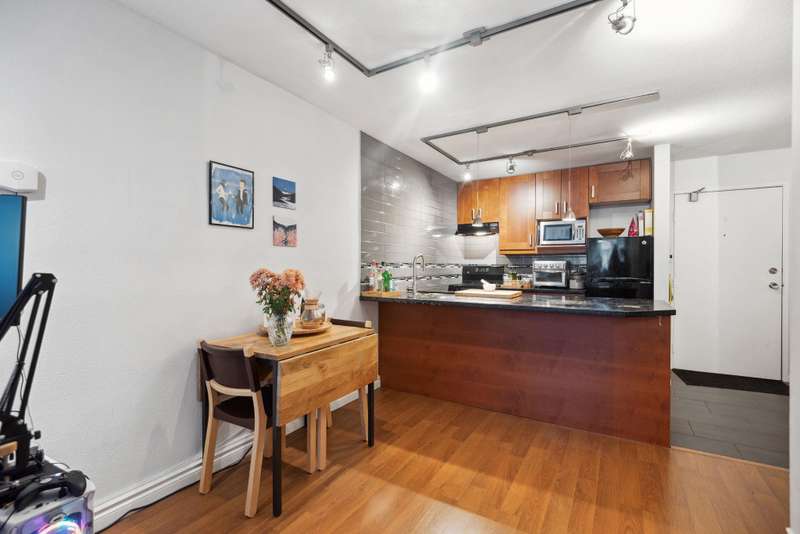 Welcome to 615-1330 Burrard in the sought-after Anchor Point! This well-designed 618 sqft condo features a spacious kitchen with sleek stone countertops, a subway tile wall/backsplash, and ample prep space. The open-concept living and dining areas have plenty of natural light from large windows, creating an inviting space to relax or entertain. The generous bedroom includes a cozy workspace plus large closet space. Heat, hot water, and the convenience of a live-in caretaker are all included in this well-managed concrete building. Don’t miss this opportunity to own a stylish home in the heart of downtown Vancouver—schedule your viewing today!
