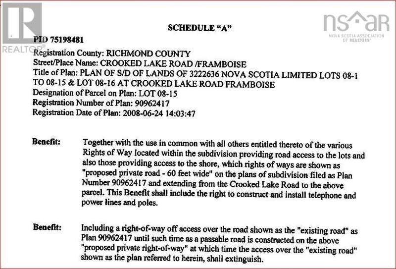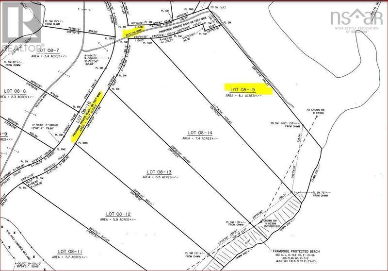 Oceanfront Property! This stunning 6.1 Acre property offers direct access to the pristine sands of Morrison (Framboise) Beach/Trail. Enjoy morning walks along the shoreline, breathe in the fresh ocean breeze, enjoy the rhythmic sound of the surf. The property is land registered, and according to Nova Scotia Environment, it is suitable for the installation of an on-site sewage system (permit required). Capture from subdivision plan on the listing pictures. The owner will hold deeded rights to the Private Road Right-of-Way (Lot 08-16) as indicated on the survey. This right-of-way plan is approved for grade and alignment only, and is not maintained by provincial or municipal services. Until that time, the deeded access for right-of-way is for the existing road (shown in listing pictures). Find complete listing (drone footage) at Realtor.ca MLS® Number: 202421768 (id:2494)
