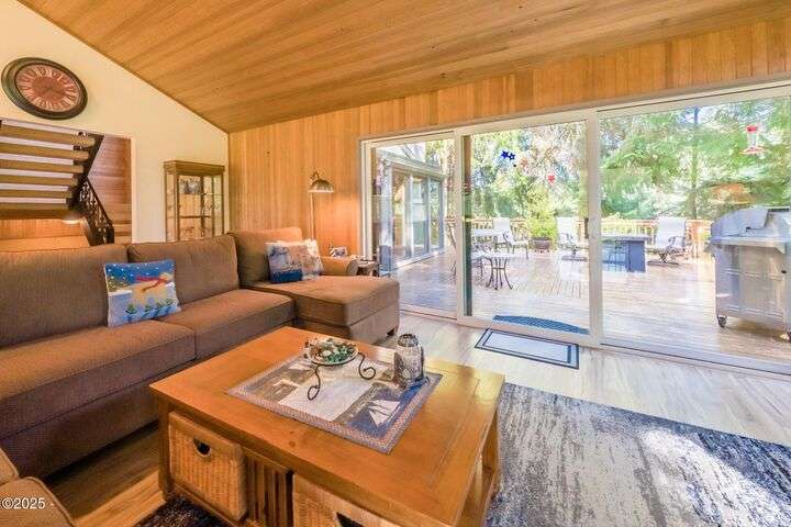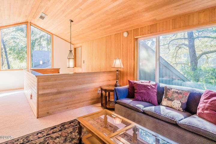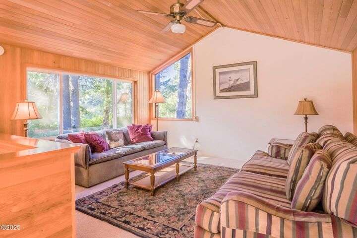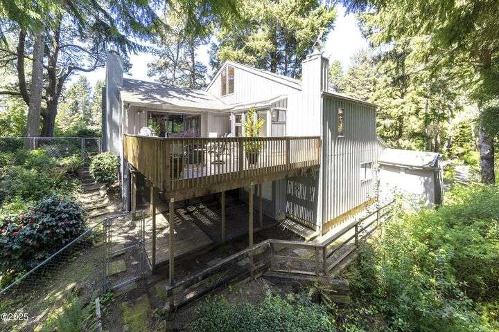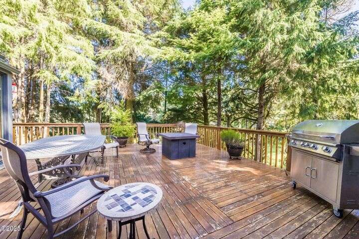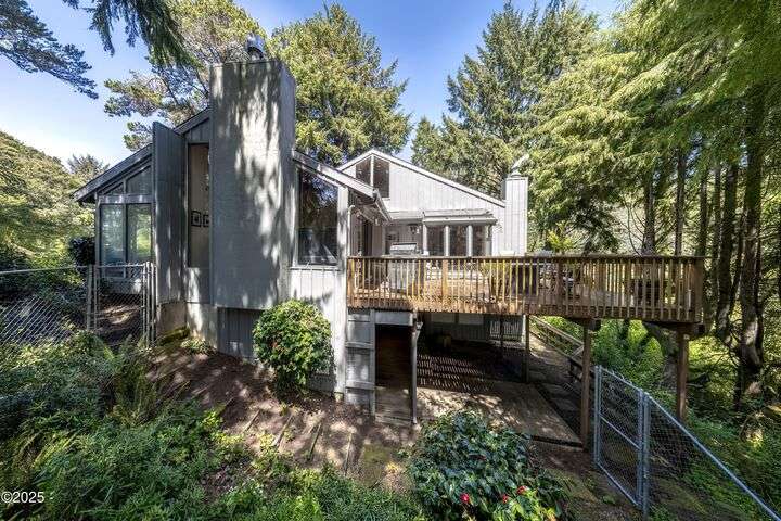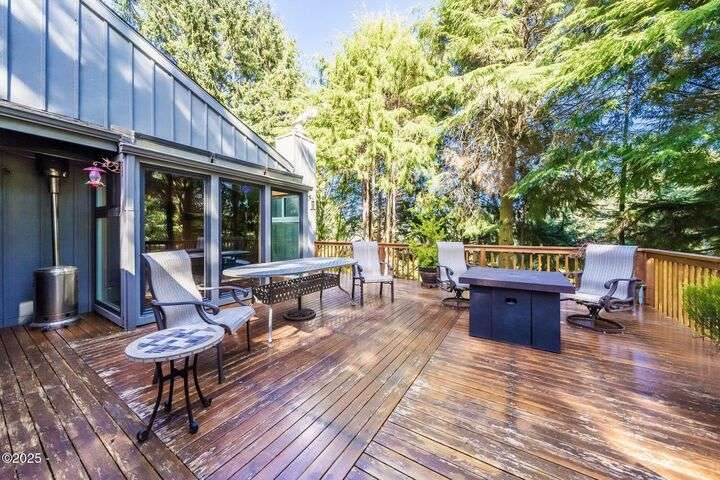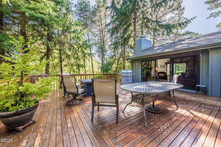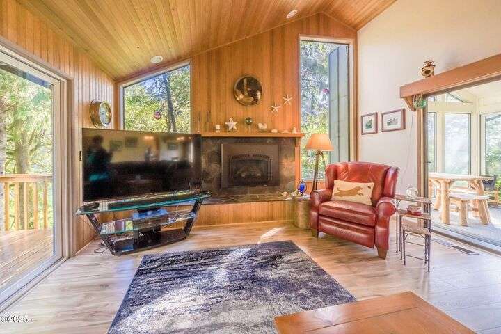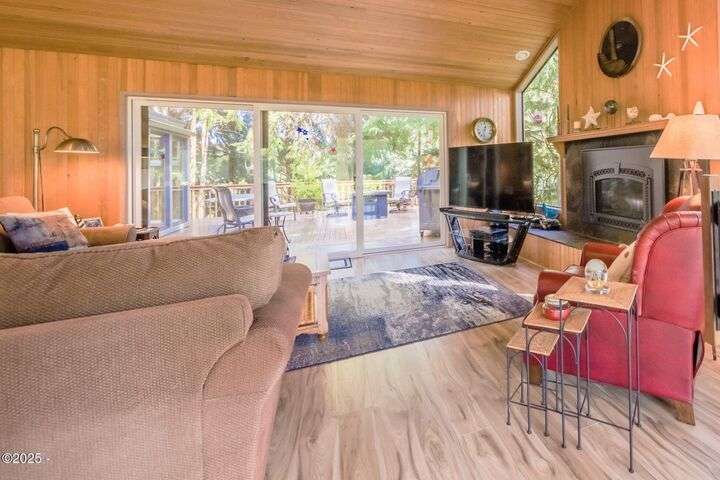 Salishan home nestled on the 17th & 18th Fairway close to the beach! This split level design features all main level living with gas fireplace, natural wood interior & open dining & living area with access to large private deck. Primary bedroom w/ sitting area & gas fireplace with deck access. Sunroom off dining area, opens to west side patio. Upper level has a reading nook/den lots of storage. The lower level has 2 bedrooms, extra bunk room, 2nd living area w/ wet bar, additional wood burning fireplace w/gas starter & access to large fenced in yard. This home has 2 utility rooms, 1 w/ sink & attached storage area off garage. First time on market, this home is perfect for multi family living with room for everyone, including your ''furry family members'' with fenced in yard! Salishan is an oceanfront gated community with beach & bay access, outdoor tennis courts, small boat launch & community center w/ outdoor seasonal pool. Close to Salishan Marketplace & shopping. Apprx 99 miles to Portland.