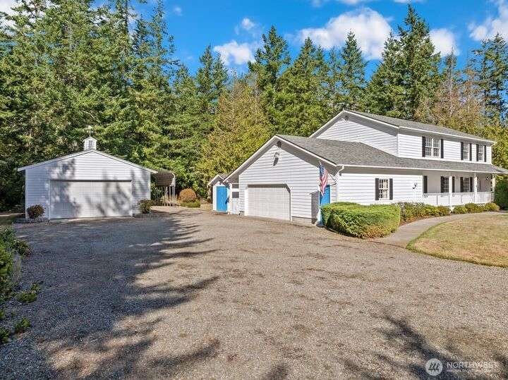 Experience seclusion and serenity in Discovery Bay! This meticulously maintained 2,500 square foot Colonial-style home is nestled on 5 private acres offering privacy and endless possibilities. Large detached shop with built-in storage perfect for all your toys, hobbies, or car collection. Attached 2-car garage with custom workshop. Amenities include 50 year roof, new H20 tank in 2025, and generator ready system. With its classic design, generous interiors, and tranquil setting, this property is the perfect blend of comfort, privacy, and Pacific Northwest living. Minutes to Discovery Bay Golf Club and ferry terminal. Pre-inspected and ready for the next owner.