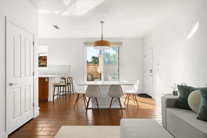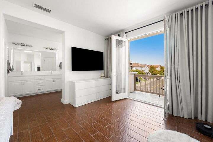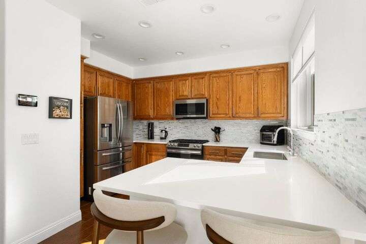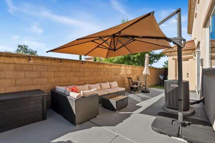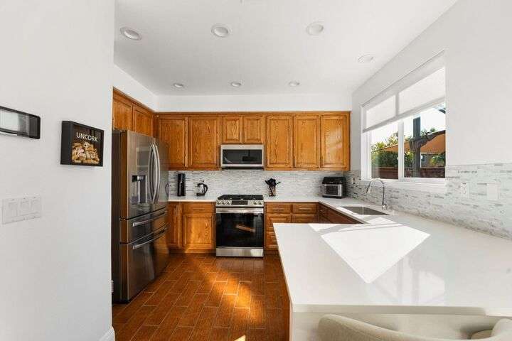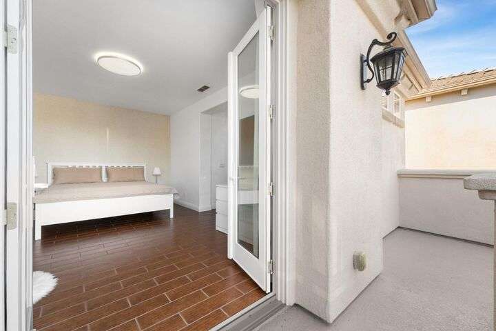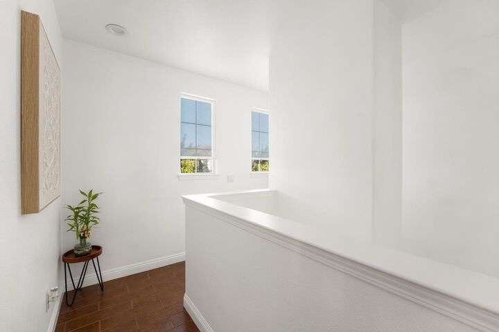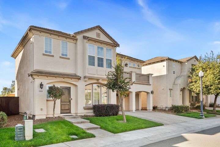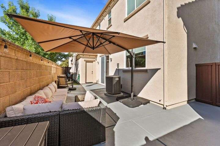 This beautifully updated home offers comfort and style from top to bottom with its light-filled open floorplan and clean lines. The kitchen is a showstopper with sleek quartz countertops, an extended tile backsplash, and all newer stainless steel appliances and fixtures. Updated bathrooms, including a luxurious oversized walk-in shower in the primary en-suite bath. Enjoy year-round comfort with a newer HVAC system and owned solar for energy efficiency. Durable earthy brown tile flooring flows through the home and is complemented by crisp white walls and updated light fixtures to provide a modern aesthetic and the perfect ambiance for everyday living & entertaining. The spacious primary suite opens to a private balcony through elegant French doors, creating a peaceful retreat with views of blue skies and treetops. The newly poured concrete patio is ready for gatherings and no rear neighbors provide for added privacy. Home comes equipped with washer, dryer, and refrigerator. Located just steps away from a scenic bike trail leading to Valley Oak Park and walking distance to Natomas' highly rated Westlake Charter School. The HOA maintains front landscaping, keeping the community pristine at all times.