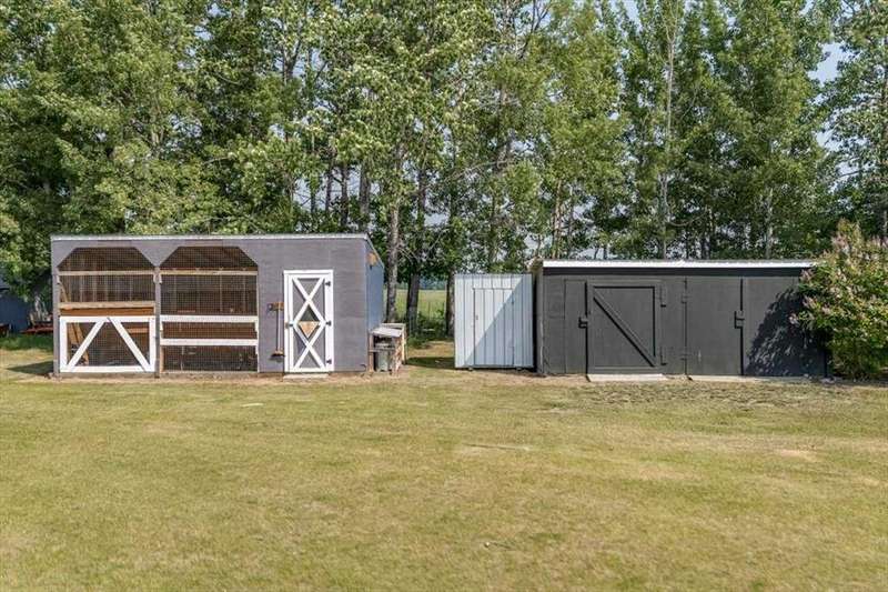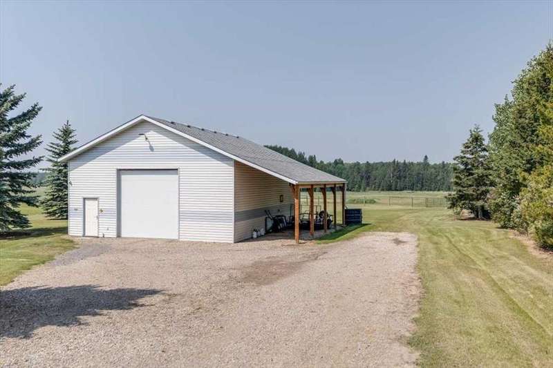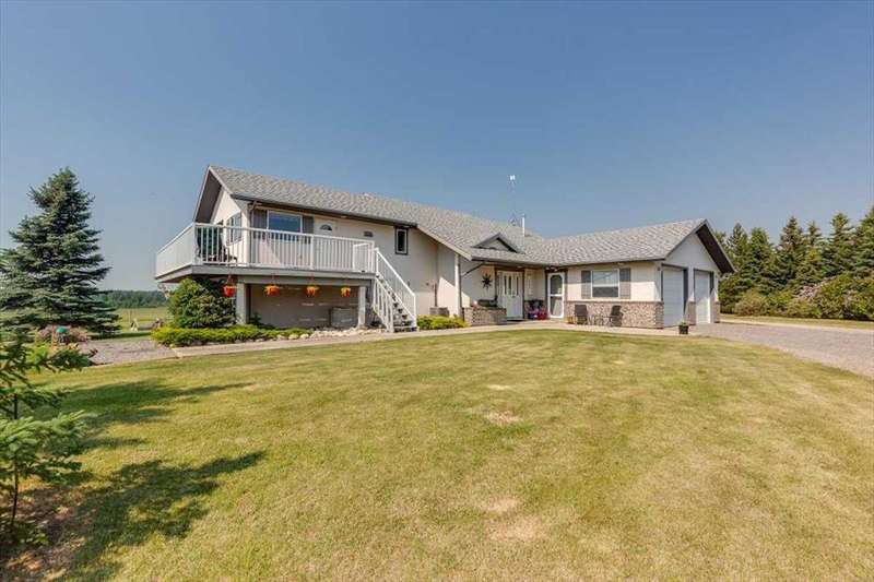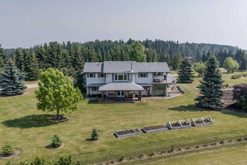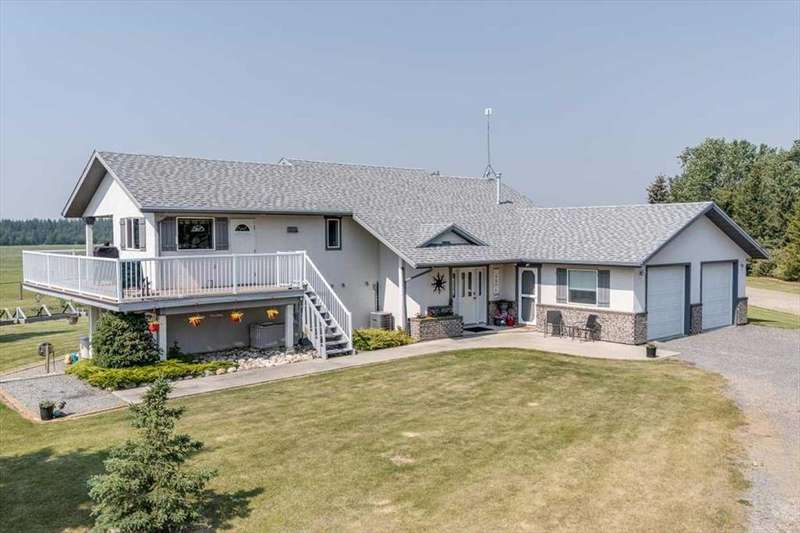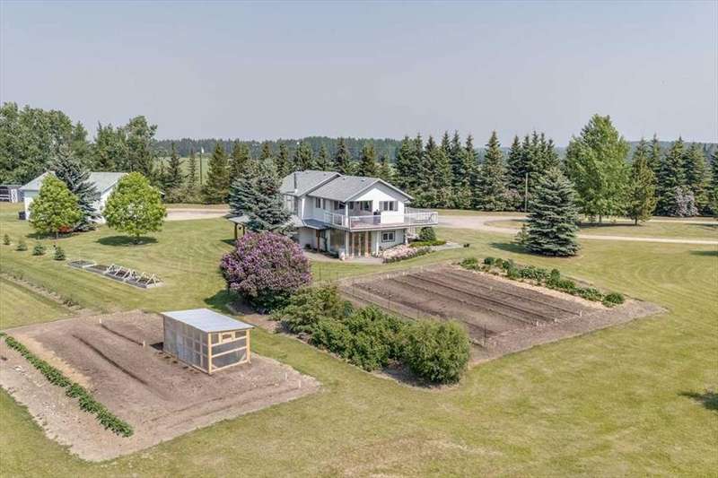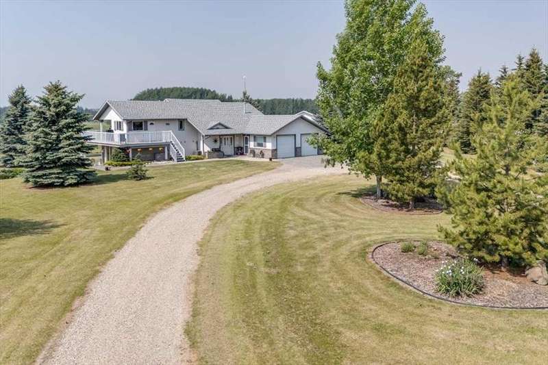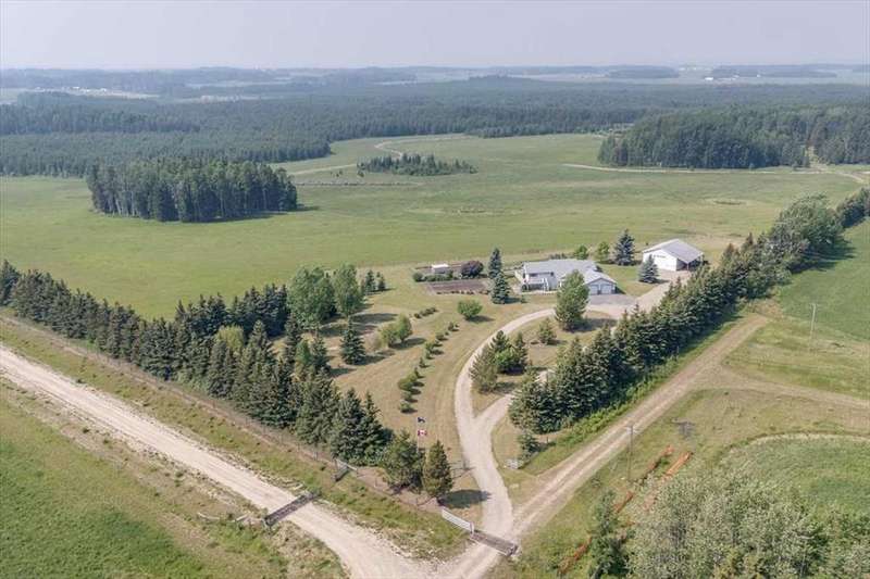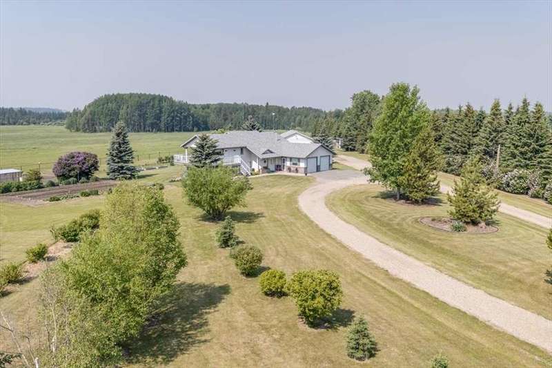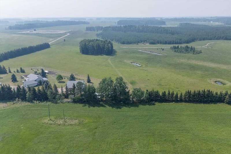 Welcome to your own private slice of rural paradise — a picturesque hobby farm and recreational quarter section that combines natural beauty, functional land use, and country charm just ½ mile off paved Oras Road. Whether you're looking to embrace peaceful countryside living, grow your own food, raise animals, or simply enjoy the serenity of wide-open spaces, this property has it all. From the moment you arrive, you’ll be captivated by the “Better Homes & Gardens” worthy yard site — a truly manicured and thoughtfully designed oasis. Rolling green lawns, established spruce and lilac shelterbelts, ornamental trees, expansive #1 black soil vegetable gardens, and artistic brick and stone landscaping create an atmosphere of effortless tranquility. A circle-drive with landscaped turnarounds completes the picture-perfect setting. The 1,256 sq ft custom bi-level home (1998) is perched on the high side of the quarter, offering sweeping panoramic views of the mountains. Inside, the main floor features vaulted ceilings, a cozy gas fireplace, and a sun-filled kitchen with a massive center island, quartz countertops, stainless steel appliances, and generous pantry storage. A sunny breakfast nook opens to a wraparound deck — the ideal spot to relax and soak in those breathtaking Alberta sunsets. The fully finished basement offers in-floor heating, a large family room with wood-burning stove, 3 bedrooms, a full bath, laundry, and walkout access to a beautiful brick-paved patio area. A dedicated under-deck gardening space keeps tools and supplies close to your gardens and greenhouse. Car enthusiasts and hobbyists will love the attached heated double garage with 9’ ceilings, dual overhead doors, utility sink, floor drain, and central vacuum. For even more space, the 39' x 32' finished shop offers radiant heat, 13'7" ceilings, two overhead doors, and an attached lean-to for storing all your equipment and toys. Several storage sheds, and a chicken coop round out the rural lifestyle dream. The land itself is just as versatile — with 40–50 acres in hay production (approx. 100 bales/year), and the balance includes lush treed areas, lowlands, three dugouts, fenced pastures, and 4 km of mowed recreation trails — perfect for walking, quadding, cross-country skiing, or simply enjoying the abundant wildlife. A high-producing water well provides an impressive 12 GPM flow of soft water, ensuring yourself, your gardens and livestock are well supported. Whether you’re seeking self-sufficiency, an inspiring family homestead, or a peaceful place to retreat and recharge, this unmatched countryside property is ready to welcome you home! UPDATE (October 18, 2025) - new pipeline (west side of property) installation project scheduled for July 2026 has been cancelled.