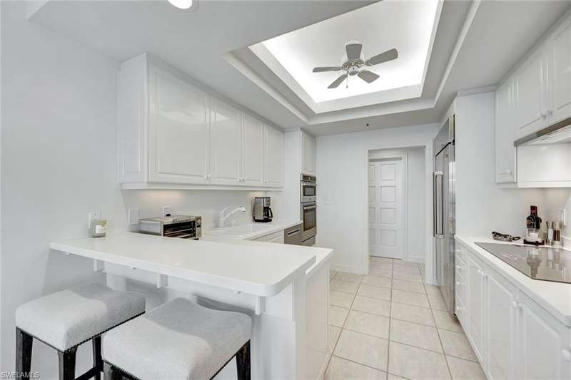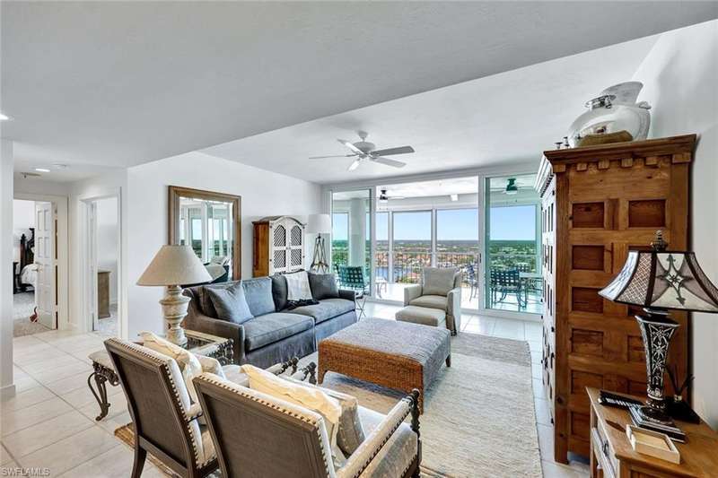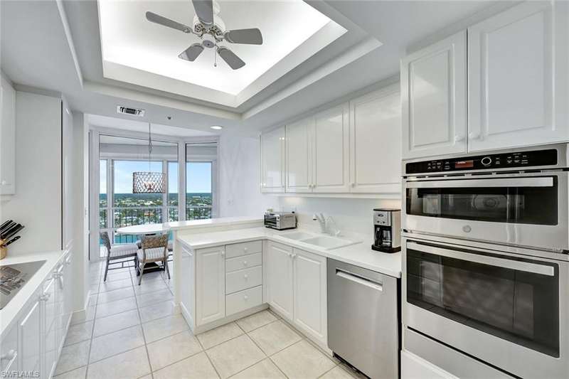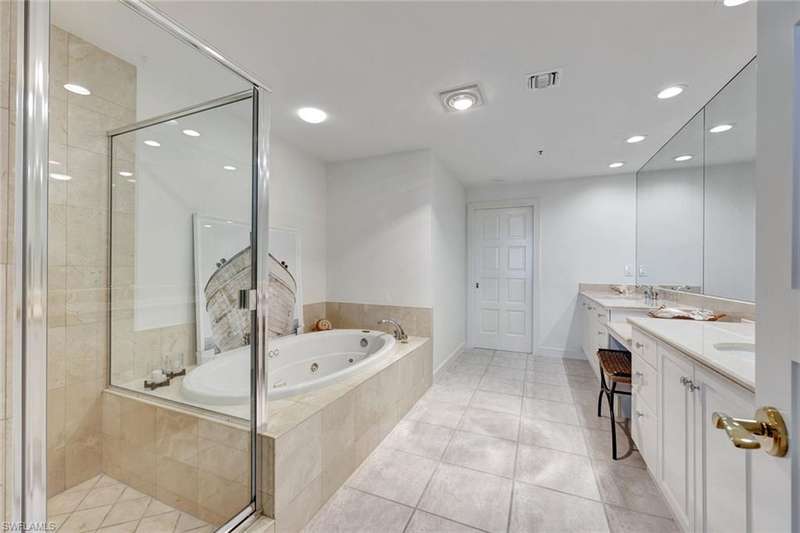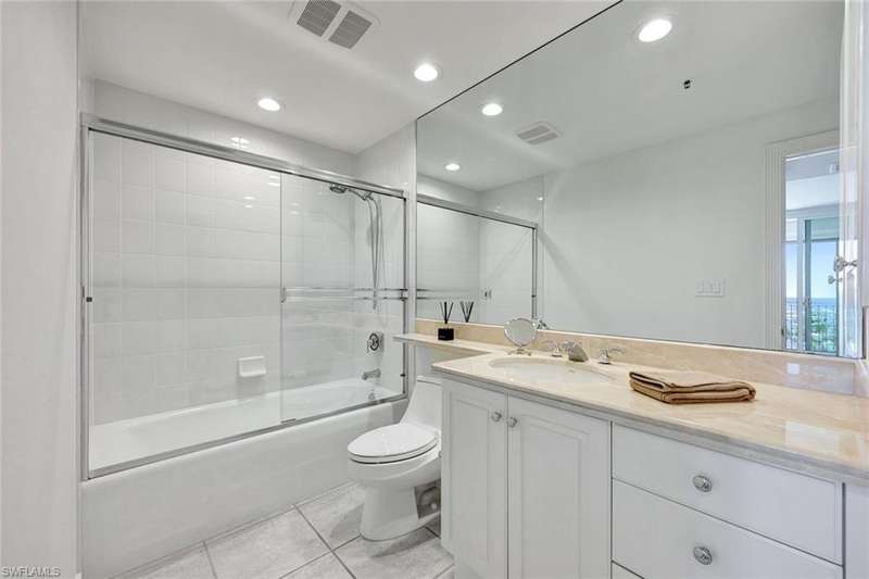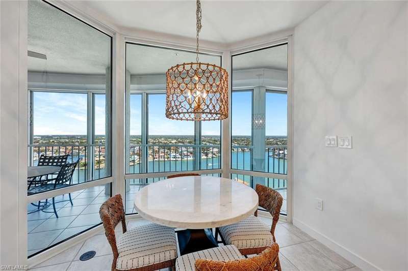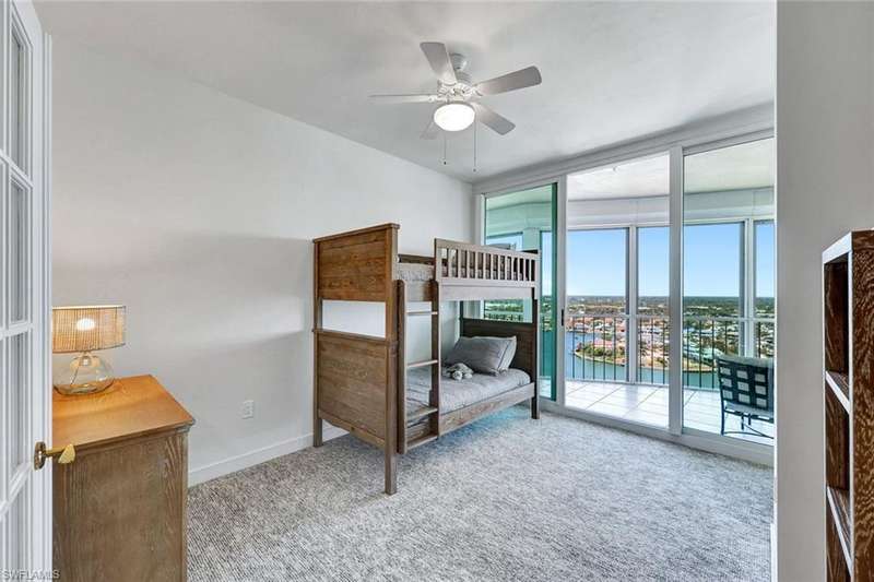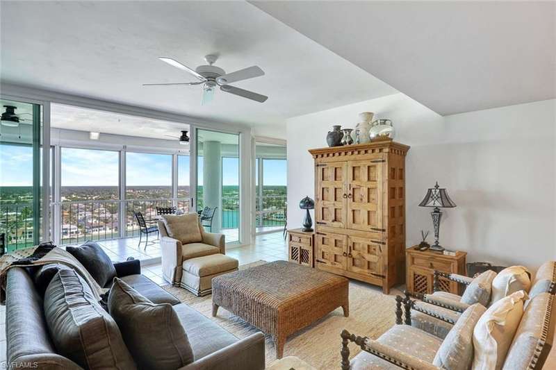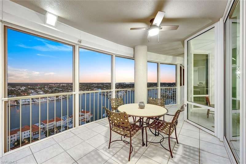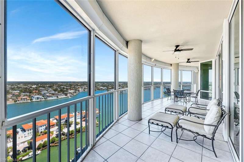 Beachfront Penthouse Living in Park Shore at Le Ciel Venetian Tower! Presenting one of the rarest views in all of Naples: penthouse level, 180-degree, unobstructed views of Naples' famous Venetian Bay. Start and end your days with picture-perfect sunrises, twilight vista views from the nearly 70-foot expansive lanai, which is accessible from every room, and romantic sunset walks along Naples' powdery white sandy beaches. Enjoy the lively boating scene and starry evening lights that expand all the way from Venetian Village through Doctors Pass. With 2,100 sqft of living space, 3 bedrooms, and 3 full bathrooms, there is plenty of space for a personal, private winter retreat or as a welcoming gathering space for treasured family and friends. The primary and second bedrooms both feature king-sized beds, en-suite bathrooms, and large TVs, while the third bedroom features a bunk bed, perfect for the kids and grandkids. Immediately upon entering the main living room, you are met with a view f