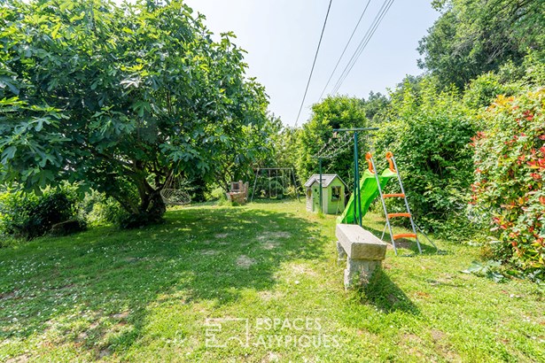 The entrance opens onto a kitchen leading to a bathroom, as well as a spacious living room where a wood-burning stove warms the atmosphere. The sleeping area includes three bedrooms, one of which has a dressing room, complemented by a landing room offering additional storage. A small room, opening onto the outside, remains to be renovated according to taste.