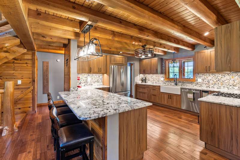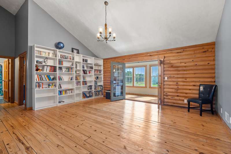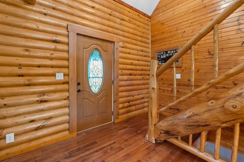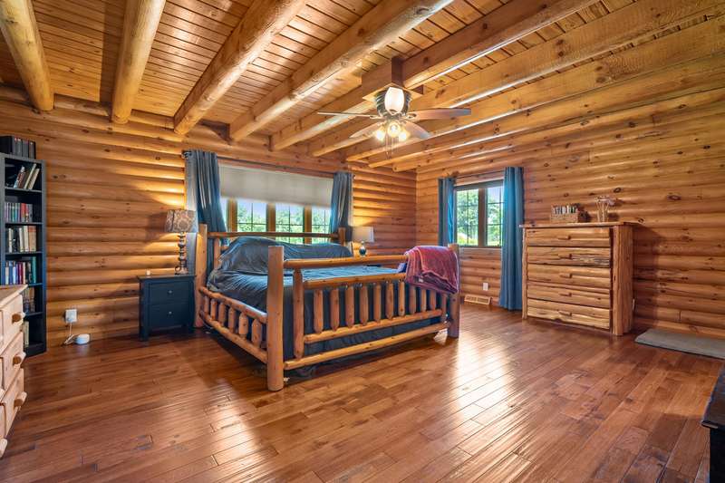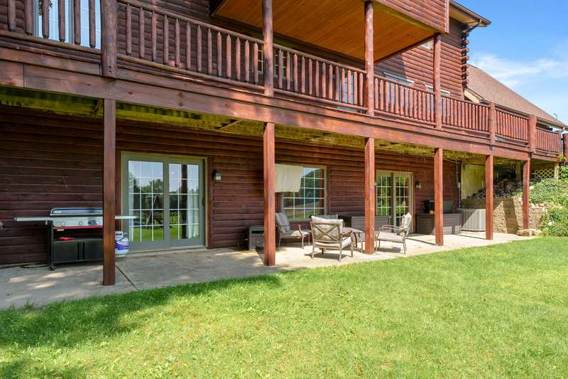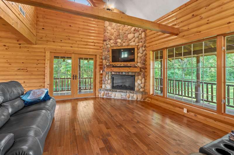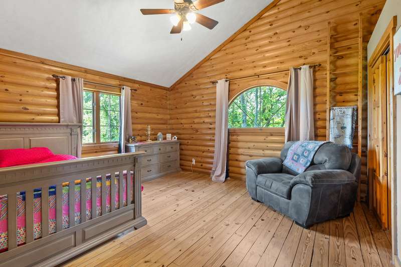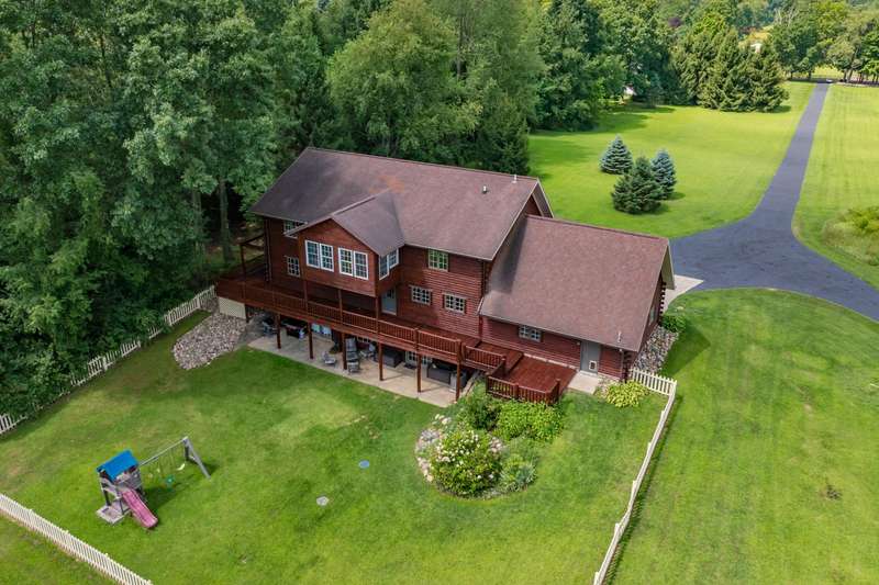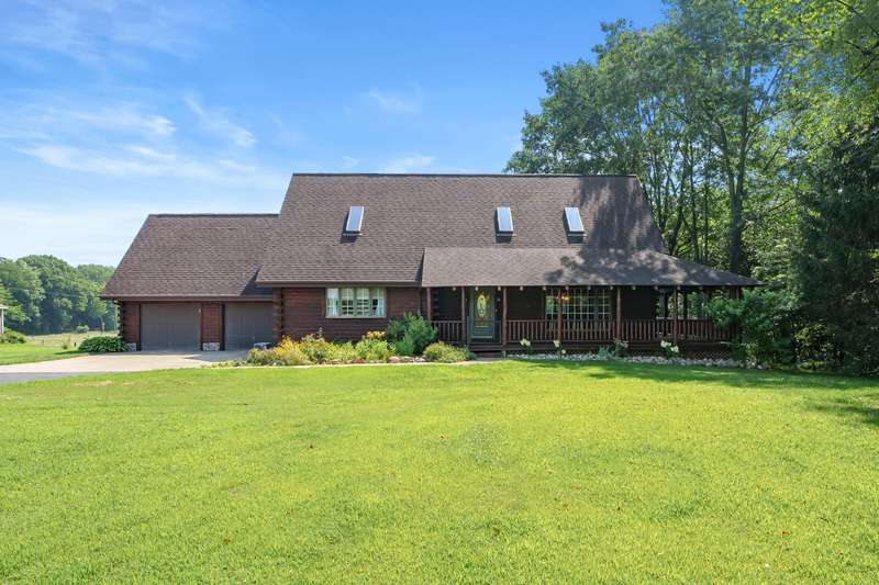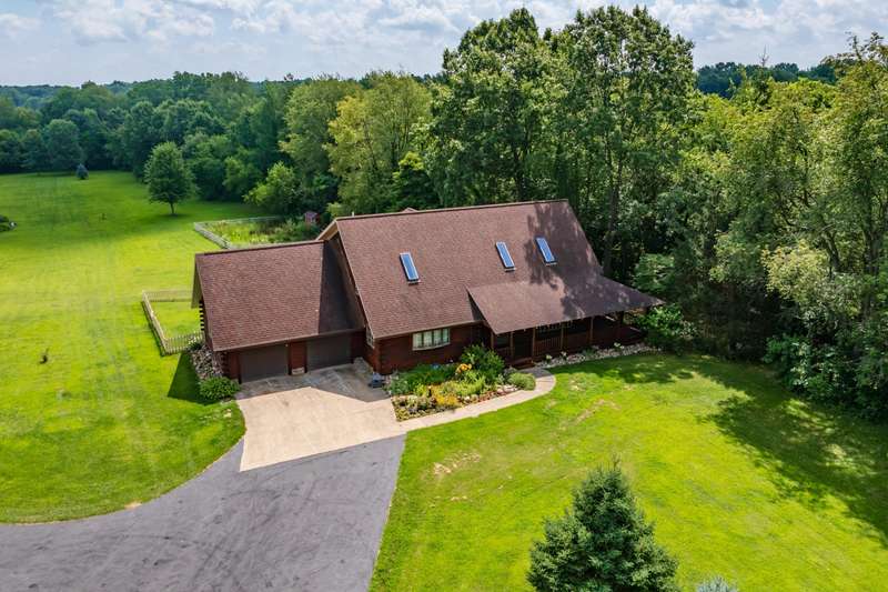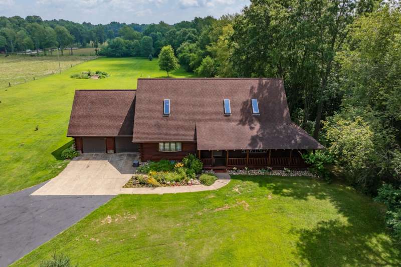 Stunning Log Home on 9 acres in private country setting, completely renovated in last 2 years with a beautiful floor to ceiling stone fireplace in Lg 2 story great room, open to upstairs, new hardwood hickory floors, new kitchens & appliances, updated baths & light fixtures, new furnace/central air, exterior stripped and re-stained, extensive tree & landscape work & walking trails groomed. Lg Main floor master has ensuite & walk in closet. 3 large bedrooms upstairs, office/sunroom & lg. loft/living area with built-ins, & full bath. Finished Lower walkout has updated full kitchen open to living area & a bedroom, all with sliding doors to the backyard, full bath, and lots of storage, 180 ft walk around covered deck to enjoy nature, custom water features in landscaping, 30x40 pole barn