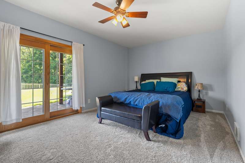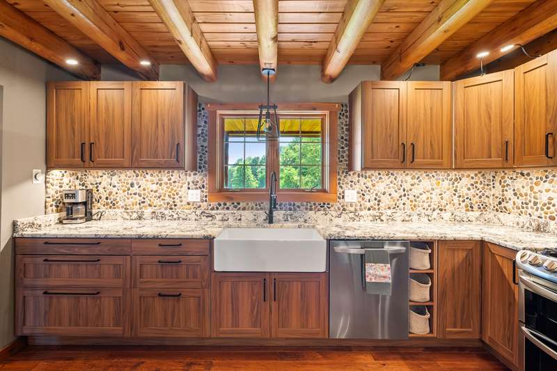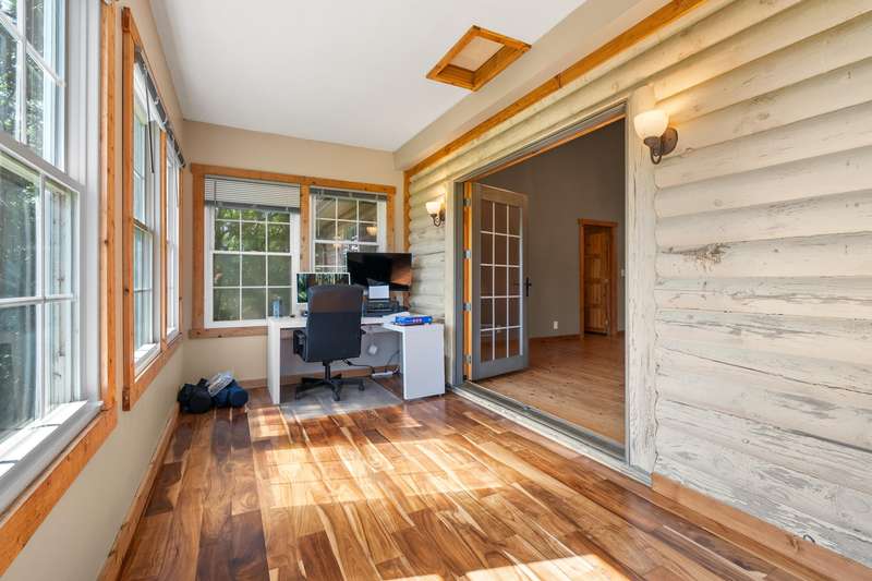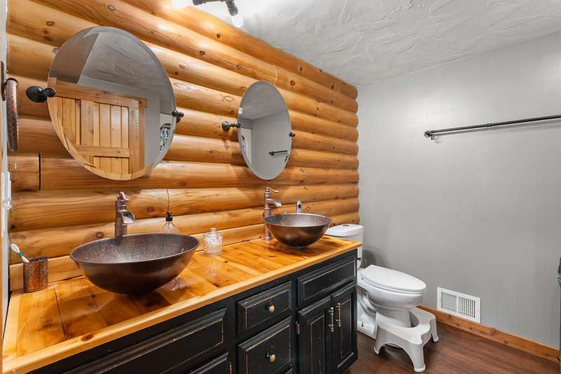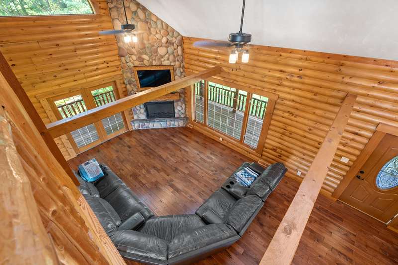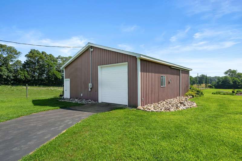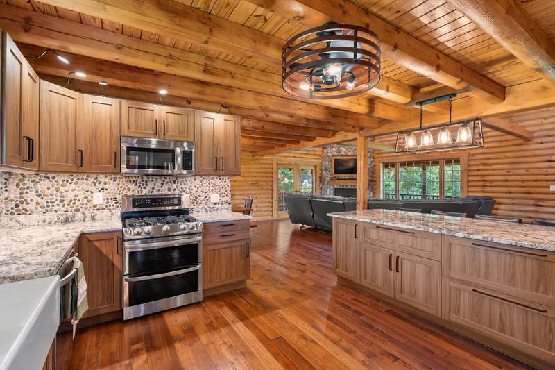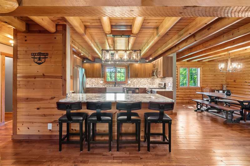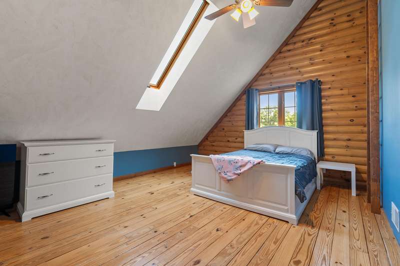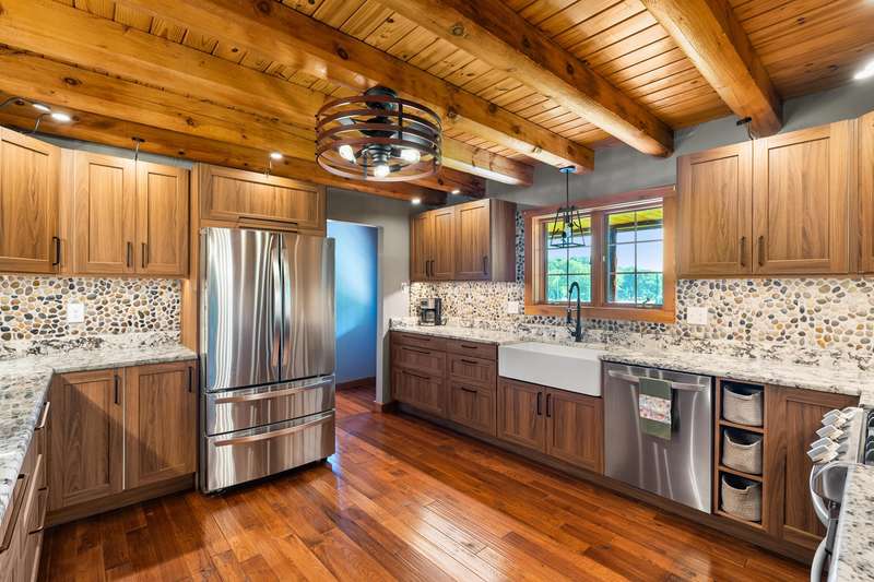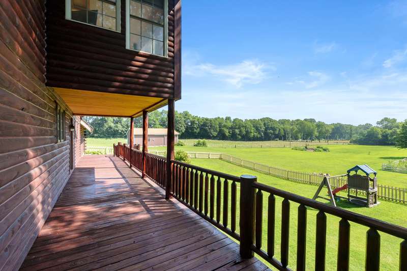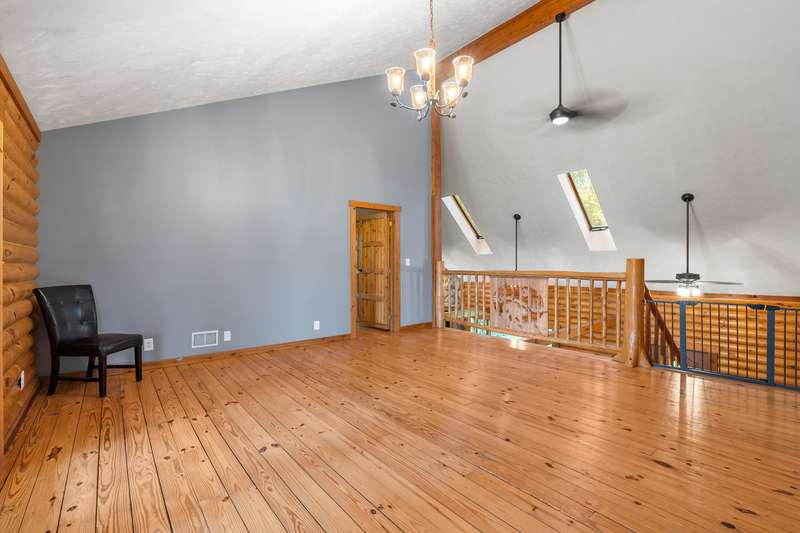 Stunning Log Home on 9 acres in private country setting, completely renovated in last 2 years with a beautiful floor to ceiling stone fireplace in Lg 2 story great room, open to upstairs, new hardwood hickory floors, new kitchens & appliances, updated baths & light fixtures, new furnace/central air, exterior stripped and re-stained, extensive tree & landscape work & walking trails groomed. Lg Main floor master has ensuite & walk in closet. 3 large bedrooms upstairs, office/sunroom & lg. loft/living area with built-ins, & full bath. Finished Lower walkout has updated full kitchen open to living area & a bedroom, all with sliding doors to the backyard, full bath, and lots of storage, 180 ft walk around covered deck to enjoy nature, custom water features in landscaping, 30x40 pole barn