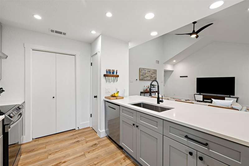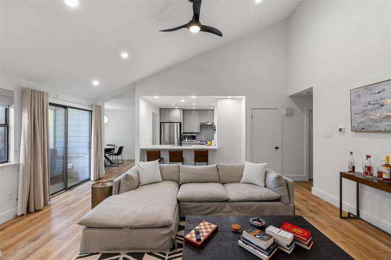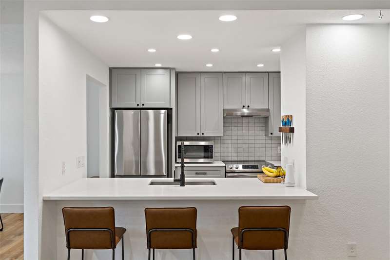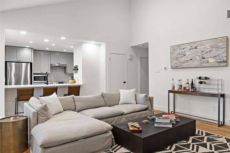 Welcome home to this strikingly renovated end-unit condo at 2001 Parker Ln, Unit 101, perfectly positioned to enjoy Austin's best. Nestled in a quiet, gated HOA community in Riverside, this home gives you designer finishes, high ceilings, and thoughtful upgrades throughout. The full renovation in 2023 delivers modern elegance: semi-custom cabinetry, under-cabinet lighting, updated fixtures, and polished kitchen appliances. A spa-inspired bath with tile walk-in shower, bedrooms with plush carpet and custom blackout shades, and a cozy fireplace all make this unit feel like a retreat.