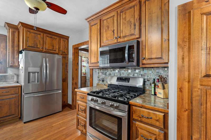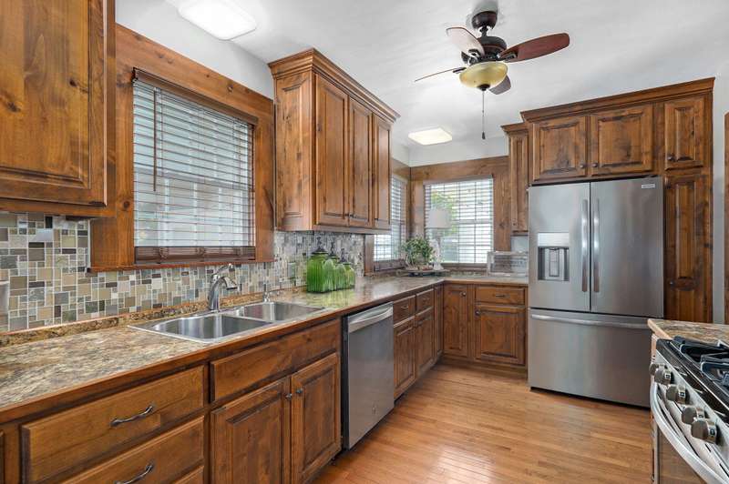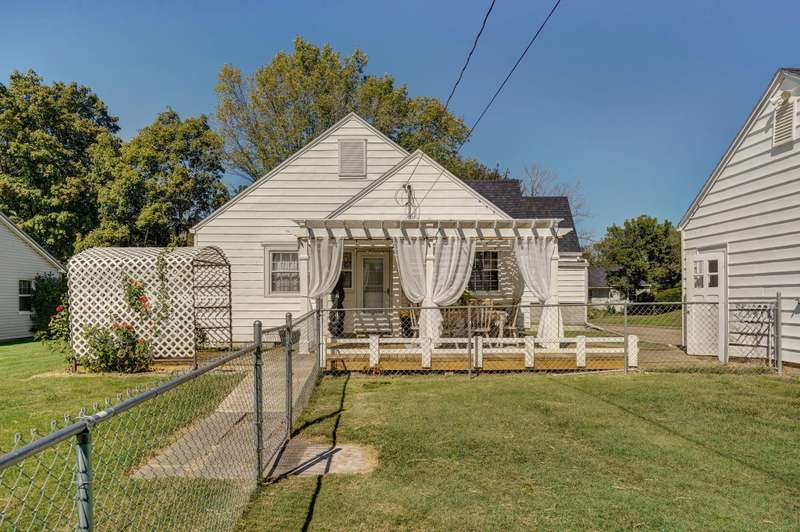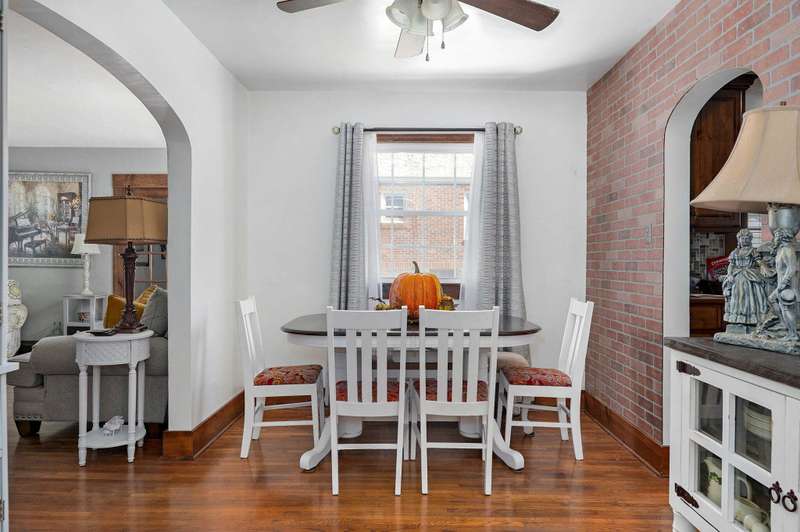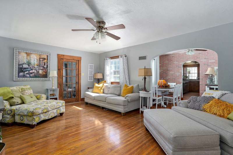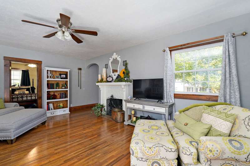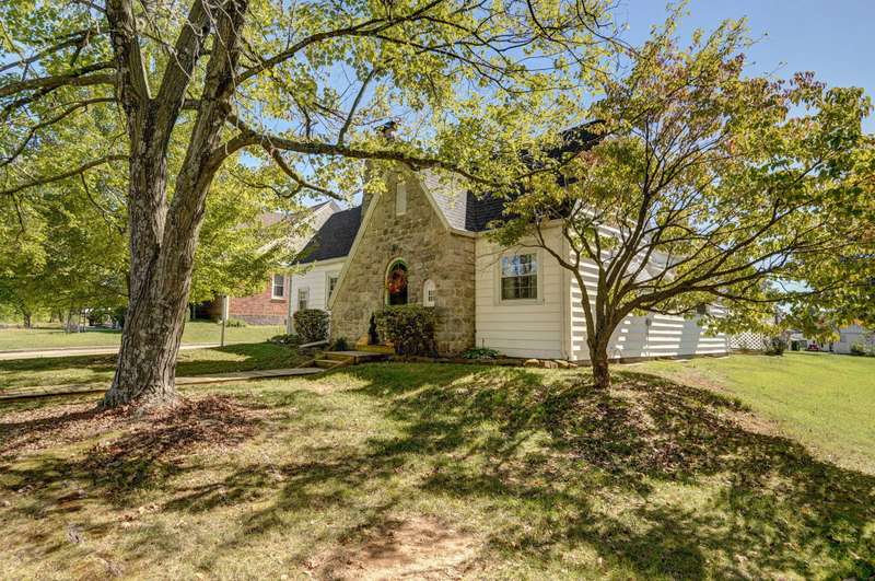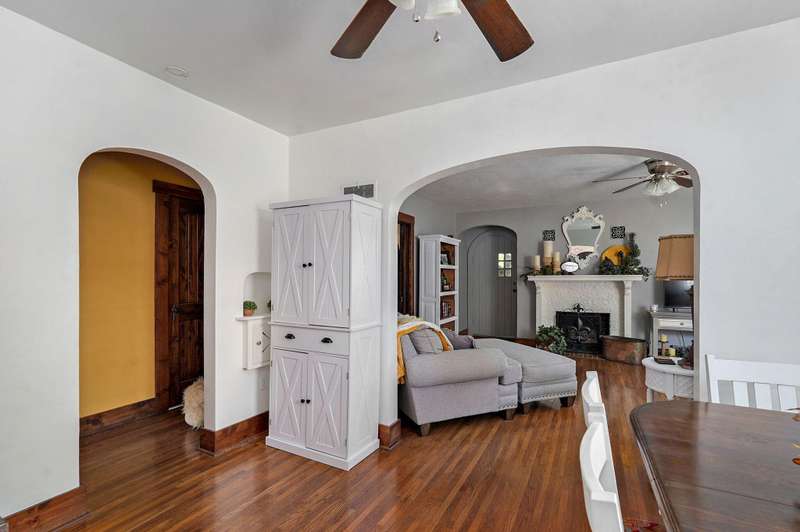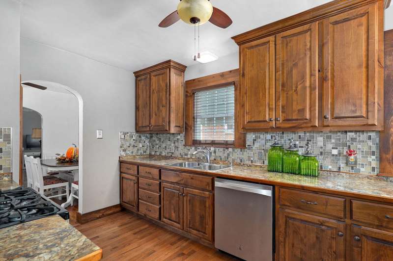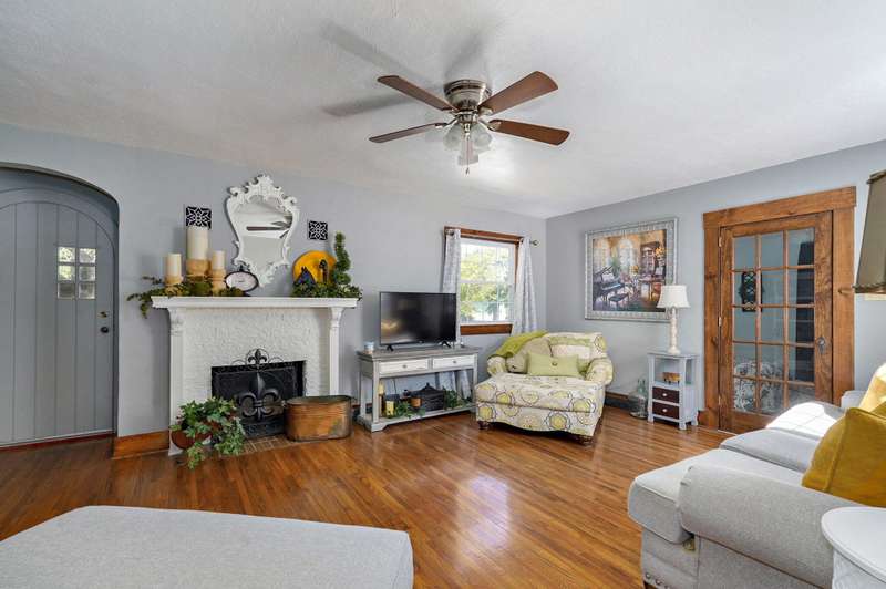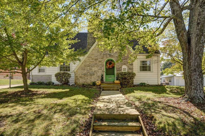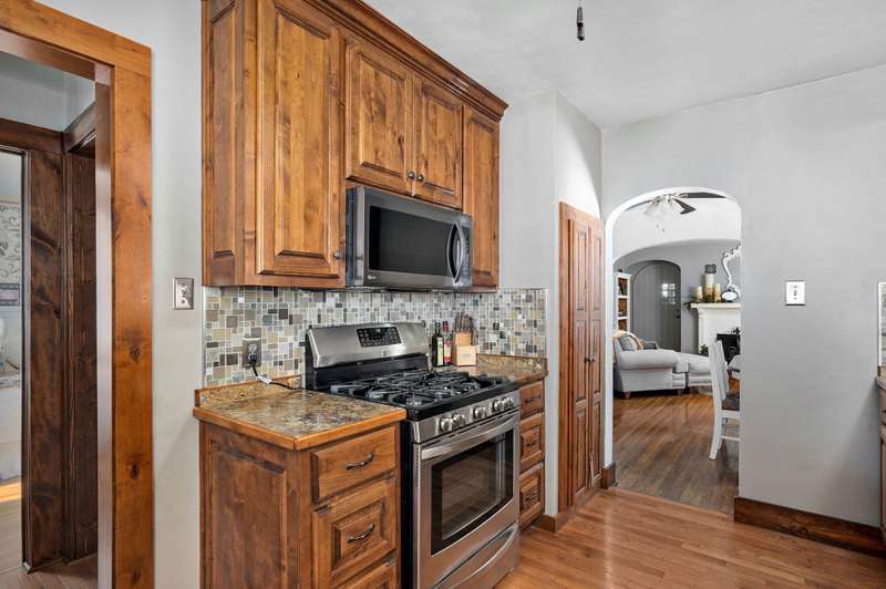 Fall in love with the amazing architectural details of this charming 1945 English-style bungalow. The stunning exterior showcases beautiful stonework, a peaked roofline with a unique ''catslide roof,'' and an original arched wooden entry door. Inside, the charm continues with original hardwood flooring and elegant arched doorways. The home's practical floor plan offers a great living space, including a large living room with a wood-burning fireplace and a great, light-filled kitchen. The kitchen and bath have been meticulously remodeled, and newer windows have been installed. The property is completed by a large, landscaped yard, a 2-car detached garage, a carport, and an oversized garage/workshop.