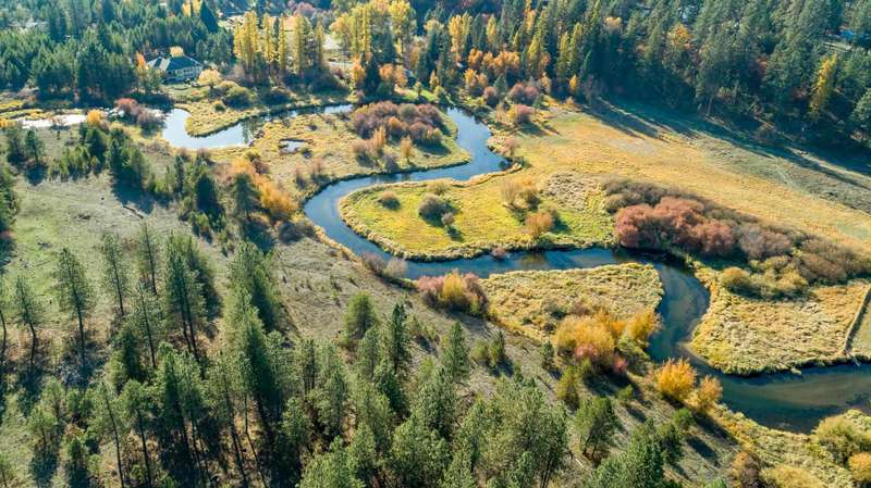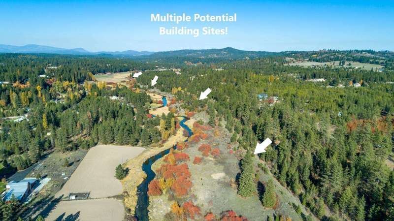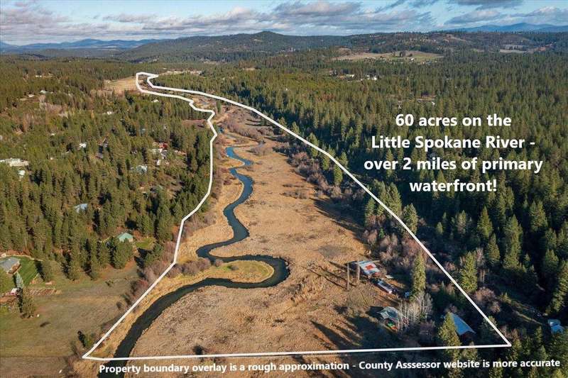 Unique opportunity to own 2 miles of primary riverfront along the exceptionally beautiful Little Spokane River. Elongated 60 acre parcel has a charming 1900 farmhouse with updated plumbing, electric, radiant floor heat and a high-end blaze-king wood stove in the basement that can heat the entire house. Multiple barns and outbuildings, and over 2 miles of extraordinary primary waterfront acreage with many ideal building sites, all elevated with views looking out over the Little Spokane River. 1.1 mile long 100' wide railroad parcel to east is for sale separately (from a neighbor) and would provide ideal access to the north section of this property. Located 15 minutes past the northside CostCo and just 30 minutes to downtown Spokane. This is an extraordinary opportunity! Value is in the land. Check out the full-length high-resolution AERIAL VIDEO at: www.youtube.com/watch?v=u3hbK8elJuo