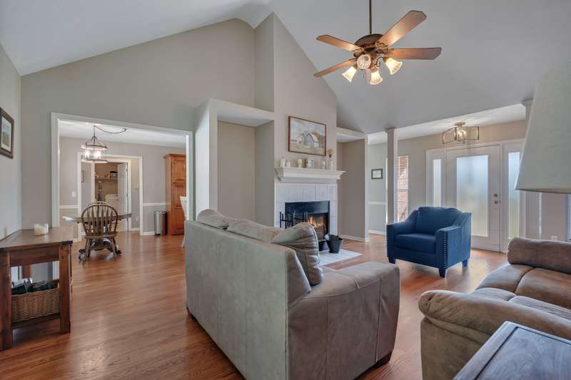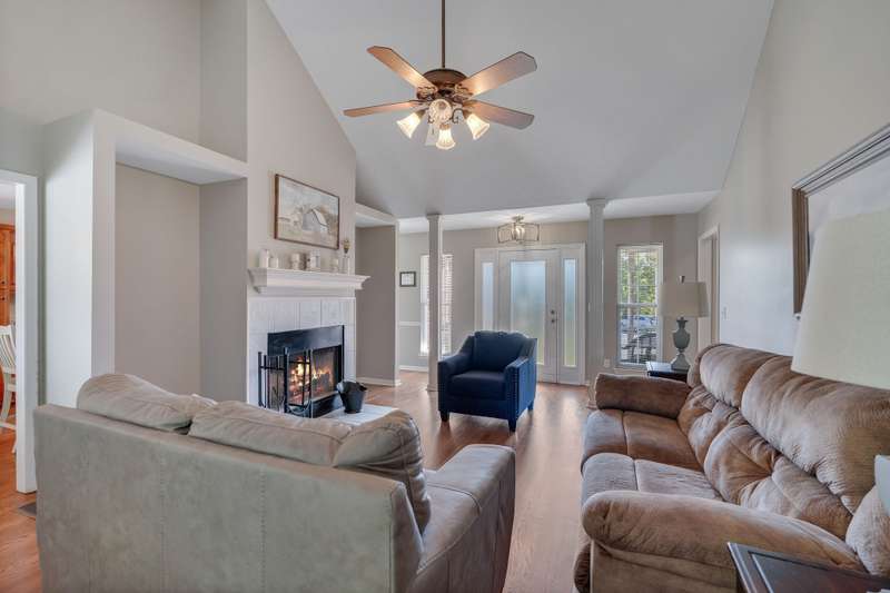 Step inside the welcoming foyer to find a thoughtful zoned bedroom layout that provides flexibility and privacy for family or guests. The dedicated dining room also makes an ideal home office space. You'll love the cozy fireplace anchoring the living area -- perfect for relaxing evenings at home.