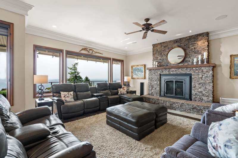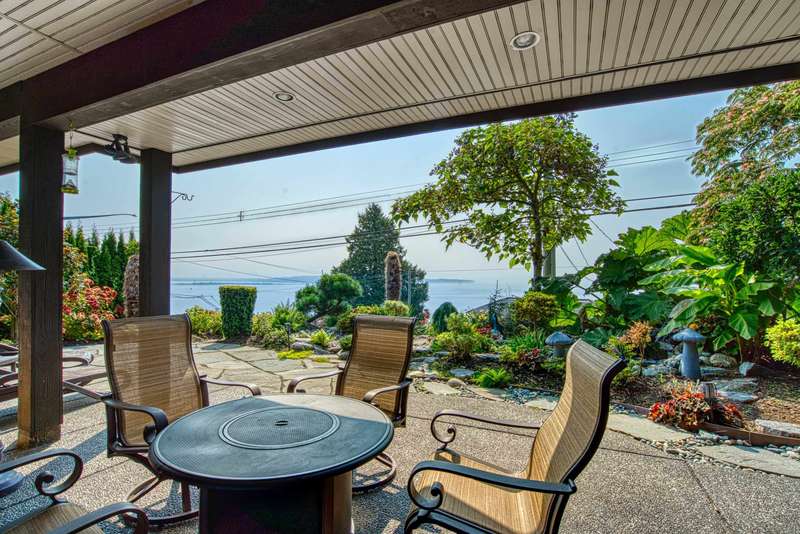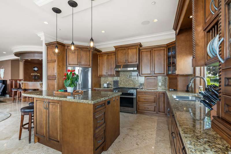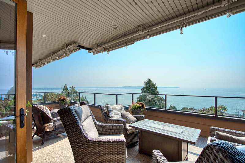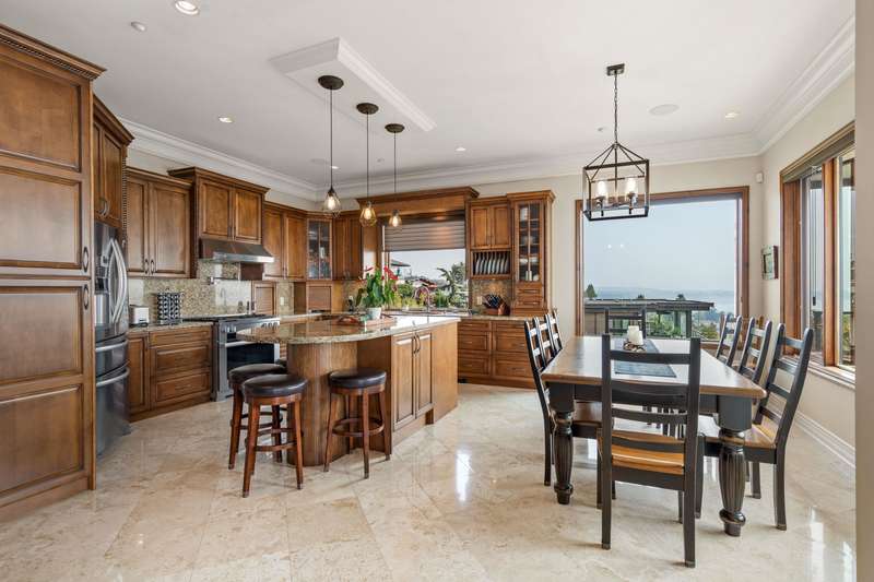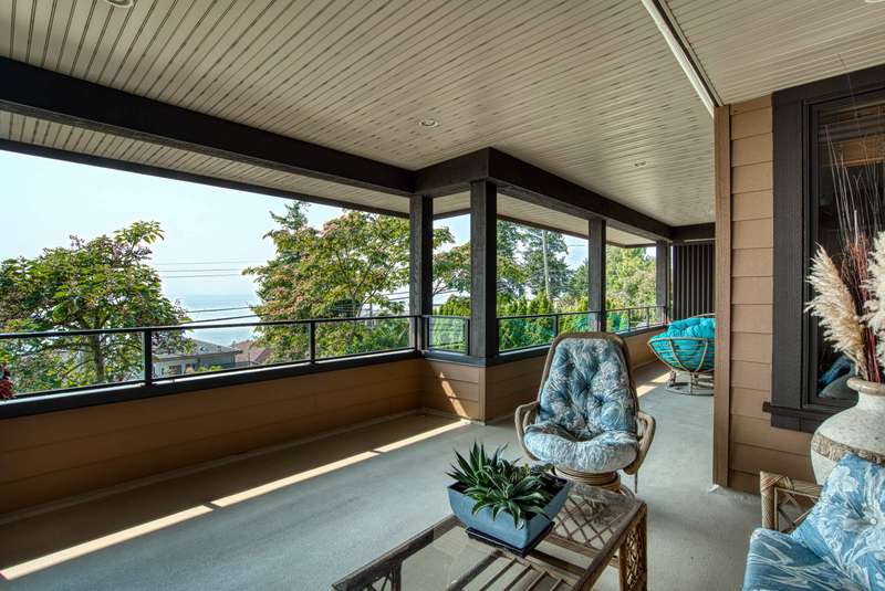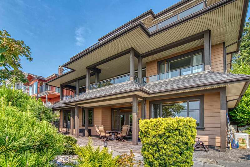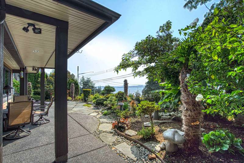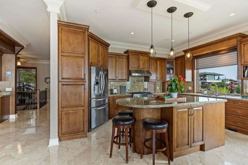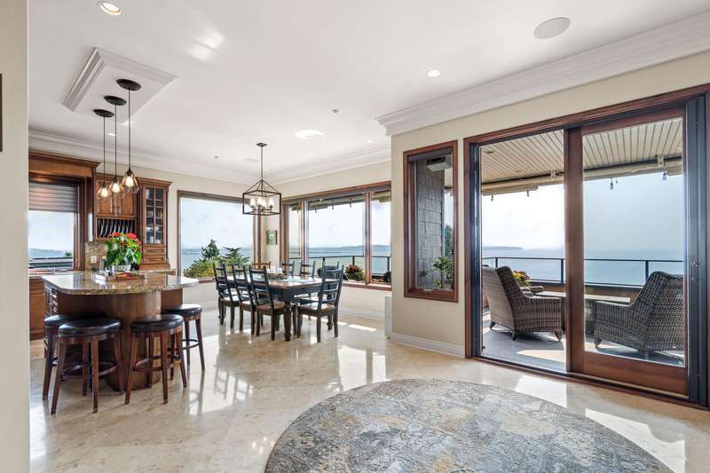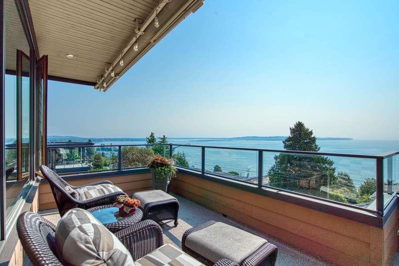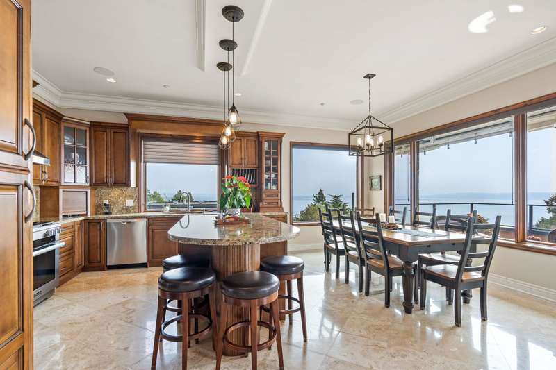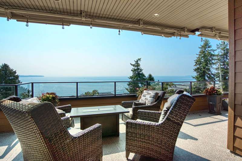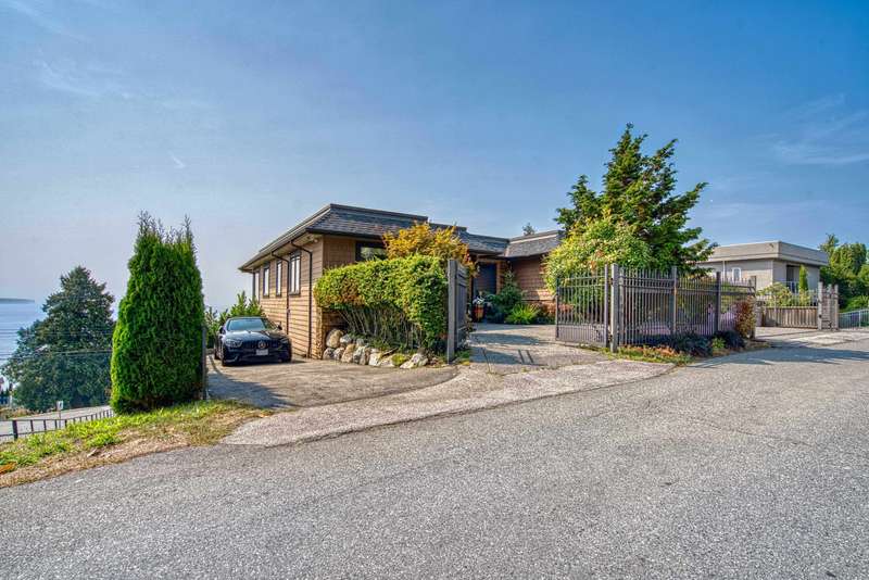 Sweeping ocean views from the moment you step inside the door. Very rare property with a fabulous 5653 sq. ft. home sitting on over a double lot of 8190 square feet next to parkland, with outstanding ocean views from all floors. Quality built with electric gate surrounding the level entrance & garage with excellent guest parking, 2x6 Douglas Fir construction, Pella wood windows with Low E, Travertine floors throughout main areas, dark stained Maple cabinets, granite counters, high end appliances, radiant in floor heat, control 4 lighting, sound system, butlers pantry, theatre room, hidden TV with remote, electric awnings, high ceilings on all floors. Bonus: legal 1 bedroom suite & separate area for guests. Gorgeous landscaping both front and back with water features. Outstanding home!