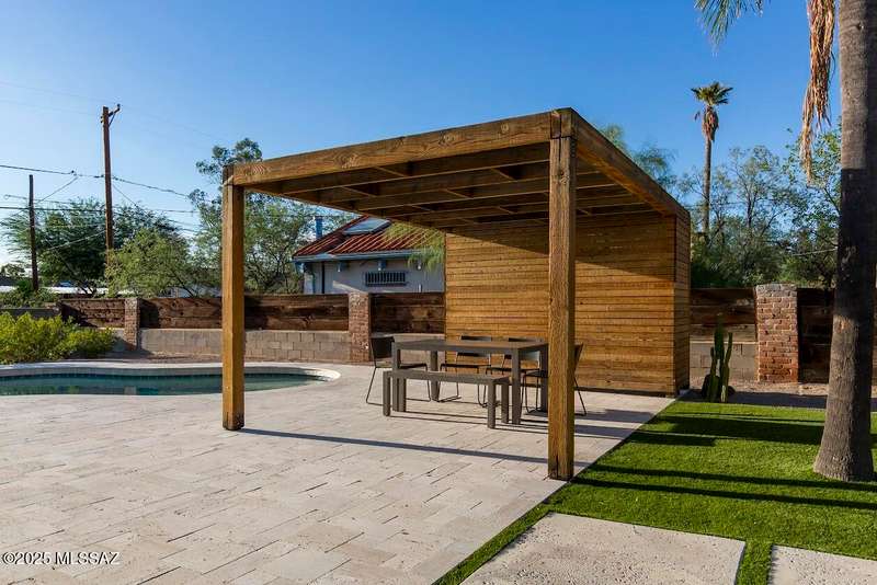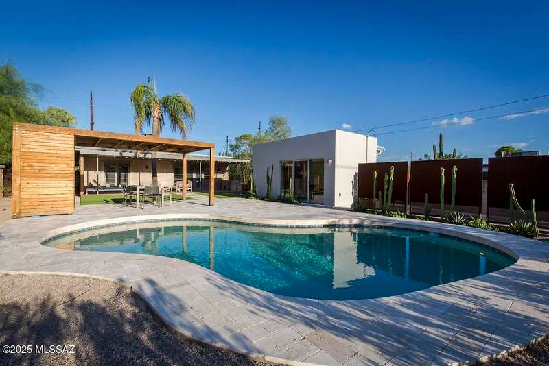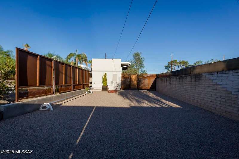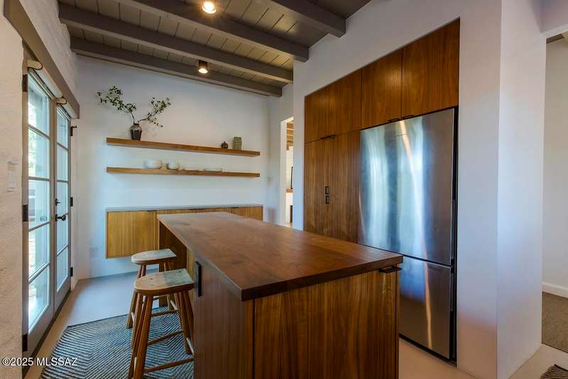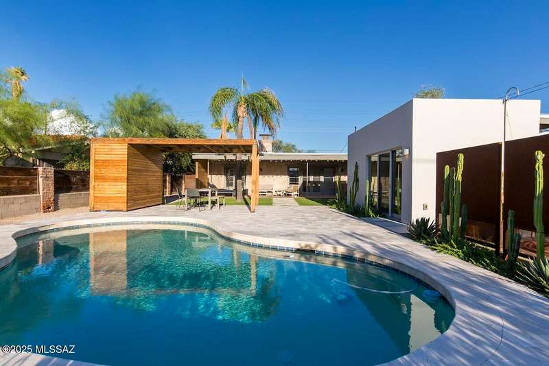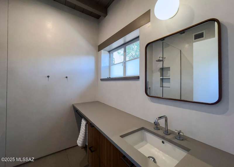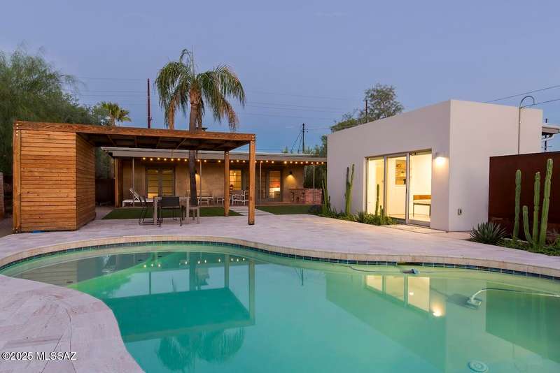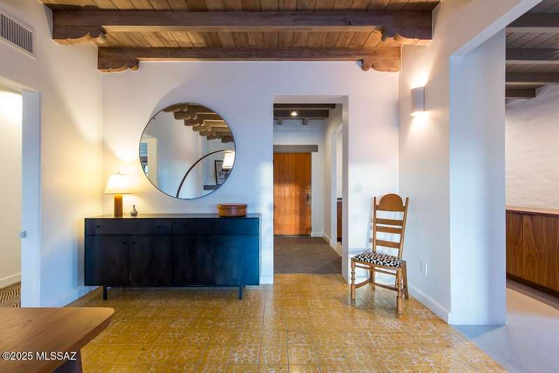 Stunning home that will appeal to architecture lovers, the remodel of this 1952 Josias Joesler, one of his last design projects, is true to the original, exposed adobe, hand-carved beams. Minimalist and modern, and coming up on Tucson Modernism Week, now is the time to make this treasure your own. The main home is 2 bd, 2 ba, and the casita can serve as a poolhouse and bath, 3rd bdrm & extra space for your guests. Minimalist and modern, casita added in 2022 by previous owners, who remodeled the home with local architects Ha-Ru and builder BaerWorks. The driveway beyond the casita is ideal for parking your Airstream, AND as your bike route exit, through the neighborhood to Natural Grocers, BBC, Session Yoga, Barrio Bread... all that the Joesler-designed village at the corner offers.
