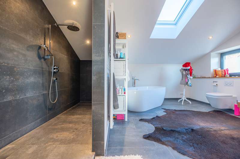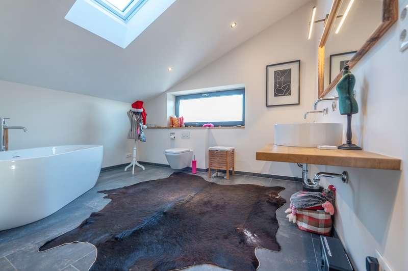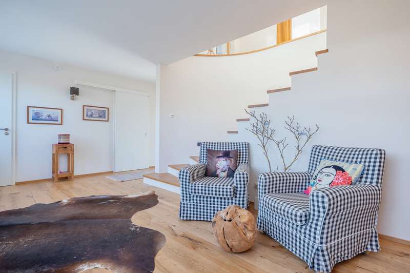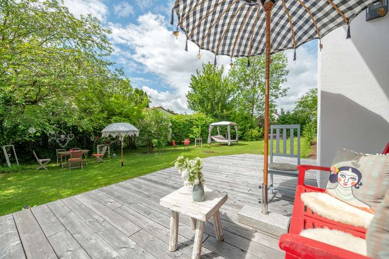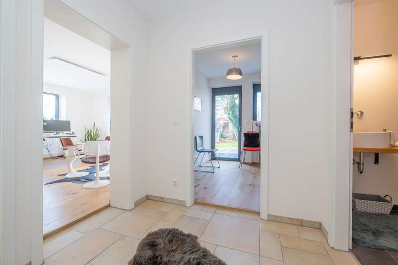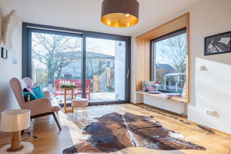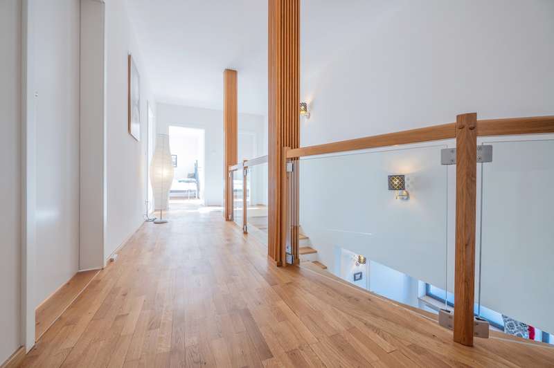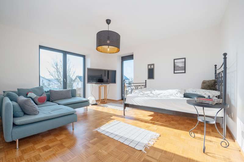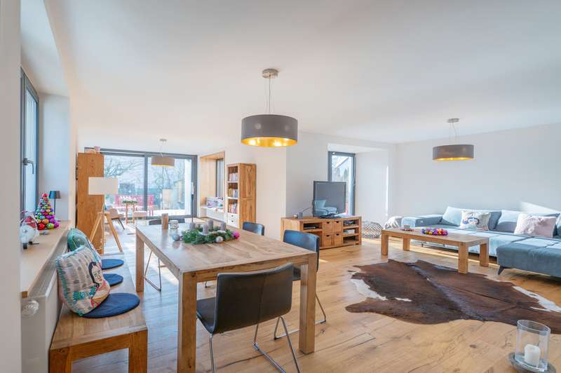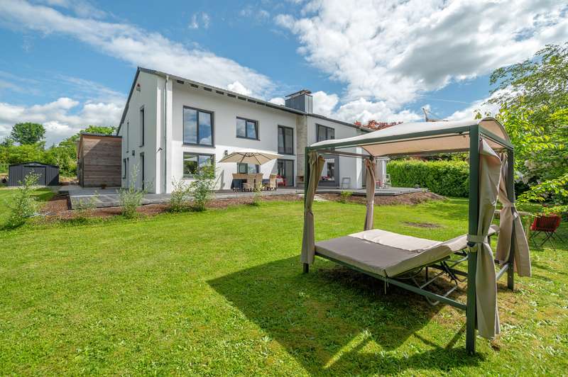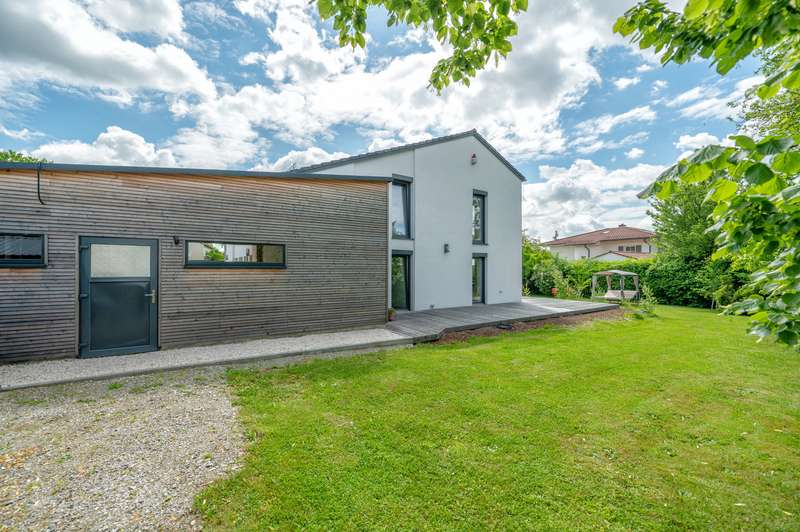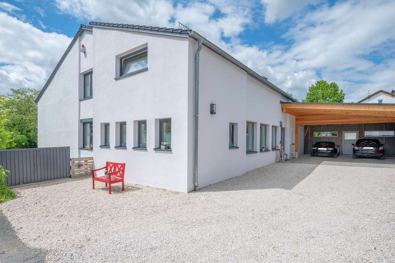For sale is a high-quality renovated detached house with a spacious granny apartment that combines modern living with timeless elegance. The property, built in 1961, was extensively renovated in 2022 and is situated on a spacious plot of approx. 1209 m² in a sought-after and central location in Eggenfelden. With a living space of approx. 250 m², spread over a total of 9 rooms, the house offers plenty of space for a variety of uses. The first floor welcomes you with an inviting and representative foyer, which impresses with an open staircase in solid oak. The open-plan living and dining area of approx. 45 m² impresses with real oak parquet flooring and large window fronts that offer a generous view of the mature garden. From here, you can access the spacious terrace of around 100 m² with an outdoor fireplace. The terrace is planked with extra-thick larch wood and extends over the entire south and west side of the house. The modern fitted kitchen meets all requirements and is equipped with an induction stove, a Bora extractor fan, a dishwasher and a solid oak worktop. A guest WC completes the space available in the main living area on this level. On the upper floor, a gallery leads to the bedrooms. The master bedroom not only offers plenty of space on approx. 35 m², but also its own en-suite master bathroom with natural light, free-standing bathtub, separate floor-level shower area, double washbasin, WC and electric underfloor heating. Two further rooms, which are ideal as guest or children's rooms, as well as a separate dressing room and an additional shower room complete the upper floor. High-quality details such as refurbished solid oak parquet flooring and electrically operated skylights underline the high standard. The granny apartment on the first floor with separate entrance extends over approx. 70 m² and offers two rooms, a fitted kitchen and a bathroom with shower and electric underfloor heating. This unit is ideal as a practice, office or guest apartment. From here you also have access to the spacious garden, which offers numerous design options. The basement of the house, which has separate access, houses a wine cellar as well as several storage rooms. A carport with space for two cars and additional parking spaces in the driveway are available for vehicles. A modern balcony power plant on the carport supports the energy efficiency of the property, which is rounded off by a new pellet heating system and a decalcification system. This property combines modern living comfort with a well thought-out room layout and high-quality fixtures and fittings. The central yet quiet location in Eggenfelden, just a 5-minute walk from the town square, offers an ideal combination of urban infrastructure and living close to nature. A viewing is essential to discover the full potential of this special home. Make an appointment today to see this unique offer for yourself.
