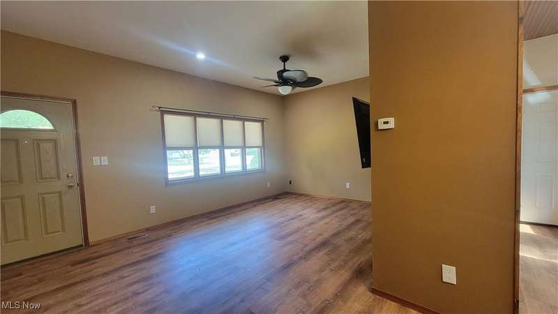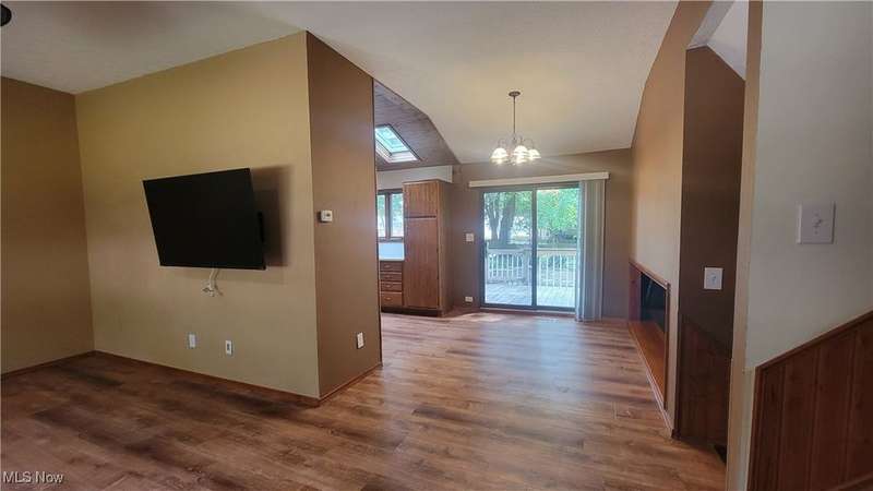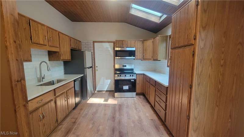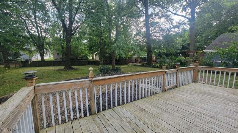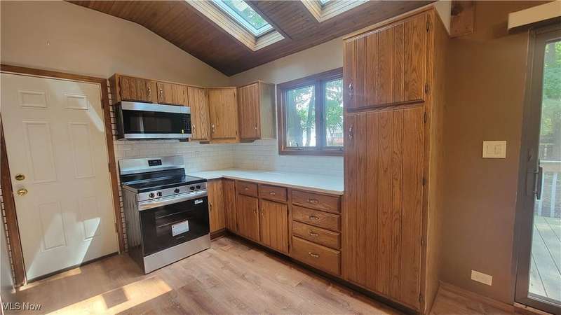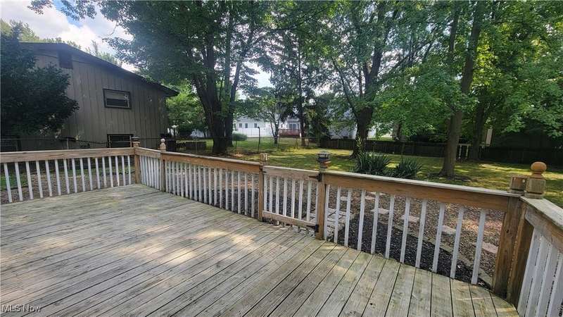 Updated home with modern features throughout! Enjoy newer vinyl flooring in the living room, dining room, kitchen, upstairs, and hallway. The kitchen boasts quartz countertops, stylish backsplash, and updated appliances including a refrigerator, 5-burner electric range, and microwave. A sliding door off the dining room opens to a spacious deck overlooking a fully fenced, tree-lined backyard. The lower level offers a cozy family room with built-in shelving, a convenient half bath, and laundry area with washer and dryer included. The main bathroom was remodeled in 2019 and features a Bluetooth-controlled exhaust fan. Peace of mind comes with many recent upgrades: roof over the bedroom level (2018), roof and skylights above the living room, dining room, and kitchen (2023), exterior waterproofing on the lower level (2022), and a 50-gallon hot water tank (2019). Additional highlights include a 1-car attached garage, storage shed, and solar-powered motion detector lights on the front and side of the home. This home is move-in ready!