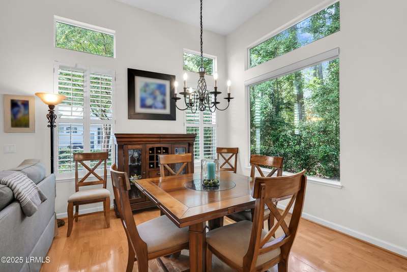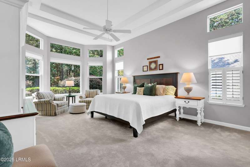 Located on a tranquil court in Sun City Hilton Head lies a rare and refined Del Webb Marion Webster Estate Model-a one story home showcasing soaring 12 foot ceilings and is enveloped by a serene wooded view. The expansive layout encompasses 2 bedrooms, 2.5 bathrooms and includes a versatile den/office/library thoughtfully equipped with a Murphy bed, offering the option of a third bedroom. This home includes two living rooms, one is equipped with built ins and a cozy fireplace. Other upgrades include a new A/C, two car garage PLUS golf cart garage, a spacious primary suite w/a closet equipped with custom shelving & an expanded screen lanai which is the perfect space to unwind while admiring views of the water fountain and secluded woods. There are too many upgrades to list, this home is a