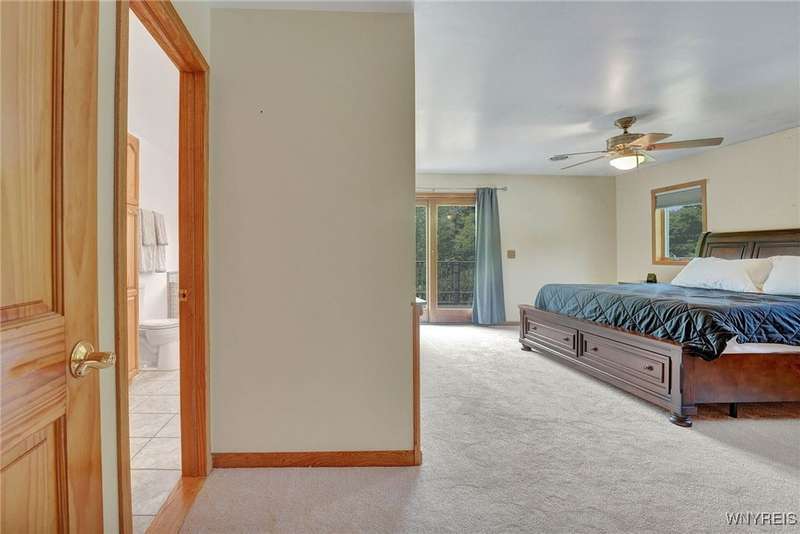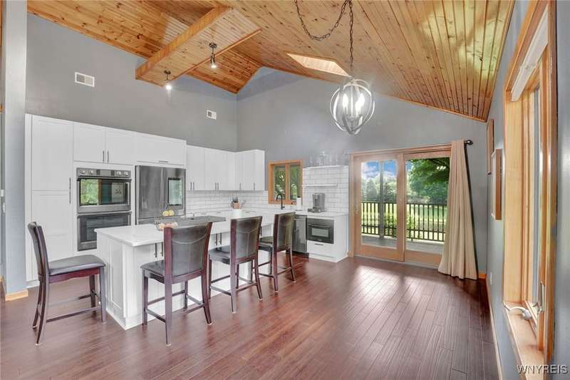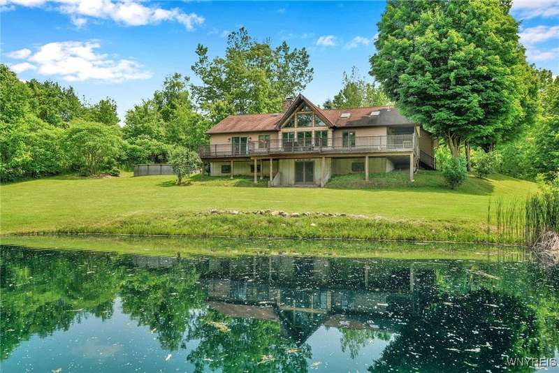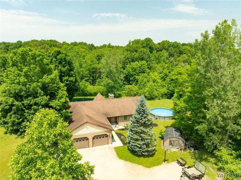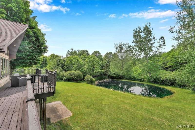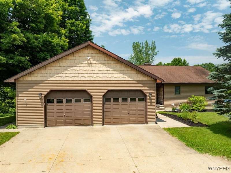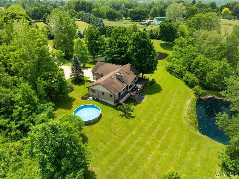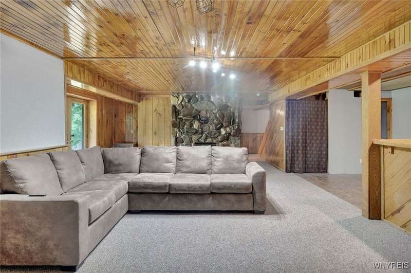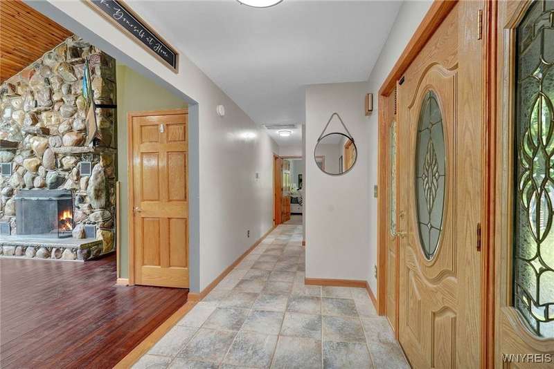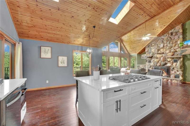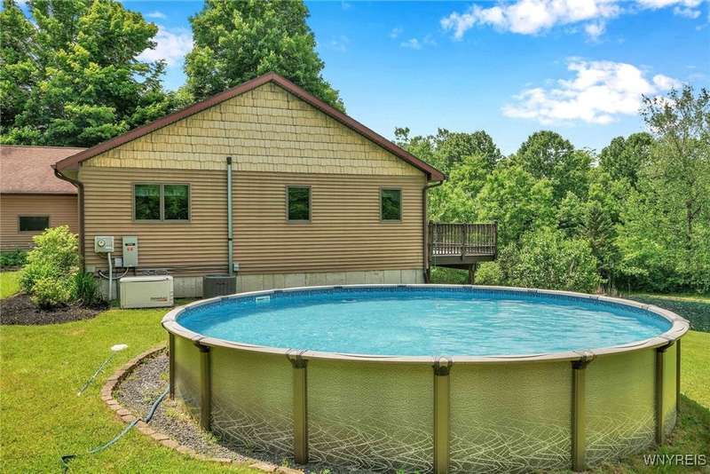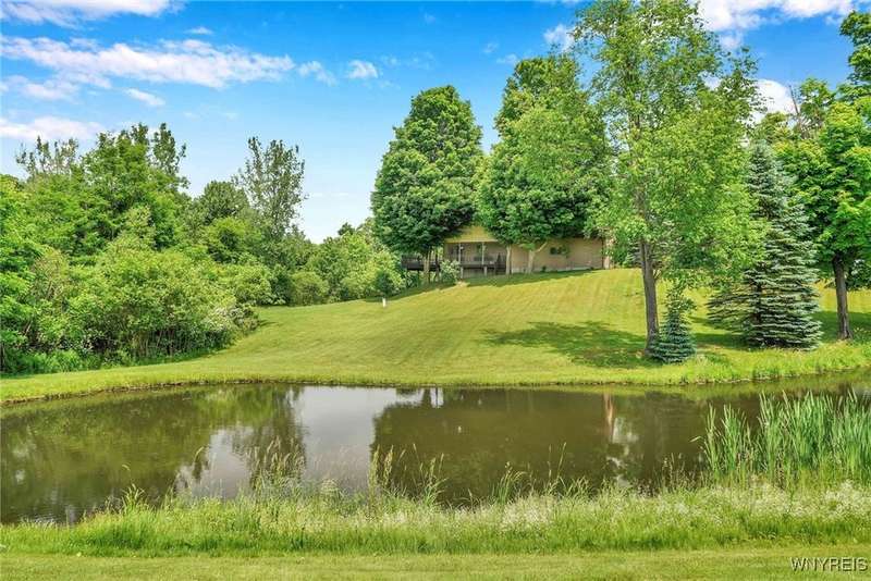 A long blacktop/concrete driveway leads to this stunning private oasis! Two ponds, 18+acres of privacy, woods and wonderful views from the large deck. Step inside to the front foyer which leads to the great room with cathedral ceilings and stone fireplace. A beautiful newly installed custom kitchen features a large center island with quartz countertops and appliances! The kitchen/dining/great room combo has new bamboo flooring & new lighting. The primary bedroom has brand new carpet and its own full bath. The lower-level walk out basement adds a rec room with bar, third bedroom and a full bath. Radiant floor heat on both floors and it has been recently serviced. New whole house generator just installed so no worries if the power goes out. First floor laundry, on demand hot water, central air, and the deck was recently stained. This lovely hillside ranch has much to offer and so many updates.