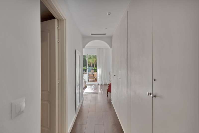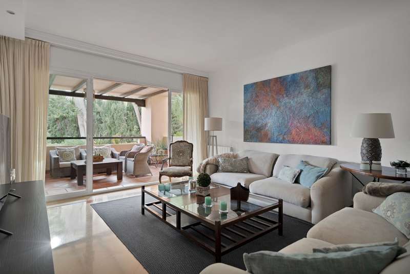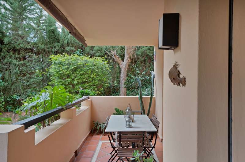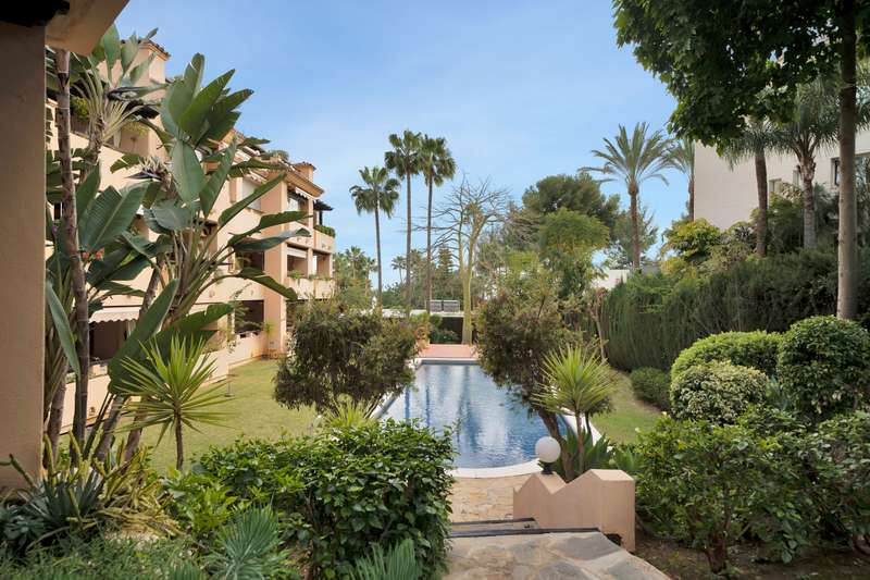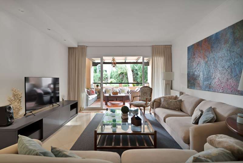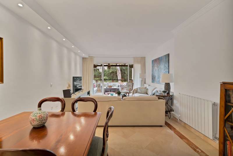 Experience luxury and comfort in one of Marbella's most exclusive areas! This elegant ground-floor apartment is located in a prestigious gated community in Nagüeles, just 6 minutes walking from The British International School of Marbella and 5 minutes from the beach. With 185 m² built area (159 m² usable area), it offers a spacious living-dining room with access to a private southwest-facing terrace, overlooking the complex's tropical gardens, ideal for relaxing or enjoying the outdoors. The separate, fully equipped kitchen includes a utility room, designed to facilitate daily living. It has three double bedrooms, all with en-suite bathrooms and built-in wardrobes. The master bedroom has direct access to the terrace, while another bedroom includes a cozy outdoor space enclosed with glass curtains, perfect as an office or study area. The apartment is in excellent condition and is ready to move into, although it also offers interesting options for updating. It includes a two-car gara