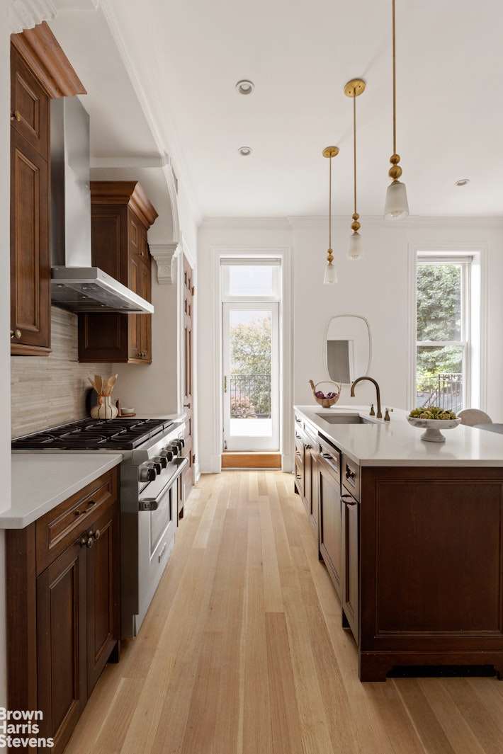 From the moment you step inside, the home's original stone mantels, ornate plasterwork ceilings, pocket doors, and a prominent central staircase speak to its storied past. Yet every space has been reimagined for modern living. The parlor-level chef's kitchen blends historic charm with high-performance design, featuring custom cabinetry, Caesarstone Quartz countertops, period-inspired pendant lighting, and a top-tier appliance suite including a Wolf range and hood, Sub-Zero refrigerator, and Miele dishwasher. Bronze fixtures and gleaming hardwood floors round out this inviting space, ideal for both everyday living and entertaining.