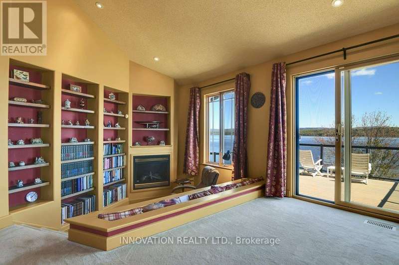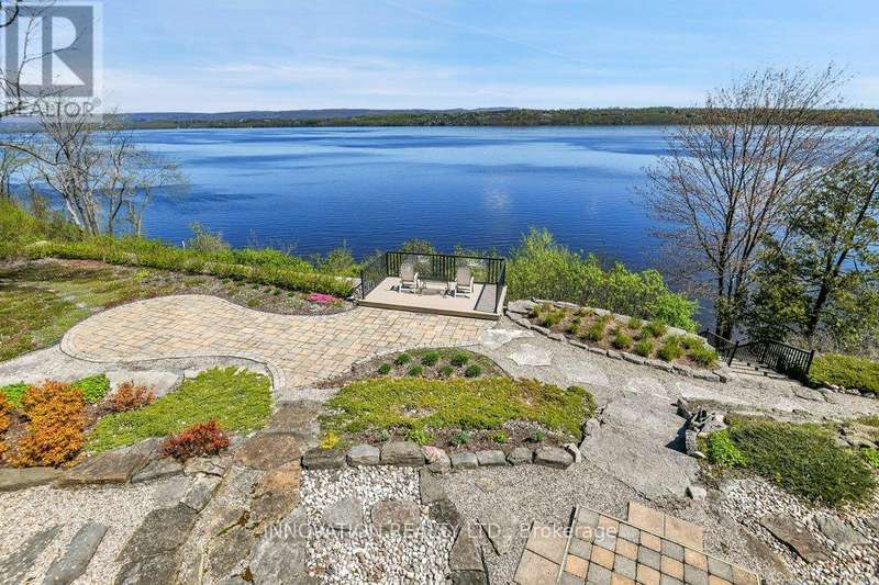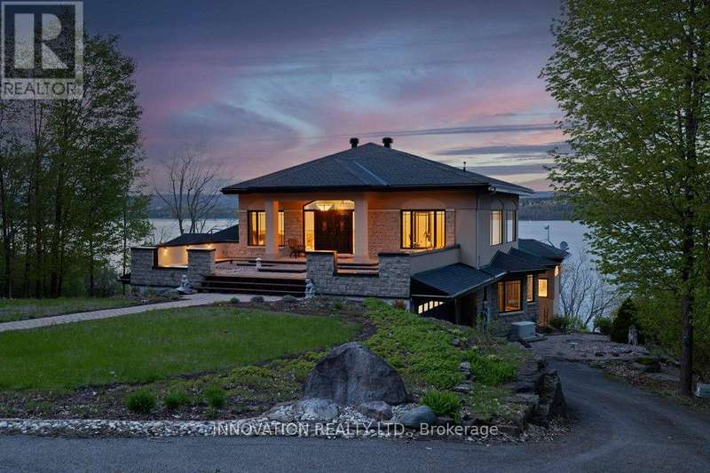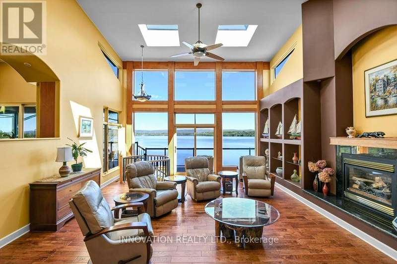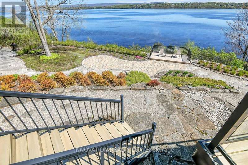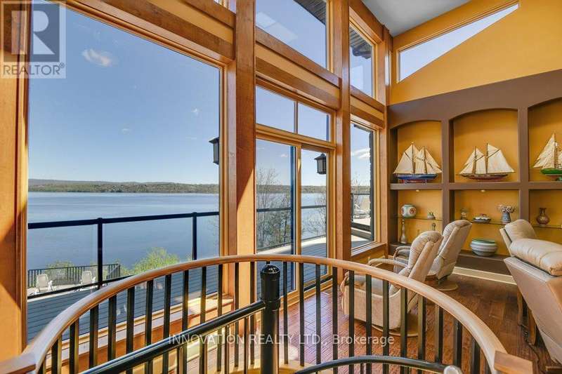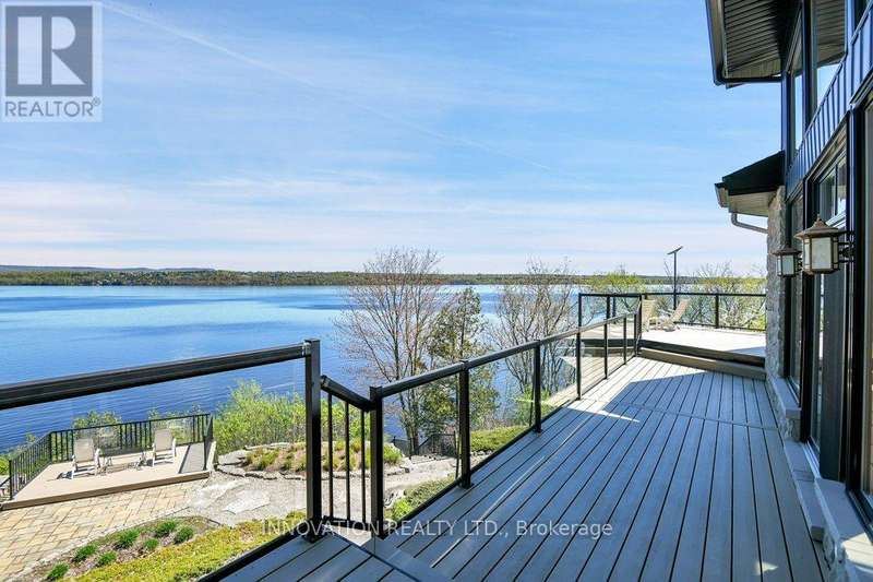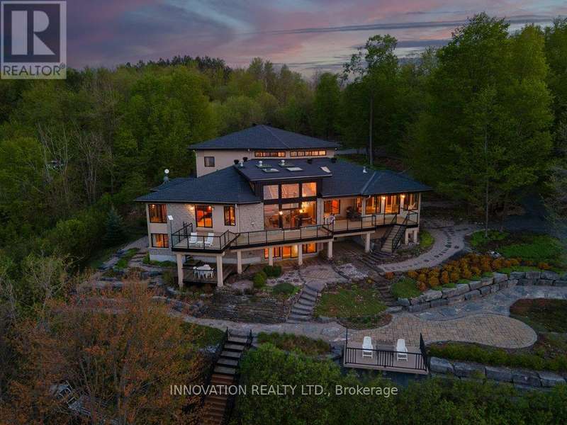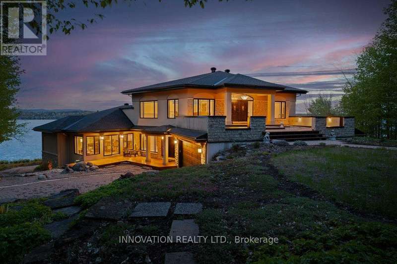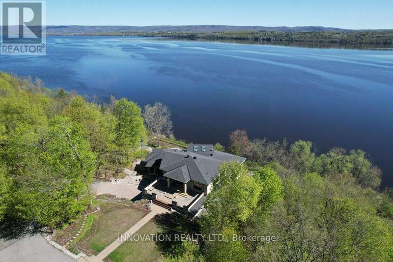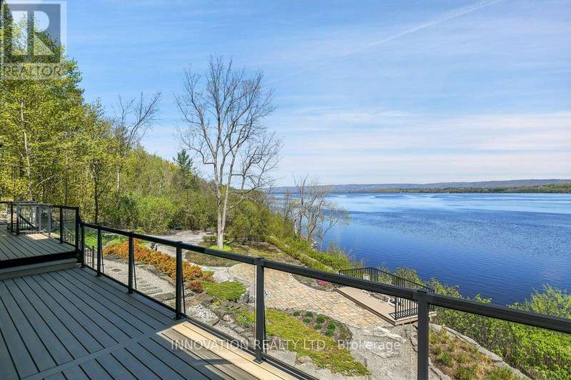 EXCEPTIONAL RIVERFRONT PROPERTY Perched safely above the Ottawa River this substantial highly customized home is designed to capture breathtaking views with private river access. Very private 1.59 acre property with 200ft riverfront. 180 degree views up & down river with fabulous city skyline vistas to the east. 4960 sqft of living space above grade plus almost 2000 sqft finished space in the walkout lower level. Unassuming entry loft level opens to large open concept space as you descend the stairs giving an indication to the scale of this home. Artisan built natural stonewalls respect the rocky terrain. Customized at every corner & curve each space takes advantage of walls of windows to feature views of river & Gatineau Hills and the customized gardens all around the property. Great Rm has lofty ceilings w/skylights, fireplace, and circular staircase to the Recreation Room below. Kitchen is central to Dining & Family Rm. This well equipped Kitchen is perfect for entertaining. Very large Dining Room is accented by natural stone walls and arches. Family Room next to the Kitchen offers lovely garden views with afternoon sun & a fireplace. Spa space offers hot tub, sauna, rain shower + bathroom. Primary Bedroom suite has it all: corner windows w/views of the city skyline, deck, sunken Library, 5pc Ensuite & spacious Walk-in. 2 main level secondary Bedrooms each have Walk-ins, 3 piece Ensuites & loft spaces accessed by spiral stairs. Finished walkout lower level provides for a 2nd Family Room with a bar, Recreation Room, Media Room, 2 additional Bedrooms, a 3 piece Bathroom, and another Office. There is also a workshop, two utility rooms, and several storage areas. Extensive landscaping w/rock gardens, Trex decks, stairs to rocky shore & dock. Rare offering. 4 bay drive through garage. Generac generator for automatic transfer to the whole home if Hydro goes out. Located in Rural Kanata North along millionaires row, just minutes to many amenities. (id:6509)