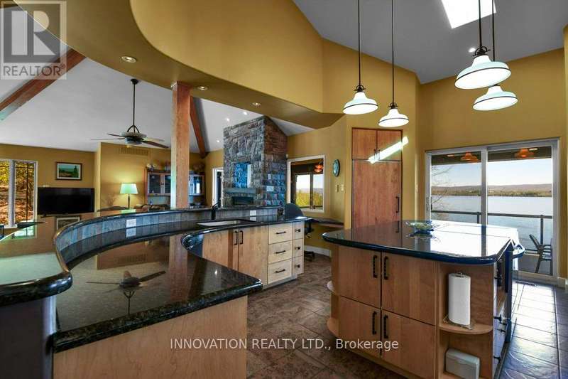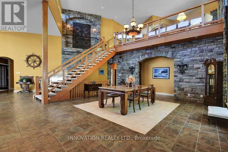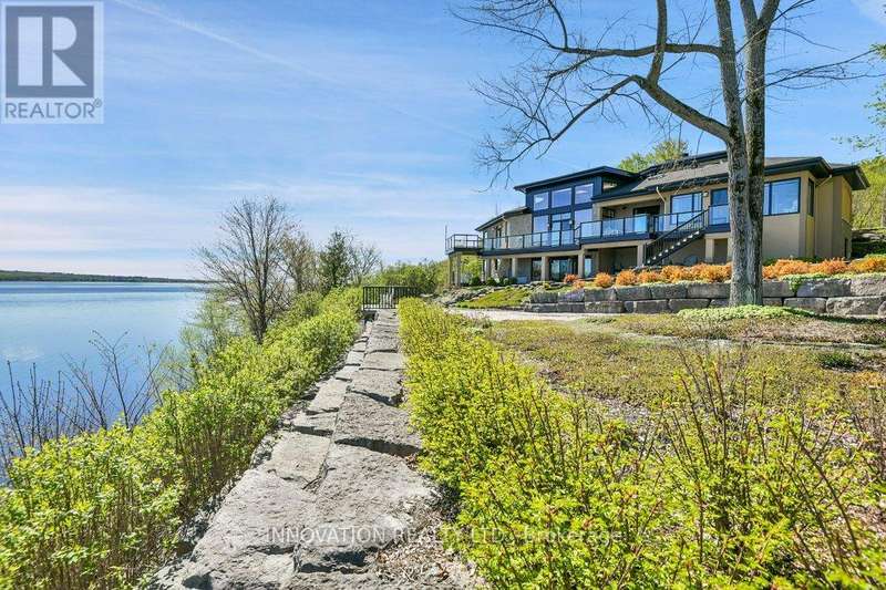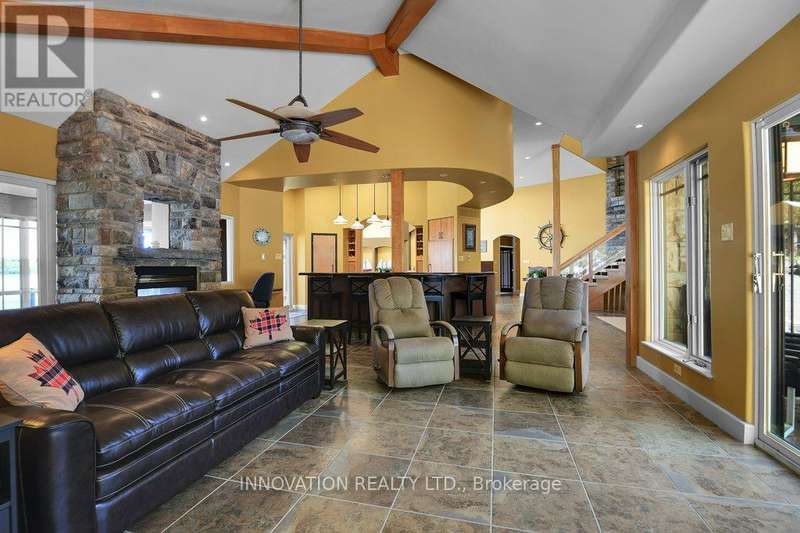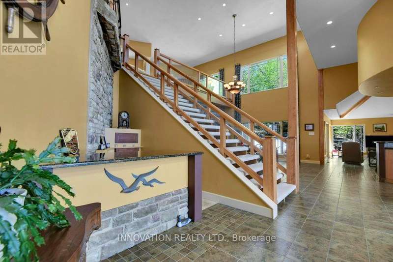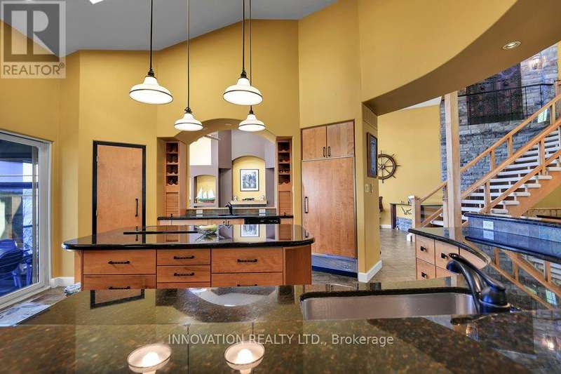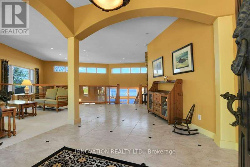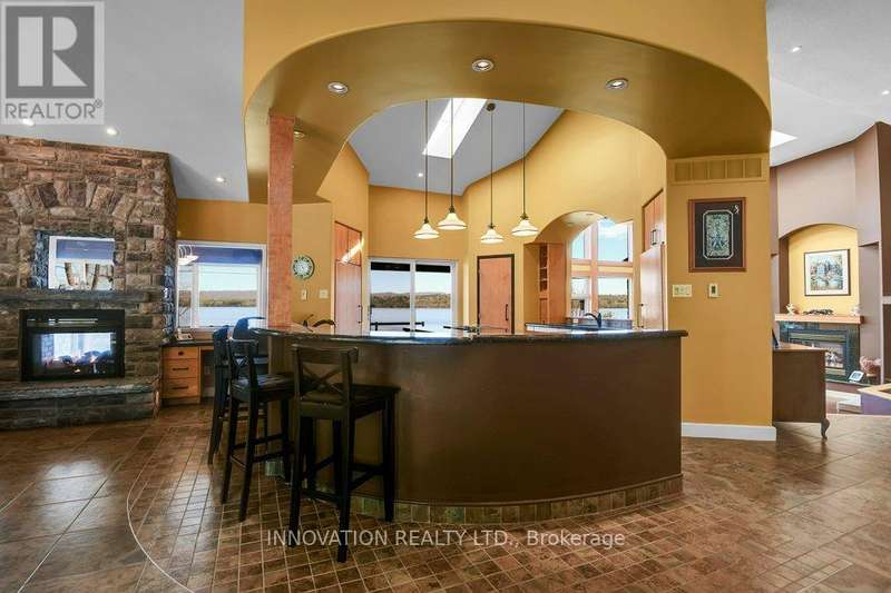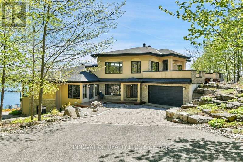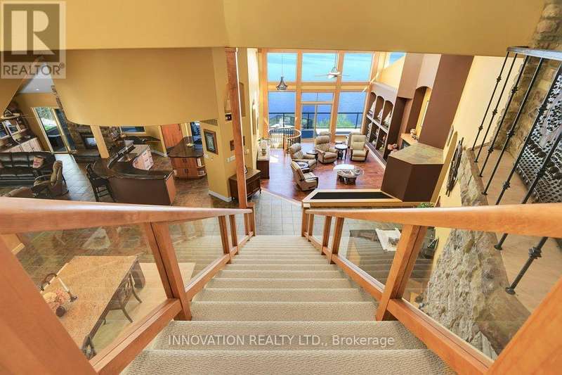 EXCEPTIONAL RIVERFRONT PROPERTY Perched safely above the Ottawa River this substantial highly customized home is designed to capture breathtaking views with private river access. Very private 1.59 acre property with 200ft riverfront. 180 degree views up & down river with fabulous city skyline vistas to the east. 4960 sqft of living space above grade plus almost 2000 sqft finished space in the walkout lower level. Unassuming entry loft level opens to large open concept space as you descend the stairs giving an indication to the scale of this home. Artisan built natural stonewalls respect the rocky terrain. Customized at every corner & curve each space takes advantage of walls of windows to feature views of river & Gatineau Hills and the customized gardens all around the property. Great Rm has lofty ceilings w/skylights, fireplace, and circular staircase to the Recreation Room below. Kitchen is central to Dining & Family Rm. This well equipped Kitchen is perfect for entertaining. Very large Dining Room is accented by natural stone walls and arches. Family Room next to the Kitchen offers lovely garden views with afternoon sun & a fireplace. Spa space offers hot tub, sauna, rain shower + bathroom. Primary Bedroom suite has it all: corner windows w/views of the city skyline, deck, sunken Library, 5pc Ensuite & spacious Walk-in. 2 main level secondary Bedrooms each have Walk-ins, 3 piece Ensuites & loft spaces accessed by spiral stairs. Finished walkout lower level provides for a 2nd Family Room with a bar, Recreation Room, Media Room, 2 additional Bedrooms, a 3 piece Bathroom, and another Office. There is also a workshop, two utility rooms, and several storage areas. Extensive landscaping w/rock gardens, Trex decks, stairs to rocky shore & dock. Rare offering. 4 bay drive through garage. Generac generator for automatic transfer to the whole home if Hydro goes out. Located in Rural Kanata North along millionaires row, just minutes to many amenities. (id:6509)