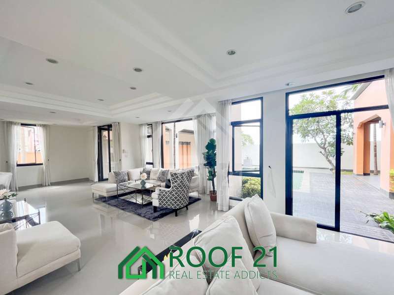 The villa features a private swimming pool with a covered roof, spacious car park, and carefully designed interiors with warm, inviting ambiance. The first floor includes a large living area, dining space, and modern kitchen, perfect for everyday living and entertaining.