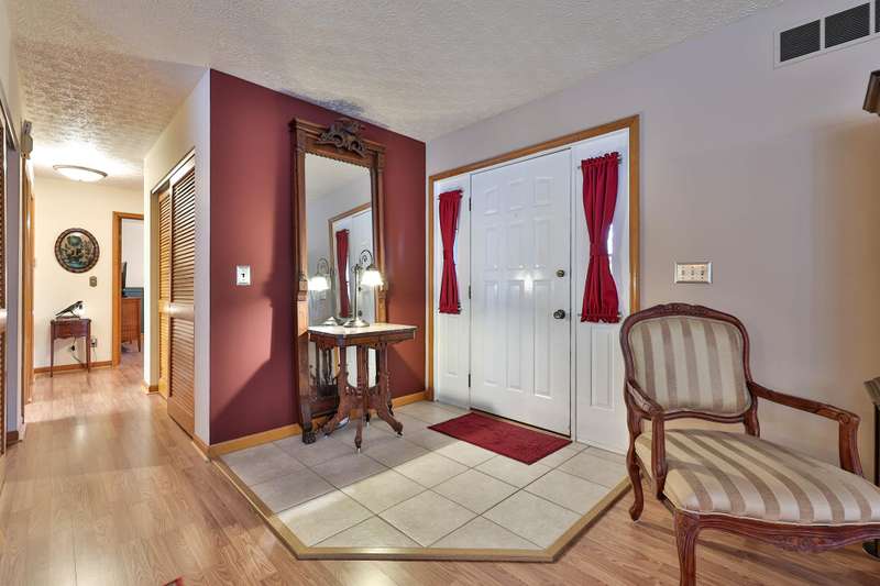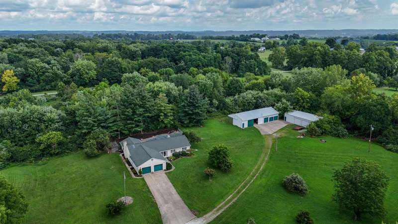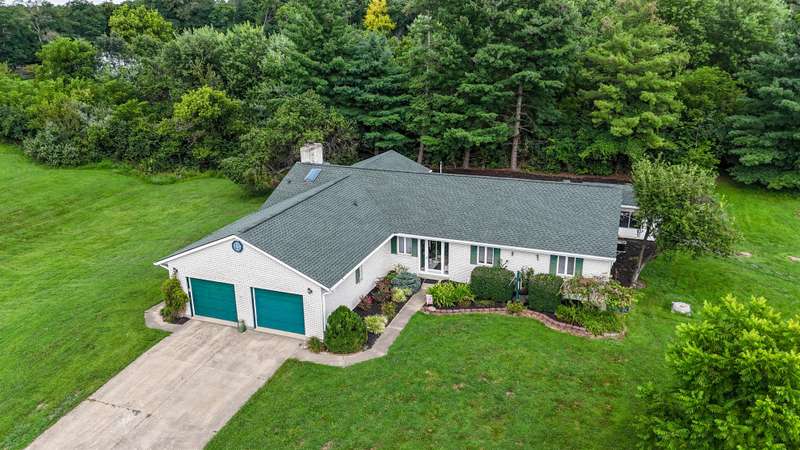Spacious Custom Built Ranch on gorgeous 5.48 Acre private setting-Open Floor plan-Living room with bay window-Dining room with full brick wood burning fireplace-Eat in Kitchen with 10 ft counter bar and skylight-Anderson casement windows-12"poured foundation-Three Season room off Dining room-Inground pool with pool house-Hobbyist Dream with 2 outbuildings (1) 2190 sq. ft with concrete floor, 220, compressor-25x12 air conditioned work shop with car lift-29x20 paint booth - (2) 1620 sq. ft. pole barn with 3 10 ft. doors- 1y warranty