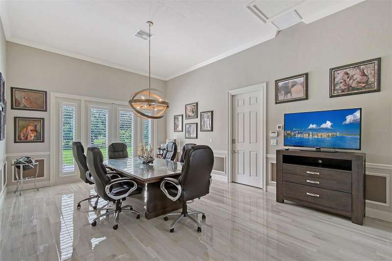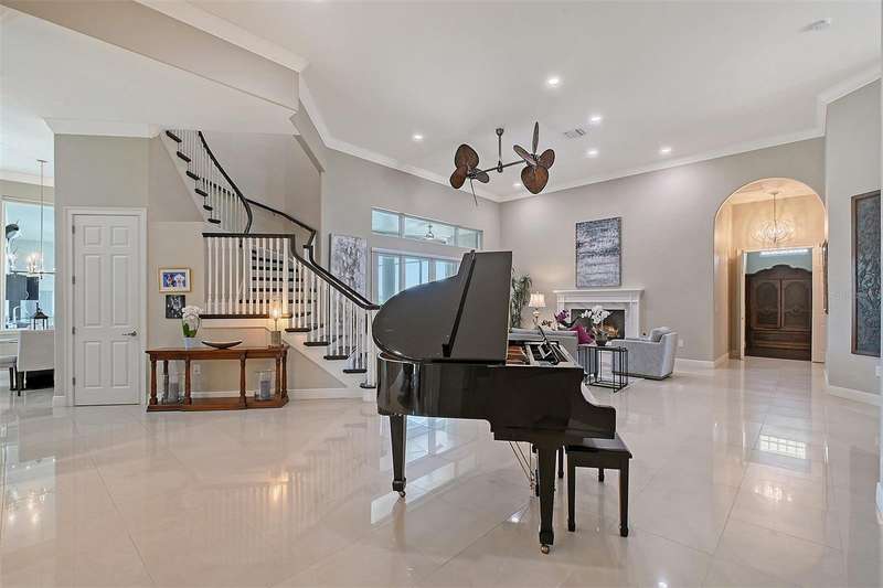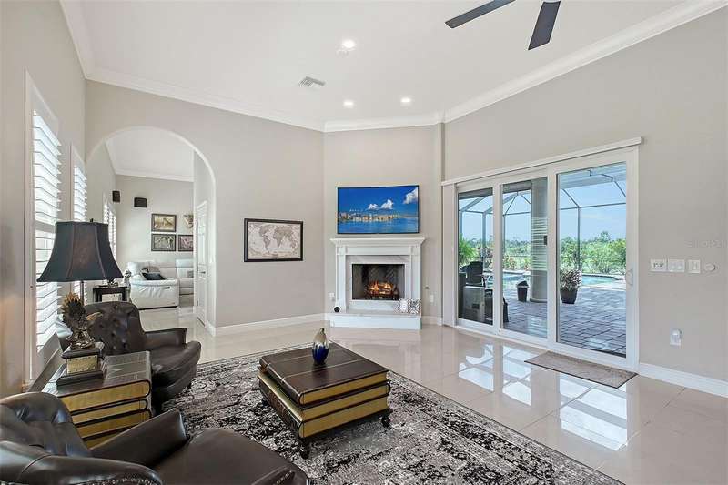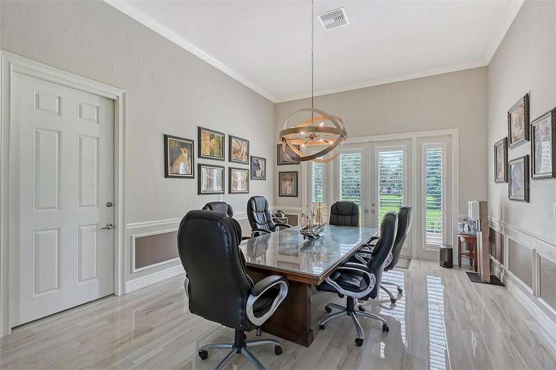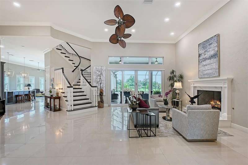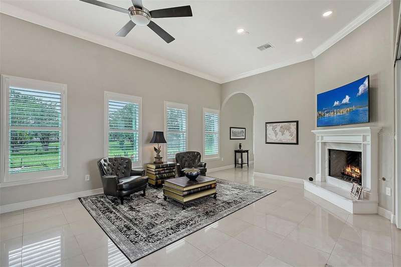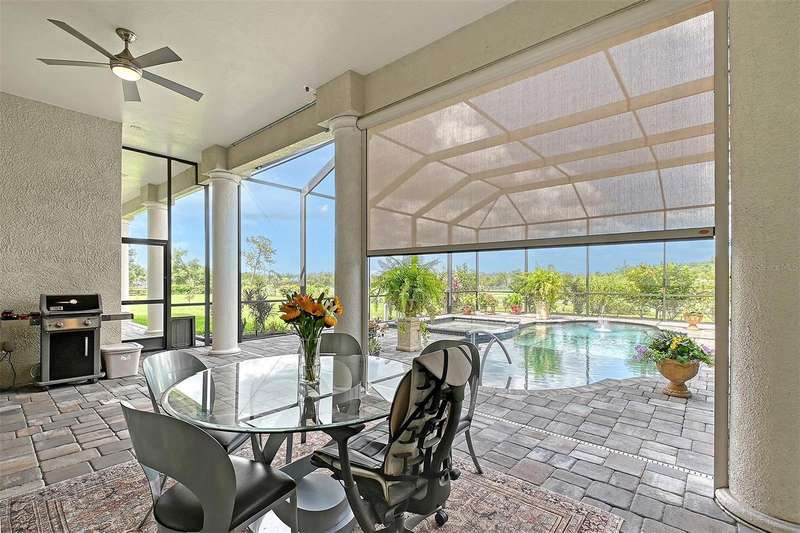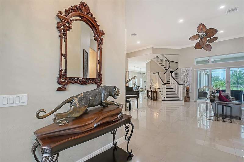 Visualize what quiet luxury looks like. It starts with passing through the electronic gate, down the long, tree-lined driveway, nestled between lighted ponds with twin fountains, leading towards this stately 5,000+ sq ft home on over 5 acres. The entry courtyard features a welcoming custom bronze fountain and a brick-paved portico leading to a double French door entry. Sweeping into the living room with 12-foot ceilings, tile floors, and a fireplace, you'll pass the private office with a built-in desk and shelves. The formal dining room features a majestic coved ceiling and French doors to a side patio. The modern kitchen with stainless appliances offers an enormous amount of cabinet and counter space, opening to a breakfast nook and family room with a second fireplace. A media room, tech closet with Wi-Fi tower, and a half bath are steps away. Beyond that is a private in-law suite currently used as an office with a conference room/living room, bedroom, private bath, kitchenette, and private entry. Also located on the main floor is a luxurious primary bedroom suite with 2 generous closets and an ensuite bath, as well as a 2nd bedroom with an ensuite bath, a hobby room, and a laundry room. Located up the sweeping staircase are 3 bedrooms, 2 bathrooms, a small lounge area, a large storage room, and a covered balcony. The screened-in pool offers two large lounging spaces and stone pavers overlooking the lush pasture out back. In 2020, the entire property underwent an extensive renovation, including, but not limited to, a new roof, plumbing, multiple HVC systems, new pool and spa, brick pavers, concrete driveway, multiple new fountains, fresh landscaping and sod, all windows older than 2018 were upgraded, electrical wiring replaced, all new flooring, all bathrooms and total kitchen were remodeled, giving this 5,000+ sf home an effective age of 2020. The owner also added a 24-kw whole-house generator, a reclaimed water irrigation system covering the entire 5-acre property, and a 500-gallon propane tank. This is an amazing home at an incredible price!