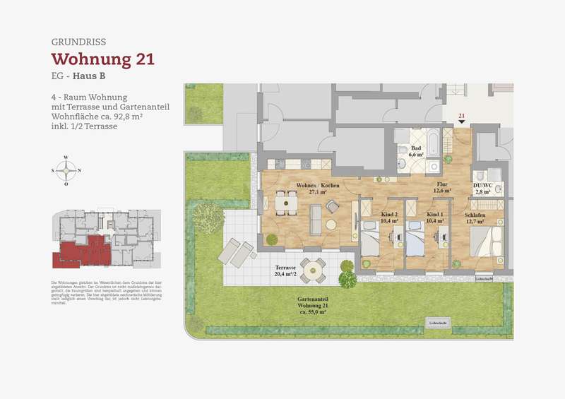 For sale is an ultra-modern first floor apartment (No. 21, House B), which will be completed in 2026. This property is located in a new building and is a first occupancy. It offers a generous living space of around 92.8 m², plus a terrace and a private garden area of 55.00 m². The apartment impresses with its well thought-out room layout, consisting of four rooms, which is ideal for families or couples. Upon entering the apartment, you enter a large, light-flooded living room with floor-to-ceiling windows, which offers seamless access to the terrace. This room is the central point of the apartment and is openly connected to a modern kitchen that is perfectly integrated into the living area. The generous window fronts provide plenty of natural light and a pleasant atmosphere. The master bedroom offers plenty of space and comfort and, like all rooms, is furnished to a high standard. There are two further children's rooms that can be used individually, whether as a children's room, office or guest room. The bathroom is equipped with a bathtub and a floor-to-ceiling shower and thus offers a high level of comfort. There is also a separate guest WC. In terms of fittings, the apartment leaves nothing to be desired: Floor-to-ceiling windows, electric shutters, high-quality ceramic tiles and real wood parquet flooring create an upscale living experience. Underfloor heating and a solar heating system complement the modern heating system and create an efficient and pleasant indoor climate. The apartment has its own cellar compartment and an underground parking space, which ensures convenient parking. An elevator in the stairwell provides barrier-free access and further enhances living comfort. A special feature of this apartment is its direct access to the outside area. The spacious terrace and private garden invite you to linger outdoors and offer space for relaxation and leisure activities. This property is part of a high-quality new-build project that combines modern living with sustainable elements. The central location provides excellent connections to the urban environment and at the same time offers the opportunity to enjoy the amenities of the urban lifestyle to the full. Interested parties have the opportunity to gain an impression of this unique property and to contact us at any time with questions or to arrange a viewing appointment. Completion and occupation are planned for 2026. Don't miss out on this opportunity and secure yourself a home that impresses with its location as well as its features and construction. FROM POLL DRESDEN Henrik Otto (business economist) I henrik.otto@von-poll.com