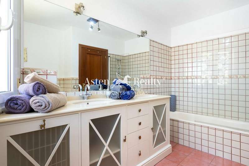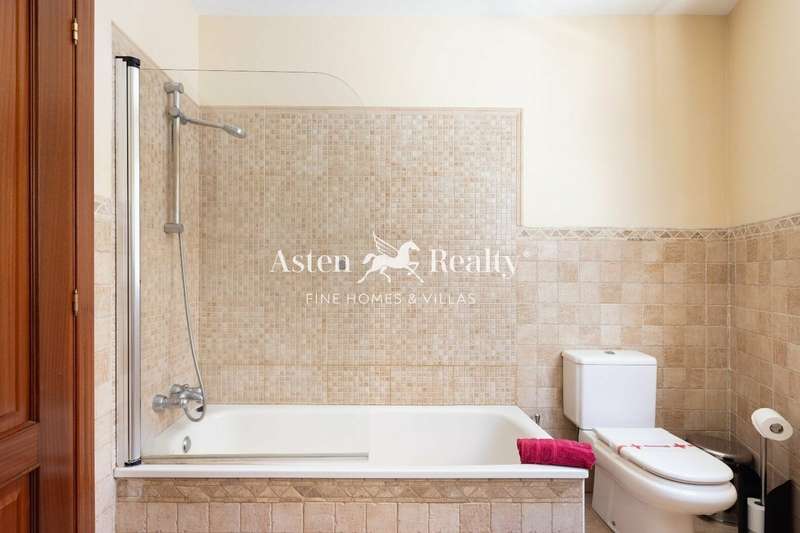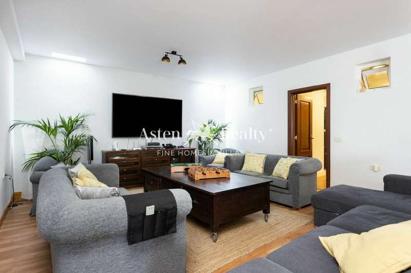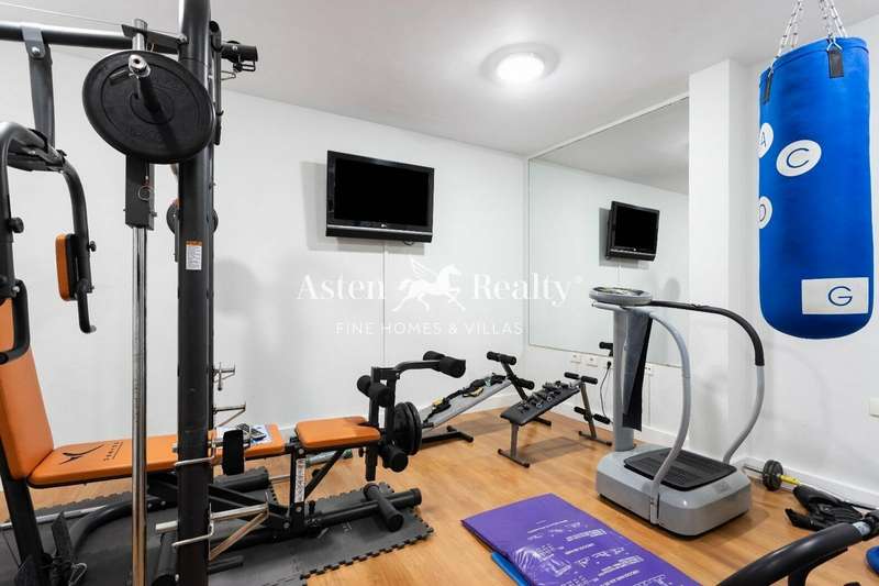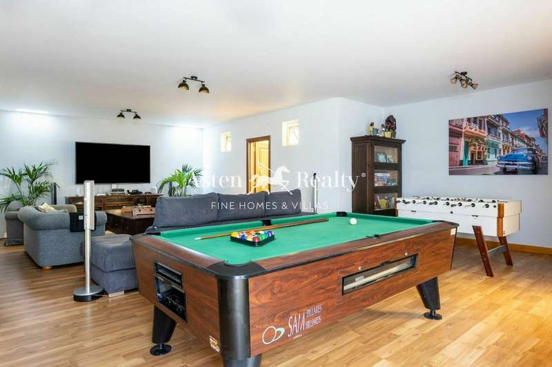 The ground floor showcases a fully renovated basement, complete with a sprawling playroom, home cinema area, gym, and a master suite with a luxurious ensuite bathroom. The garage offers ample parking space for 3-4 cars, while the laundry room and storage areas add to the villa’s practicality and convenience.