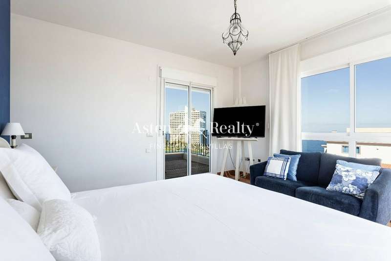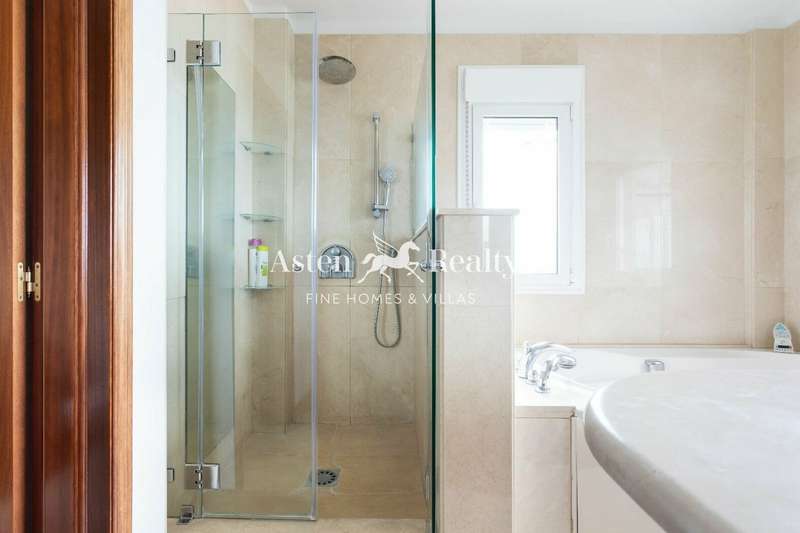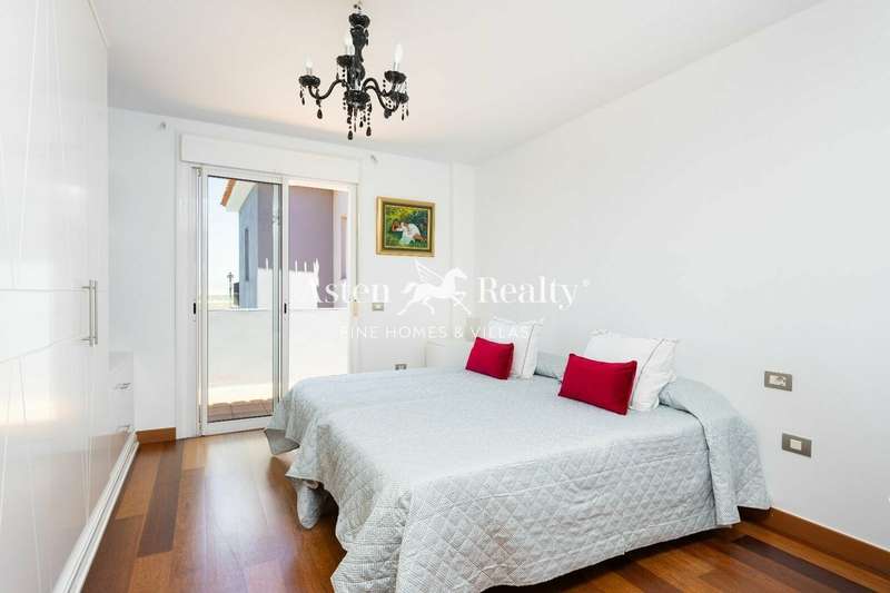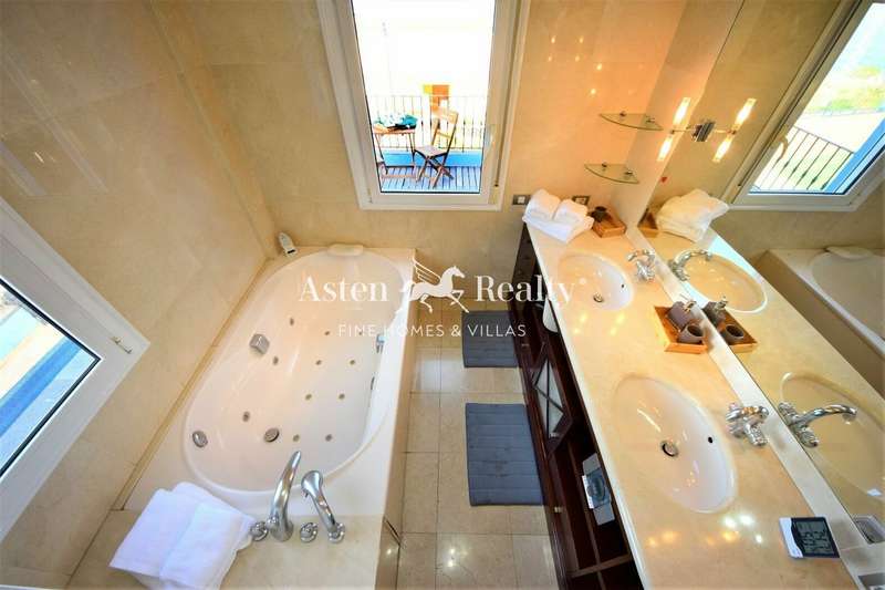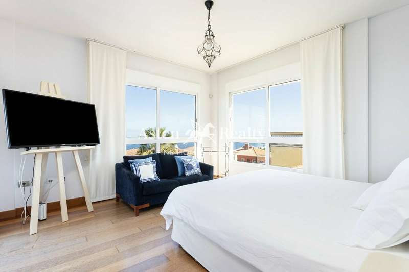 Ascend the elegant staircase to the top floor, where two master suites await, one of which boasts a lavish ensuite bathroom with a jacuzzi, walk-in shower, and a private balcony overlooking the sea. Two additional bedrooms with ample closet space share a generously sized bathroom, perfect for accommodating family or guests.