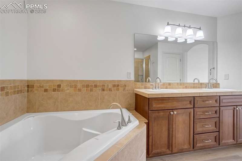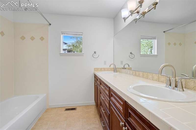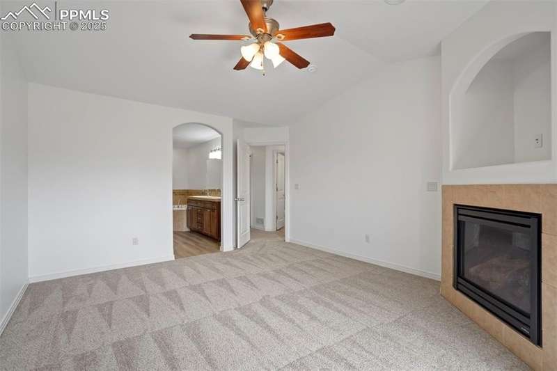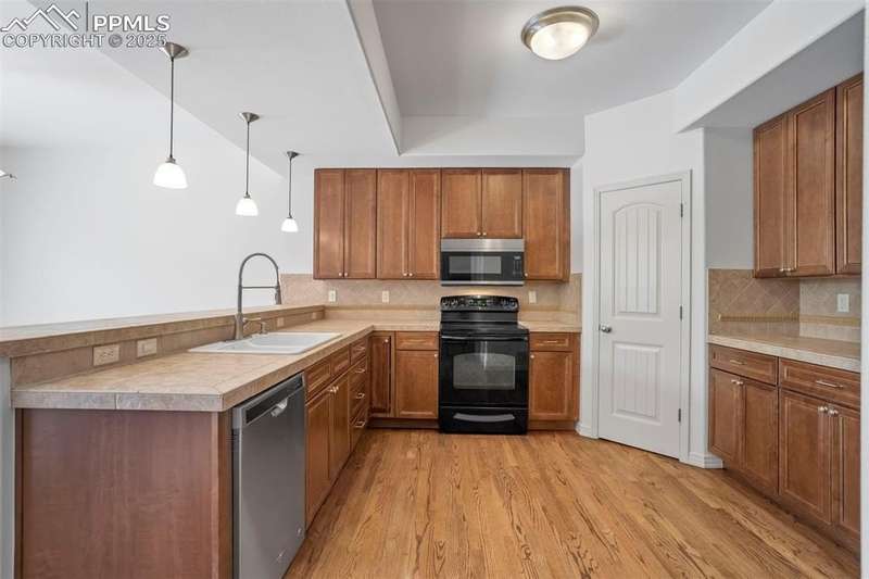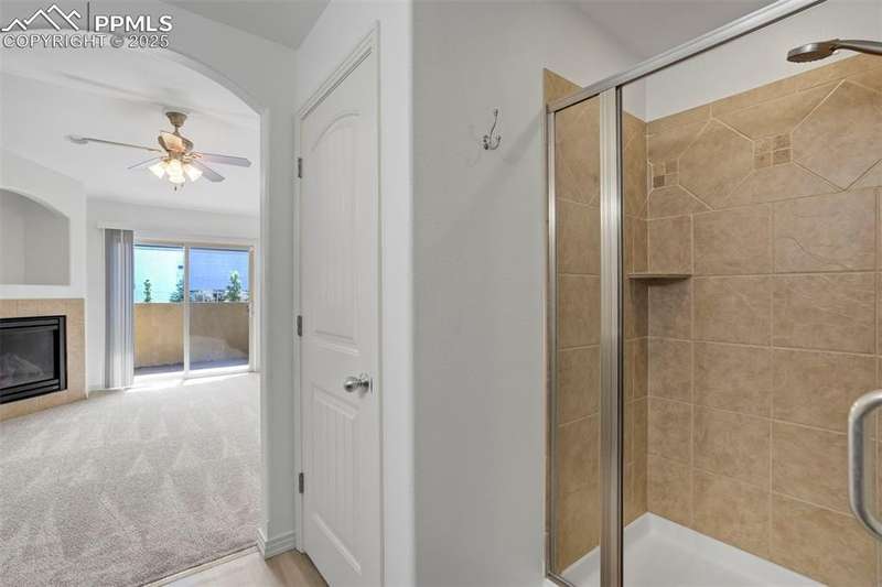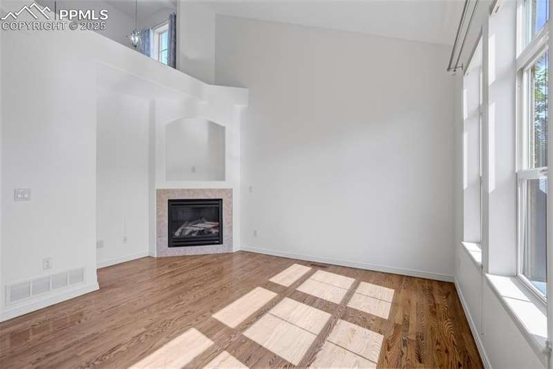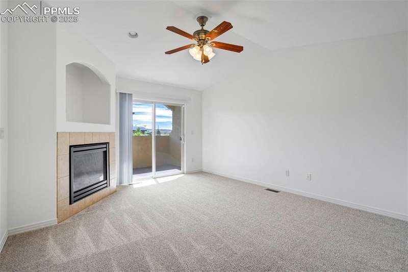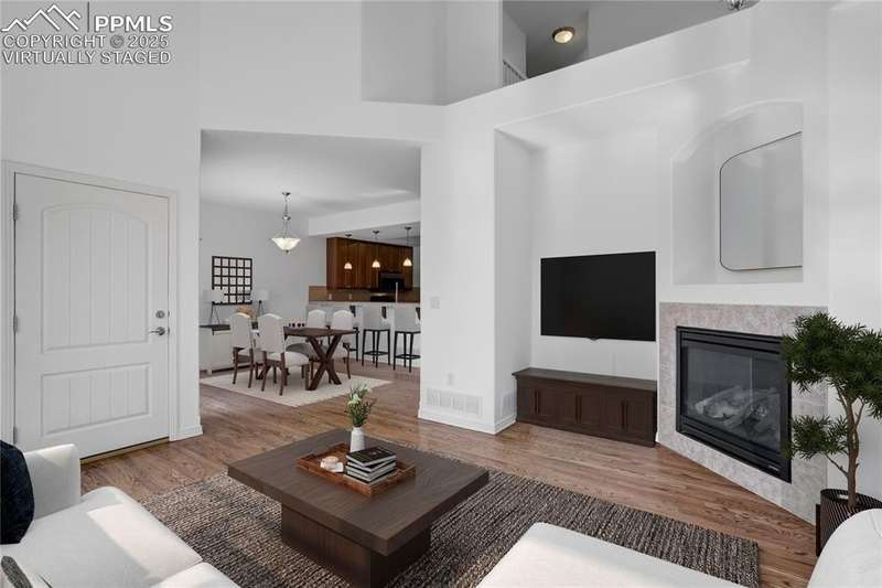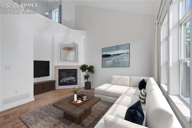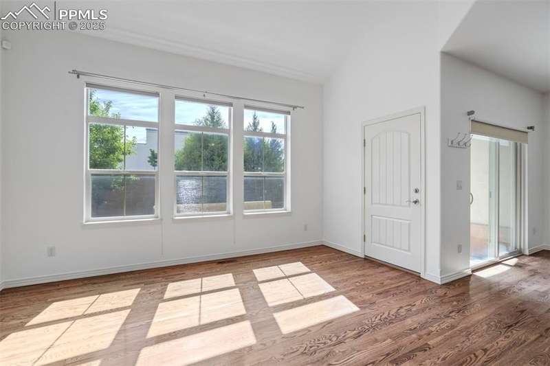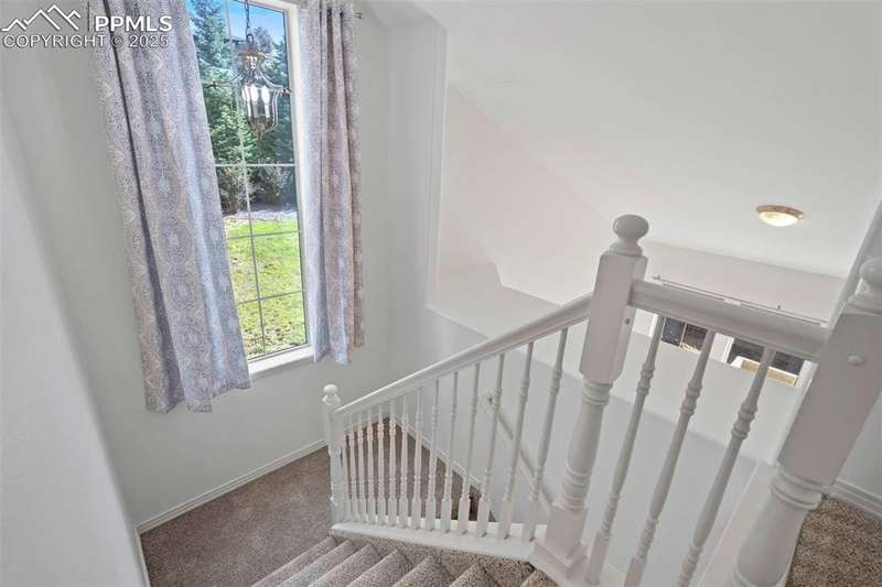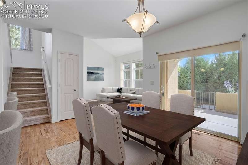 A private gated courtyard framed by evergreens & mature trees invites you in to, this end-unit townhome offers rare year-round privacy in the heart of Northgate. Located walking distance to Loyal Coffee, boutique shops, & all the new entertainment options on the north side of town. Including the Ford Amphitheater, IMAX movie theater, Top Golf, & tons of dining options. This home also provides easy access to D-20 schools, the United States Air Force Academy, & I-25 for quick commuting. Inside, solid oak hardwood floors flow throughout the entire main level, beginning in the vaulted great room anchored by a gas fireplace w/ tile surround & a full wall of windows that flood the space w/ natural light. The open layout leads into a generously sized dining area w/ sliding glass doors that open to the private front patio courtyard—perfect for outdoor dining or morning coffee. The kitchen blends function & style w/ breakfast bar seating, solid wood cabinetry w/ brushed metal pulls, tile backsplash, pendant lighting, pantry, & nearby half bath featuring hardwood flooring & a tile countertop. The main level also includes a spacious laundry/mudroom offering ample cabinet storage, countertop space for folding, a sink, & access to the oversized two-car attached garage. Upstairs, all-new carpet sets the tone for a refreshed upper level. The vaulted primary suite includes a ceiling fan, gas fireplace, & private covered balcony w/ Trex decking & views of the natural landscape. The adjoining 5pc bath has an oversized soaking tub, dual vanities, & new LVP flooring. Two additional upper-level bedrooms enjoy mountain views—one is oversized—& both share easy access to hallway bath complete w/ a double vanity & tiled tub/shower surround. Additional highlights include central A/C, energy-efficient windows, high-speed internet, & low-maintenance living w/ HOA-managed exterior care. This home is a must-see.