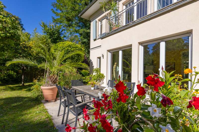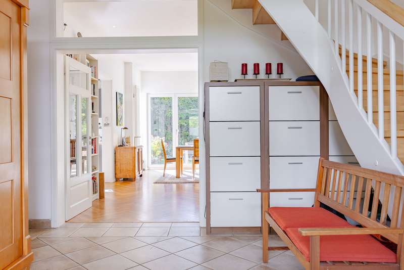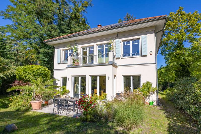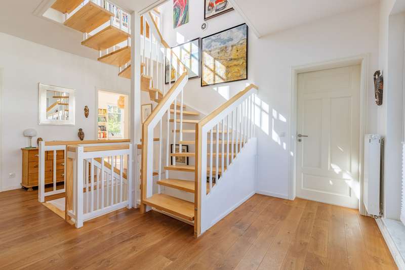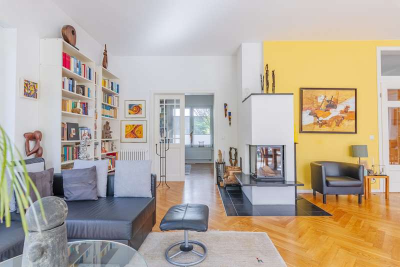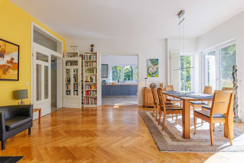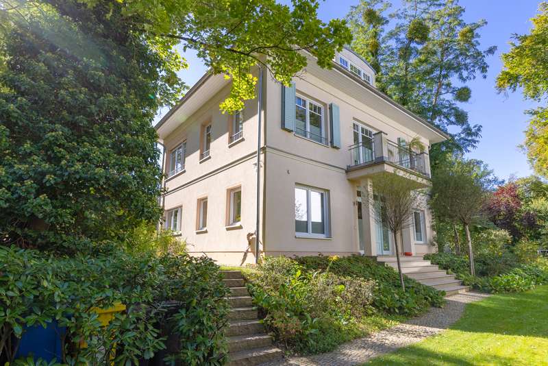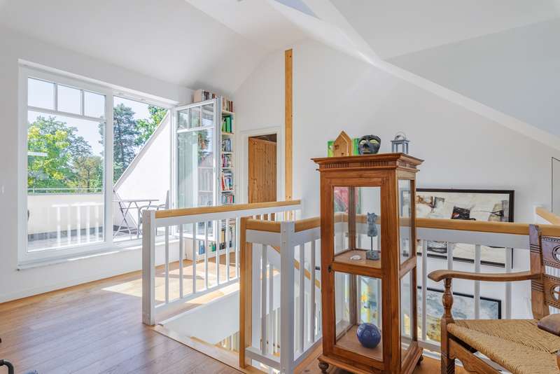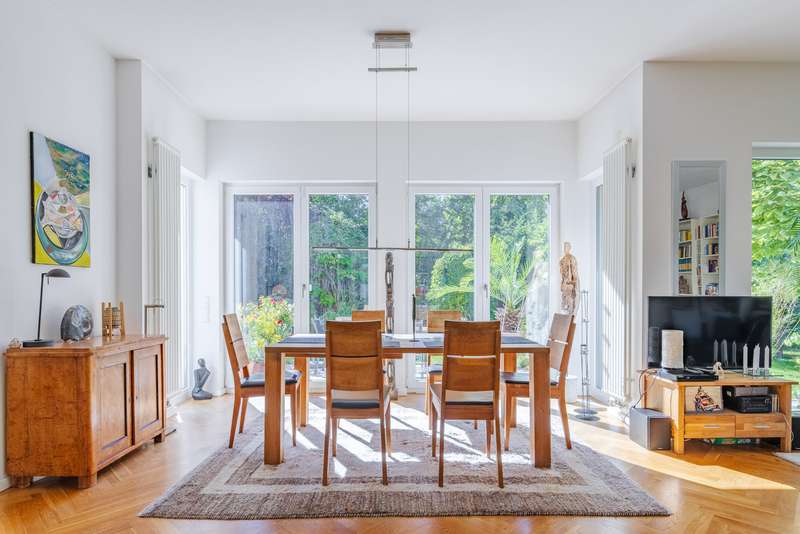 This detached house from 2011 in a sought-after residential area in the Babelsberg villa colony, close to Lake Griebnitzsee, impresses with its well thought-out layout and a total living space of approx. 241 m². The lovingly landscaped plot has a size of approx. 963 m². With its high-quality fittings and energy-efficient concept, this very well-maintained property fulfills sophisticated living requirements in a prestigious residential environment. The house impresses as soon as you enter with its open, light-flooded architecture. High ceilings (approx. 2.95 m on the first floor and approx. 2.80 m on the upper floor) emphasize the spacious feeling of living. The living area with floor-to-ceiling windows, modern parquet flooring and a fireplace provides the ideal focal point for social gatherings or relaxing hours. The open-plan kitchen with SIEMATIC fitted kitchen is directly adjacent to the dining area and has its own terrace access. The 6.5 rooms are spread over a total of three levels and allow for individual usage concepts. There are a total of three bedrooms, a small guest room and two bathrooms. The fully developed top floor offers further scope for the ideas of a future user. This area is currently designed as an open studio. In addition to two storage rooms, there is a sauna area with shower and access to the interior roof terrace. The triple-glazed windows, some of which are fitted with electric blinds, and a pre-installed alarm system offer a high standard of security. The sustainable building services include a modern central heating system, supported by a solar heating system, ensuring excellent energy efficiency values. The ventilation system ensures a pleasant indoor climate all year round. The outdoor area boasts a lovingly landscaped garden with a large south-west-facing garden terrace. A separate tool shed offers additional storage space for garden utensils. There is space to park up to 2 cars on the property. The parking spaces are unpaved. The location impresses with its high residential value: shopping facilities, schools and Lake Griebnitzsee are within easy reach. Thanks to good connections to Berlin city center via the freeway and S-Bahn, both urban life and the surrounding nature can be reached quickly. The surrounding area is considered very upmarket - the neighborhood is characterized by some magnificent villas. This detached single-family home combines high quality fittings, contemporary technology and well thought-out architecture on an exceptionally attractive plot - a property that meets current and future demands for modern living in every respect.