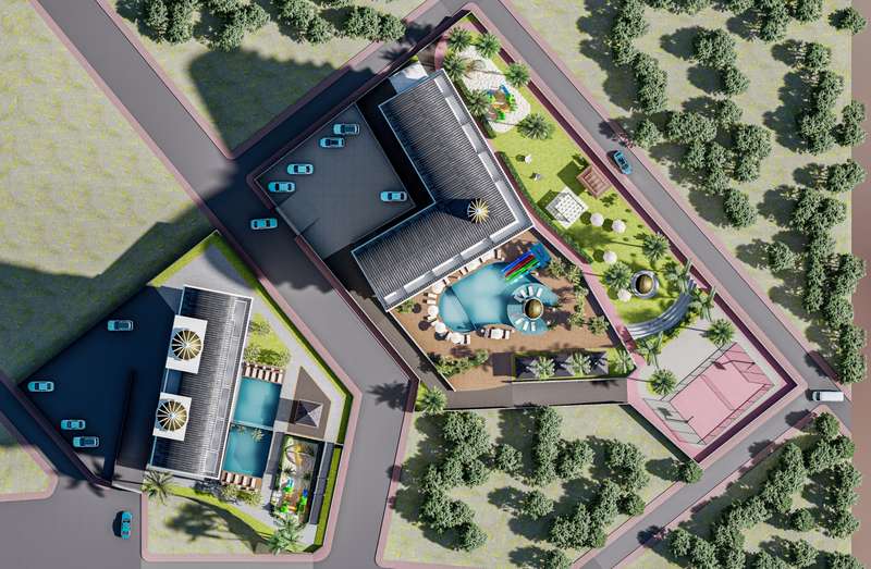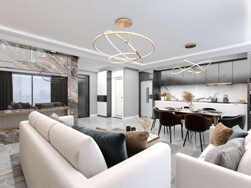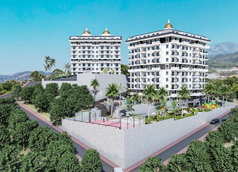 The flats for sale in Alanya, Turkey are situated in a 10-storey block. The project offers various amenities for the residents. Inside the complex, there is an outdoor swimming pool, aqua park, sunbathing areas, gazebos, barbeque areas, a sauna, a fitness center, a shock pool, and game rooms for adults and children. Additionally, the project is enriched with indoor parking, generators, security cameras, satellite TVs, and a lift.