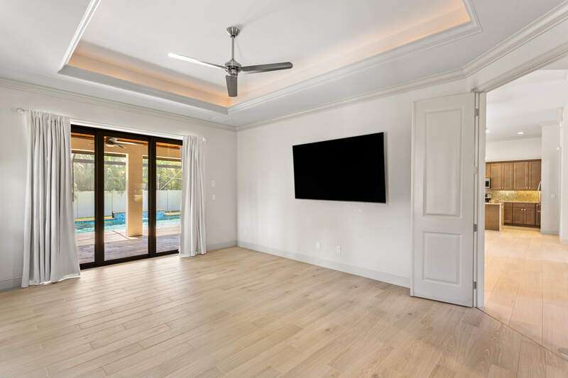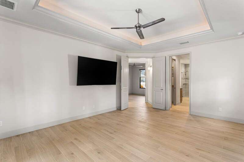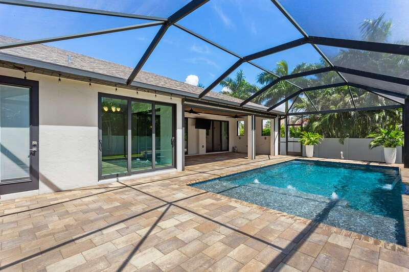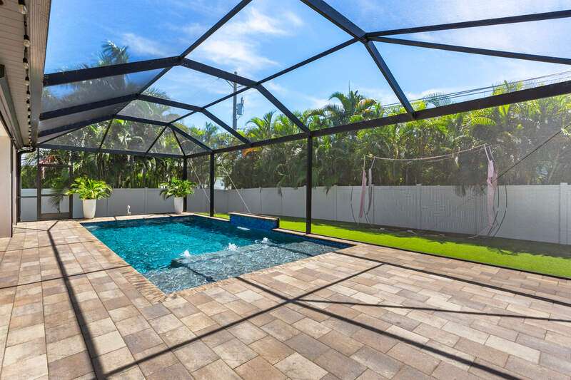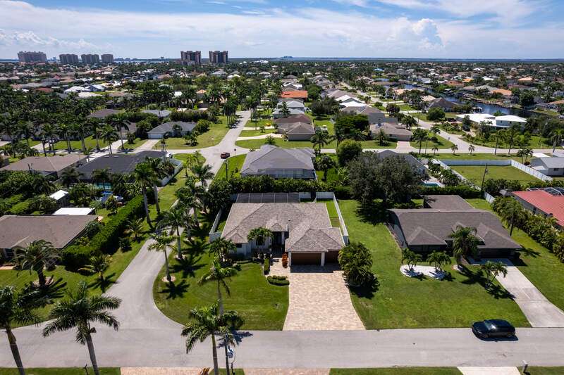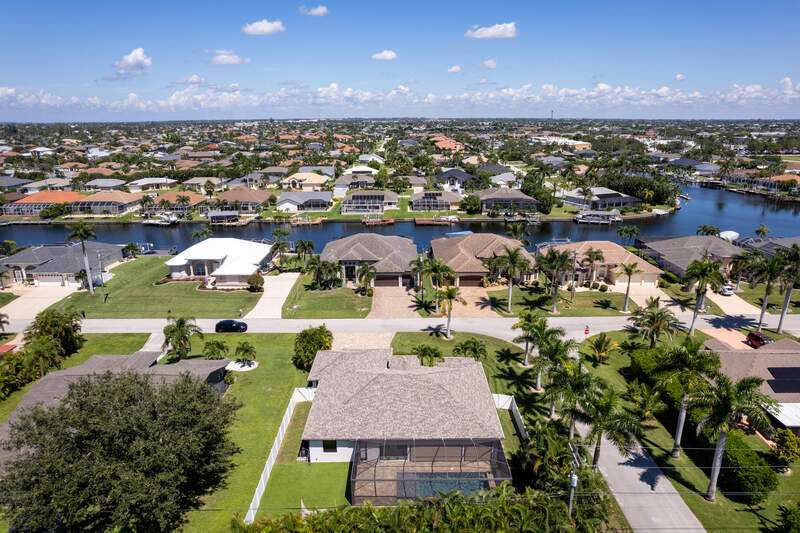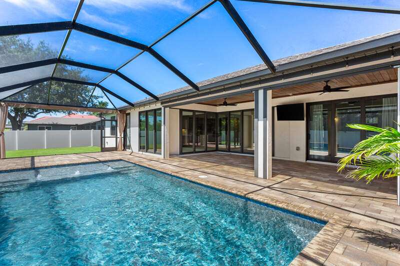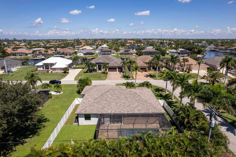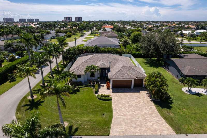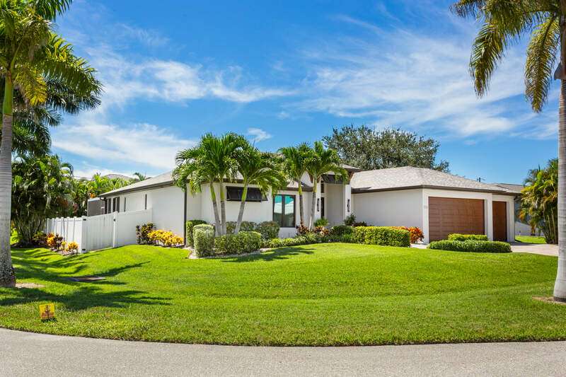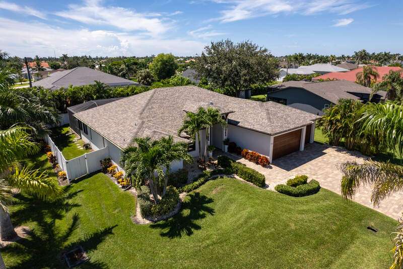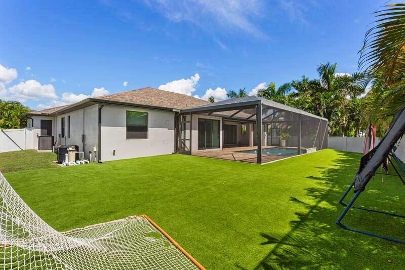 Located in the sought-after Southwest Cape Coral area, this stunning 3-bedroom + den, 3-bath home sits on an oversized corner lot with desirable Southern exposure. Designed for both comfort and style, this home features an open floor plan with soaring ceilings, elegant tray ceilings, and crown molding throughout-perfect for entertaining or relaxed living. Step outside to your private backyard oasis with a heated pool, sun shelf, tranquil water features, and a luxurious PebbleTec finish-ideal for enjoying Florida's year-round sunshine. The heart of the home is the chef-inspired kitchen, boasting quartz countertops, a large waterfall island, custom cabinetry, and premium stainless steel appliances. Impact windows and doors throughout and automatic hurricane shutters for the lania. Barkyard is partially turfed, perfect for outdoor activities. No expenses spared in this meticulous home. Conveniently located just minutes from Cape Harbour, top-rated restaurants, shopping, schools, and beautiful parks, this home offers the perfect blend of convenience and tranquility. Whether you're seeking a year-round residence or a luxurious winter retreat, this property is an exceptional opportunity in one of Cape Coral's most desirable neighborhoods.