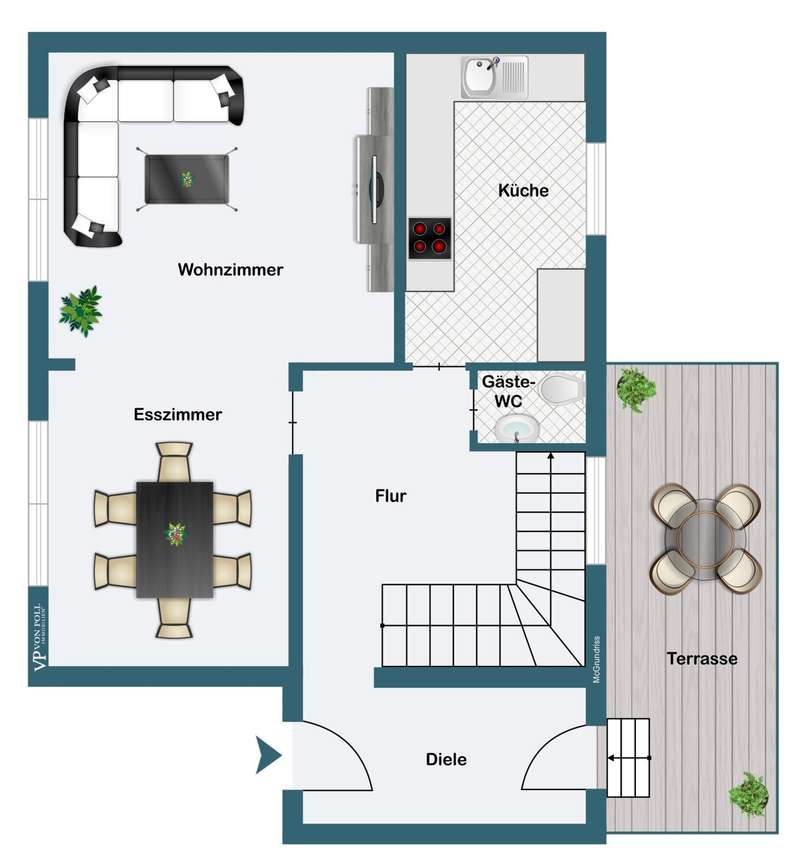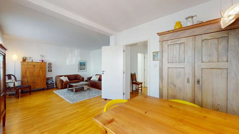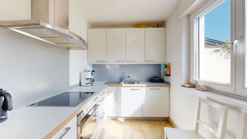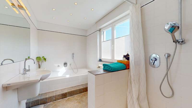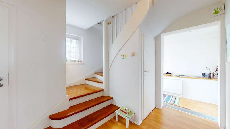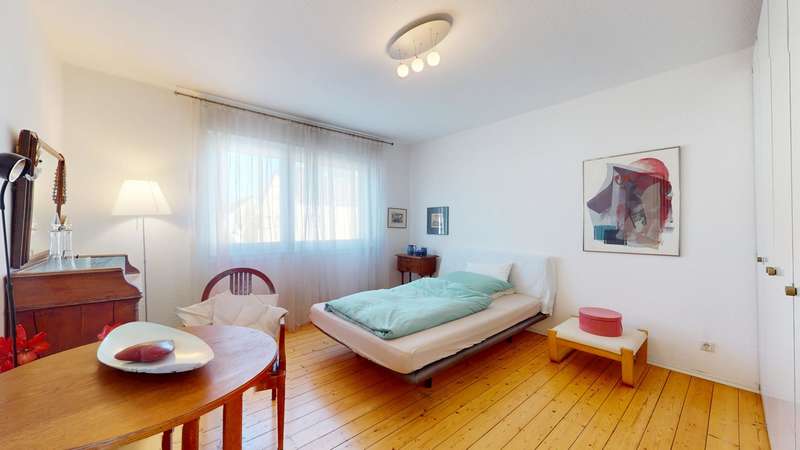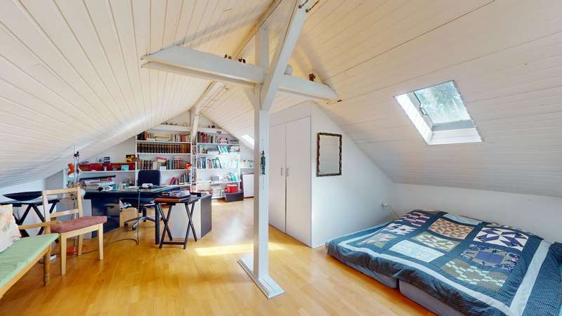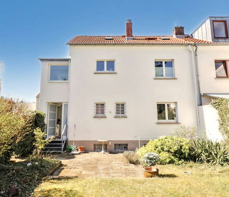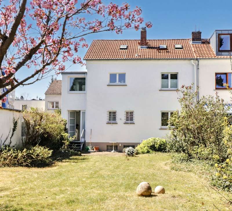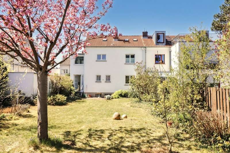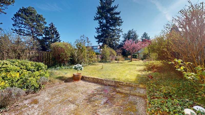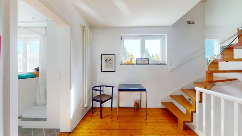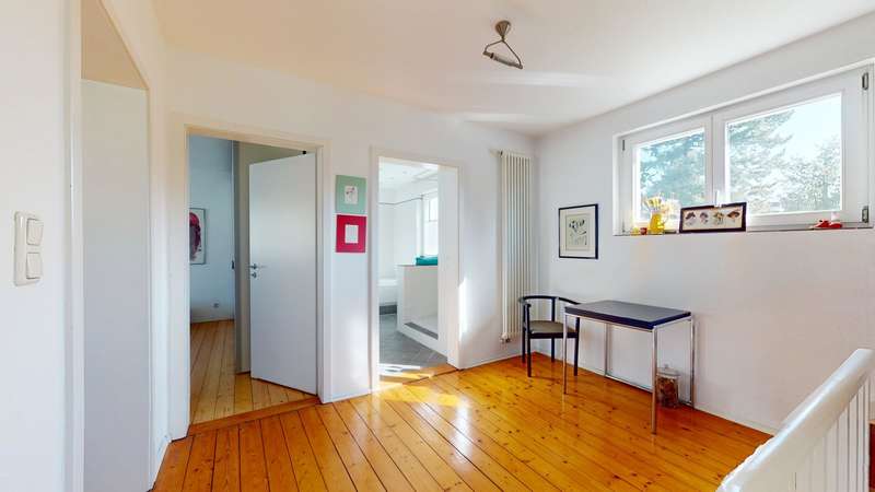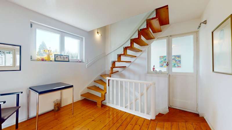 Stylish semi-detached house with charm - lovingly renovated on a spacious, sunny plot. This charming semi-detached house, dating from 1932, combines the character of times gone by with homely comfort. The property was extensively renovated around 20 years ago and has been carefully maintained ever since - a home with history that is ready for a new chapter. From the first floor, you have direct access to the terrace and on to the spacious garden - perfect for relaxing or socializing outdoors. The approximately 620 m² plot is a real highlight: a beautiful, large garden facing south-east, lovingly landscaped and ideal for anyone who wants to enjoy life in the countryside. Many things are possible here, from an arbor with a barbecue station, to gardening with fruit and vegetables, to a private pool for the children or a summer party - there is more than enough space. With around 142 m² of living space and a total of six rooms, the house offers a well thought-out and versatile room layout: On the first floor, you are greeted by a spacious entrance hall with plenty of charm. The open-plan living/dining area creates a bright, friendly ambience. Parquet flooring has been laid throughout the basement, emphasizing the homely feel. The kitchen is equipped with a well-kept fitted kitchen from 2003. The floor is still covered with original Solnhofen tiles. A guest WC completes the space on this level. A special highlight is the beautiful, original staircase with a stylish stairway. The path from the first floor to the upper floor leads over old, well-preserved floorboards, which give the house a special atmosphere. On the second floor you will find a large bedroom and a children's room, a spacious daylight bathroom with bathtub and shower as well as a charming veranda/conservatory with a view of the greenery. The original wooden floorboards have been carefully restored throughout the upper floor. The top floor has been fully converted and offers a spacious studio with approx. 27 m² of living space - ideal as a bedroom, studio, home office or cozy retreat. The conversion was carried out in the 1970s and 2000s, but a building permit in accordance with current standards is required to carry out any extensions (windows, dormers, etc.). Wooden windows are installed throughout the house, which perfectly match the old building flair. Roller shutters on all windows provide privacy and comfort. There is a garage for your vehicles and two parking spaces in front of it - practical and convenient for everyday life. This semi-detached house can be extended due to the development plan and the existing neighboring buildings - for example with an extension, additional large windows in the roof and dormers. This offers attractive potential for additional living space. All in all, you have a lovingly renovated home with history, charm and a garden that will delight you.
