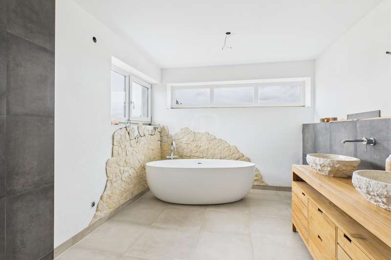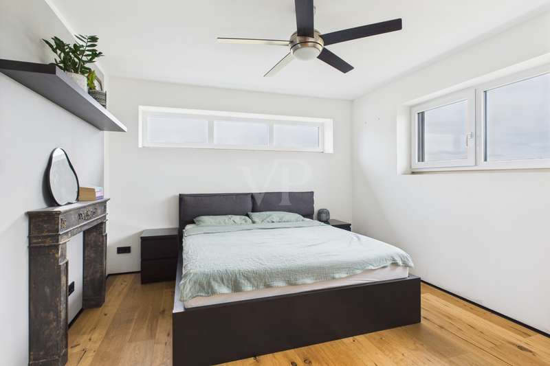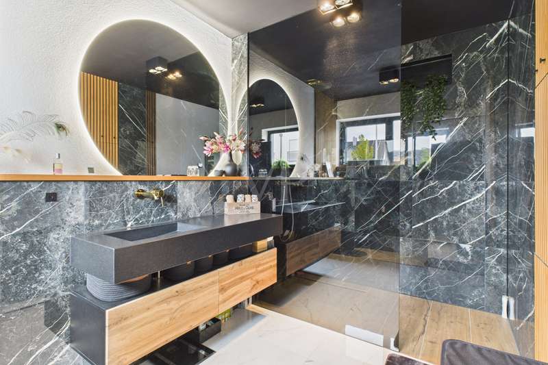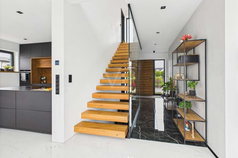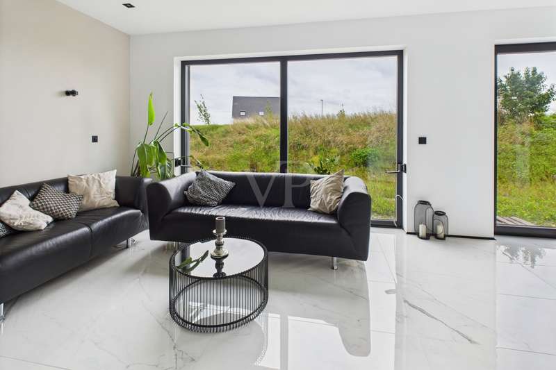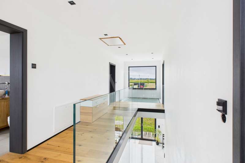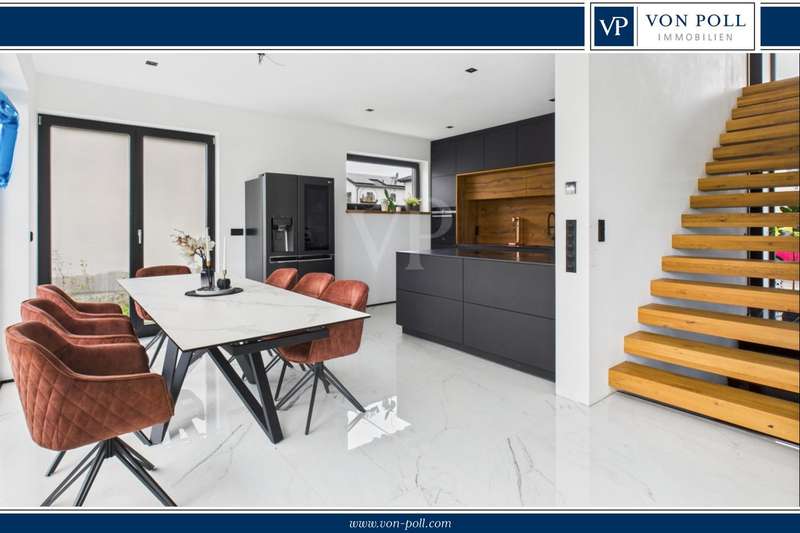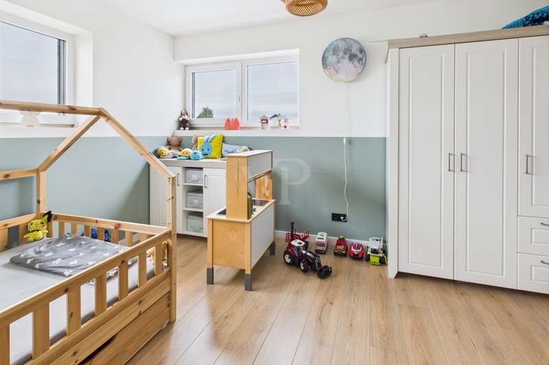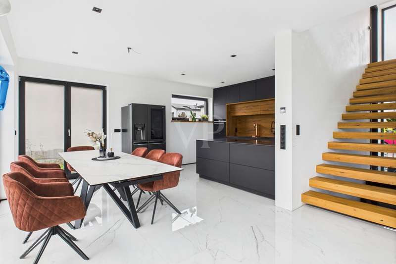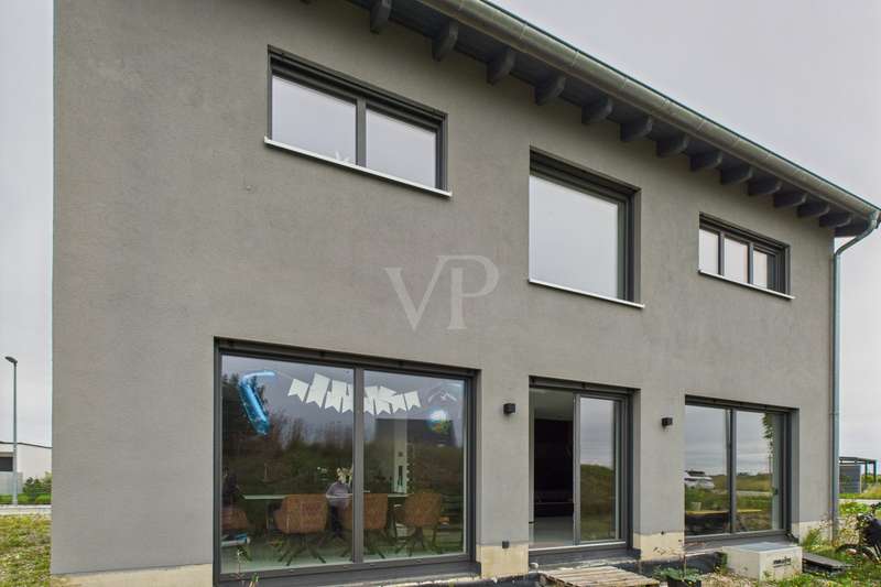 This modern detached house was built in 2020 in solid construction on a spacious plot of approx. 592 m². With a well thought-out room layout and high-quality furnishings, this house meets the demands of contemporary and comfortable living. As soon as you enter the house, the spacious layout is striking. The open-plan living/dining area forms the heart of the property and impresses with its large floor-to-ceiling windows, which create a bright and friendly ambience. From here, you have direct access to the garden, which you can still design individually and which opens up a wide range of possible uses. The modern fitted kitchen is directly adjacent to the dining/living area and is equipped with all high-quality appliances. Functionality and attractive design go hand in hand here, making cooking and enjoyment a pleasure. A total of five well-designed rooms are available. The master bedroom offers a comfortable retreat and also scores points with a separate dressing room. Three further bedrooms allow individual usage options - whether as a children's room, office or guest room, you remain flexible. Two stylishly designed bathrooms are equipped with selected design elements and impress with contemporary fittings and high-quality materials. Another highlight of this property is the extensive technical equipment: the energy-efficient underfloor heating ensures comfortable temperatures and a pleasant indoor climate throughout the house, including the basement. The basement also contains a further guest room with dressing room as well as two rooms and the boiler room with laundry room. The fittings are of a high quality overall: modern floor coverings, attractive details in the bathrooms and a stylish staircase round off the overall picture. Thanks to the well thought-out construction and the as-new condition of the house, you benefit from low maintenance costs as well as excellent energy efficiency. This detached house impresses with an excellent combination of living comfort, spacious areas and modern fittings - a property that offers its future residents a comfortable home. Contact us to arrange a viewing and see for yourself.