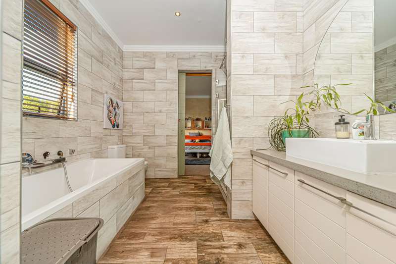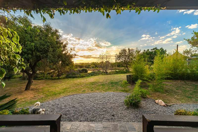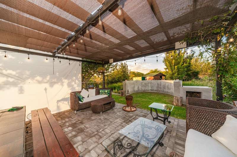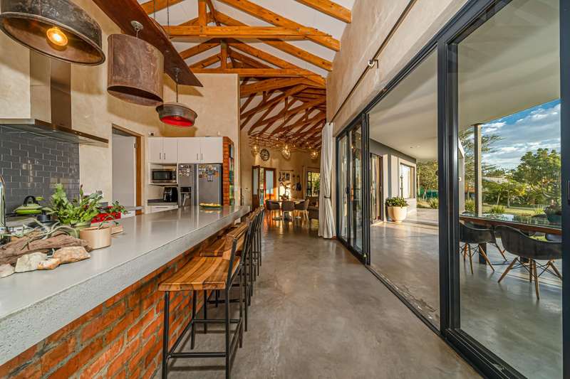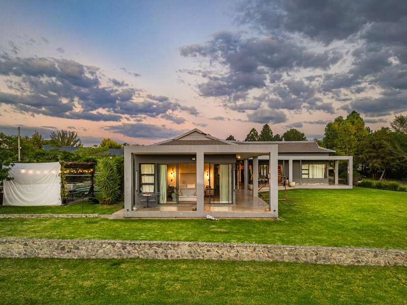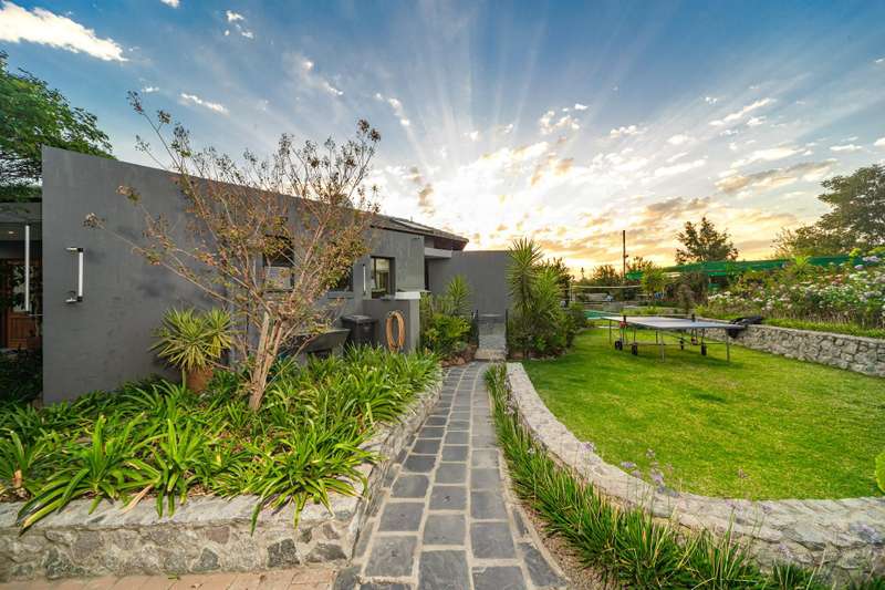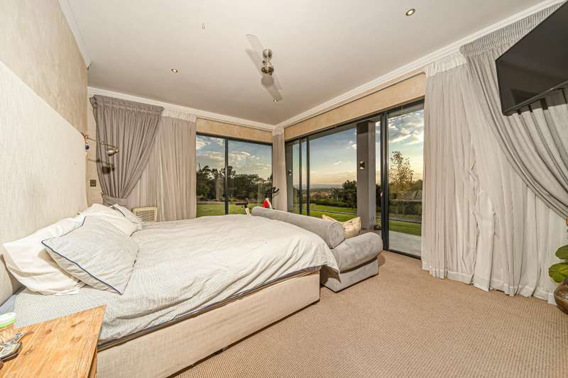 The main house, a masterpiece of architectural design, features four generously sized bedrooms and three well-appointed bathrooms. The master suite is a true retreat, complete with an outdoor shower that allows one to commune with nature in complete privacy. The heart of the home is the stunning open plan kitchen equipped with modern amenities and a convenient scullery. Adjacent to the kitchen, the dining room serves as a gathering point for family meals, flowing seamlessly into a cozy TV room. The lounge is a haven of relaxation, boasting a charming fireplace that adds warmth and character to the space. For the entertainer, a covered patio provides the perfect backdrop for gatherings, offering breathtaking sunset views that make every event memorable.