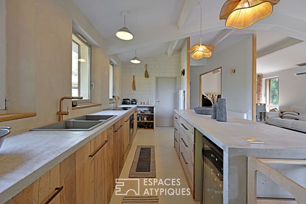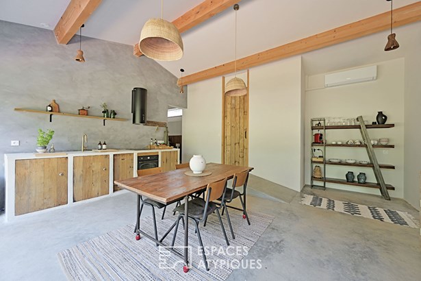 The first house, with a surface area of 139m2 on one level, offers a beautiful living room-kitchen area decorated with a wood stove and benefiting from a pleasant feeling of volume generated by beautiful high ceilings.