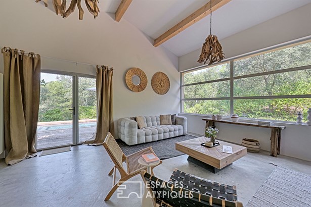 The living room opens onto a sun-drenched terrace, where the heated pool invites you to relax overlooking the garden. Further on, a summer shower is cleverly hidden among the lush vegetation. Here, a decidedly Balinese atmosphere reigns.